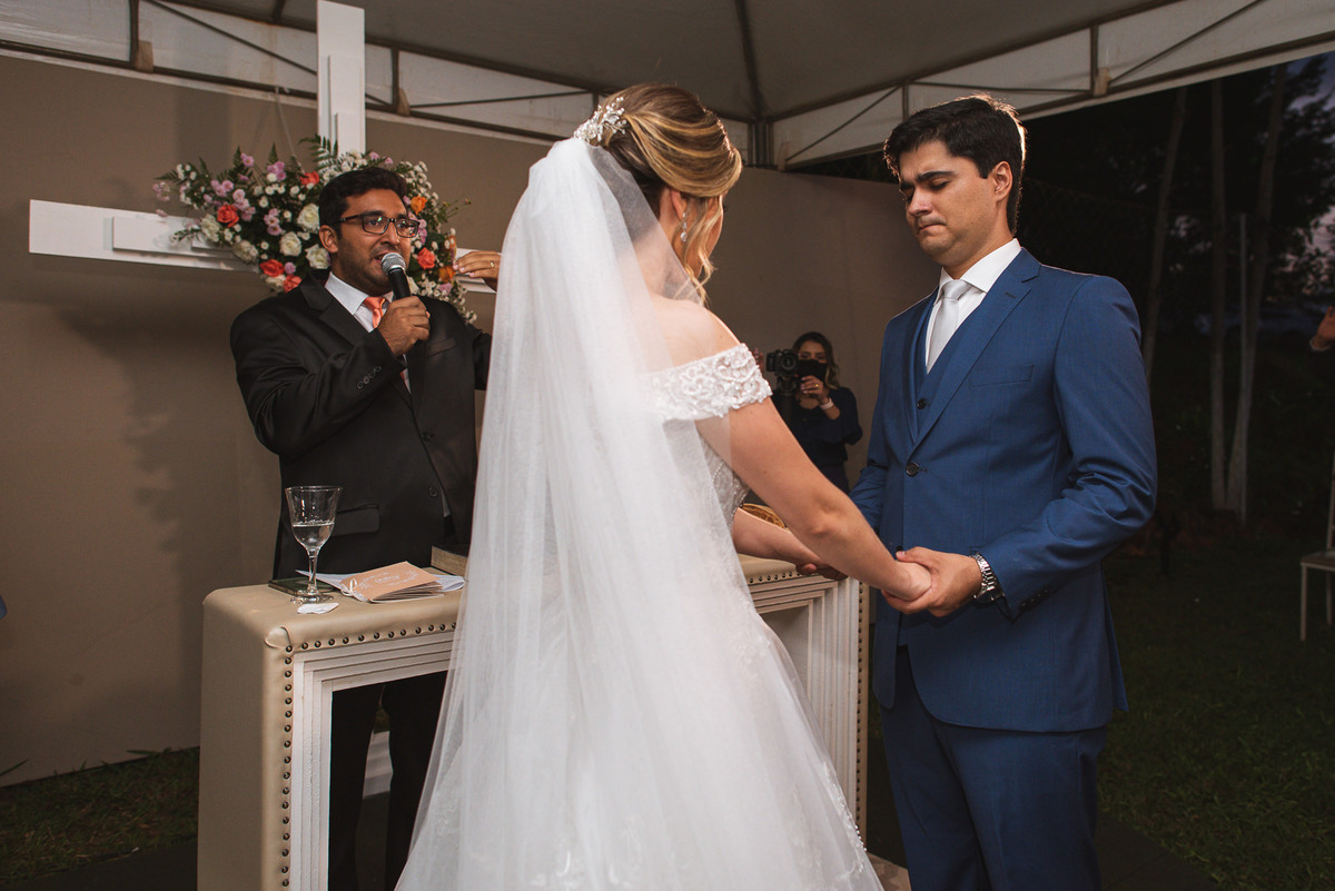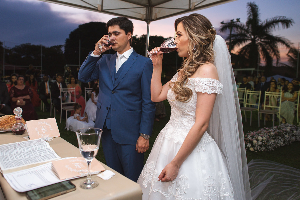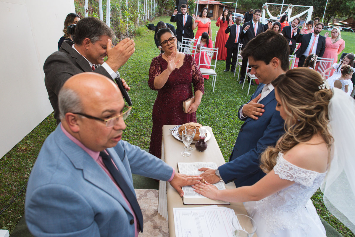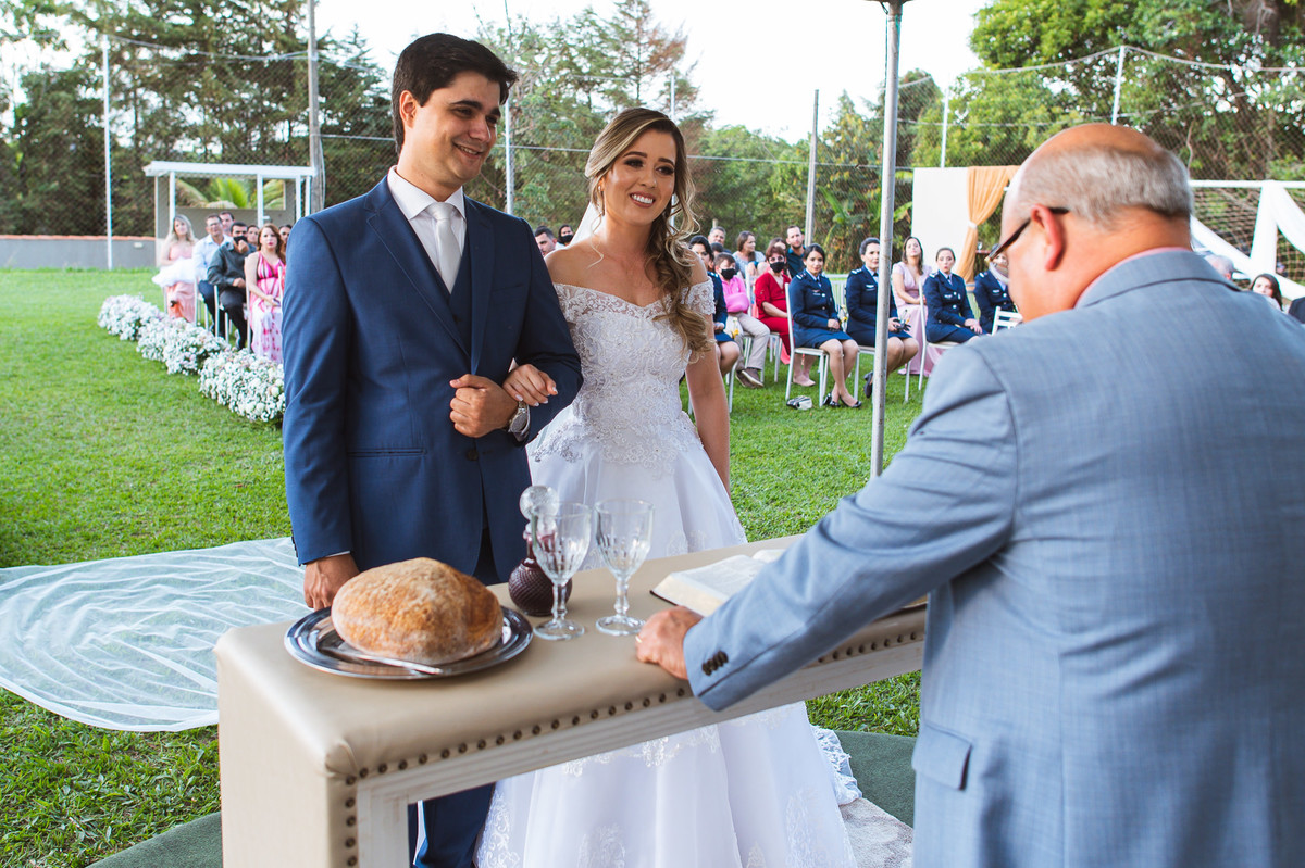 Agora, depois de um respeitoso beijo na testa, Wilton e Isabela caminharam juntos para receber a bênção de Deus sobre o casamento dos dois. Seus pastores revezaram para celebrar o casamento, abençoar e também celebrar a Santa Ceia para os noivos. Esse momento foi lindo também! O momento de se alimentar do Pão e do Vinho que representavam ali o corpo e o sangue de Cristo. Temos que destacar também a entrada das alianças. Adivinha quem trouxe as alianças para os noivos? Sim, a Mel. Ela entrou acelerada e super sorridente e trouxe para os seus papais as alianças. Após essa celebração, os noivos enfim foram declarados casados perante Deus e puderam finalmente selar a união com o primeiro beijo depois de 5 anos de união. Agora casados, os noivos saíram rumo à recepção com a Guarda de Honra da Aeronáutica fazendo o "teto de aço" para os noivos passarem. Assim, partimos para a festa.