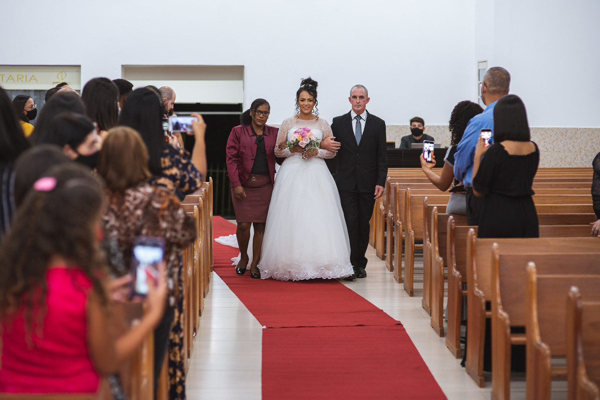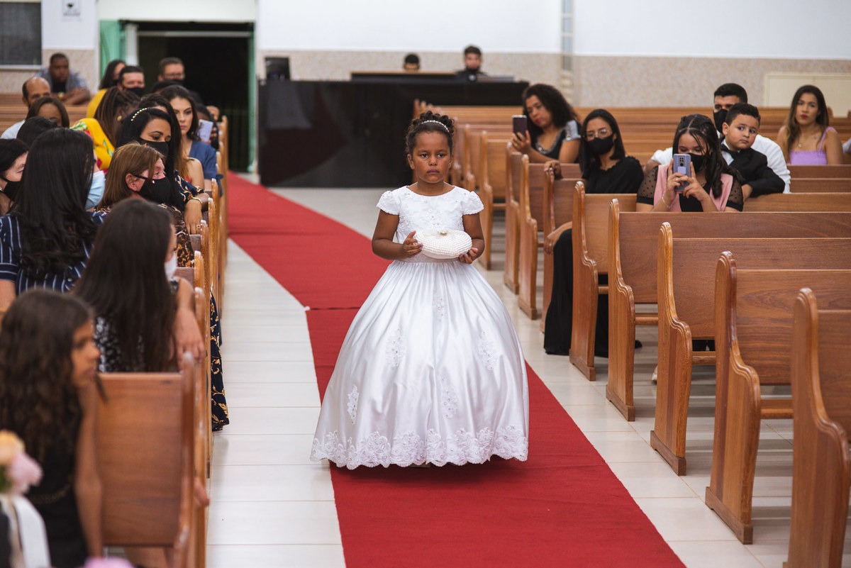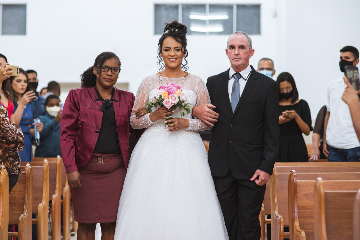 Com tudo pronto, a noiva já no carro aguardando, a cerimônia teve seu início. Os padrinhos, o noivo, os pajens e os convidados já estavam dentro da Igreja. Só faltava a estrela principal do dia: Lorena! Depois de receber um beijo de seu pai, ela caminhou junto com ele e de braços dados com sua mãe rumo ao altar. Da porta, já era possível ver o sorriso de Gabriel que aguardava ansiosamente por aquele momento.
