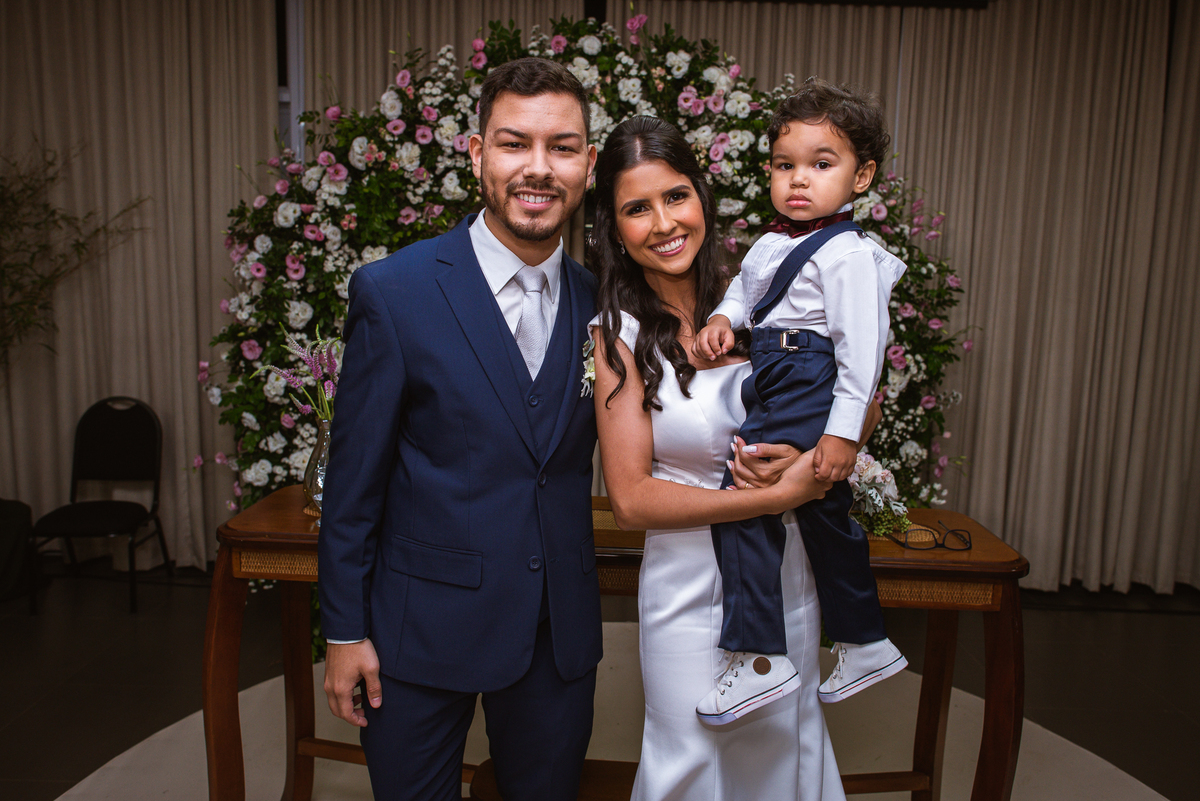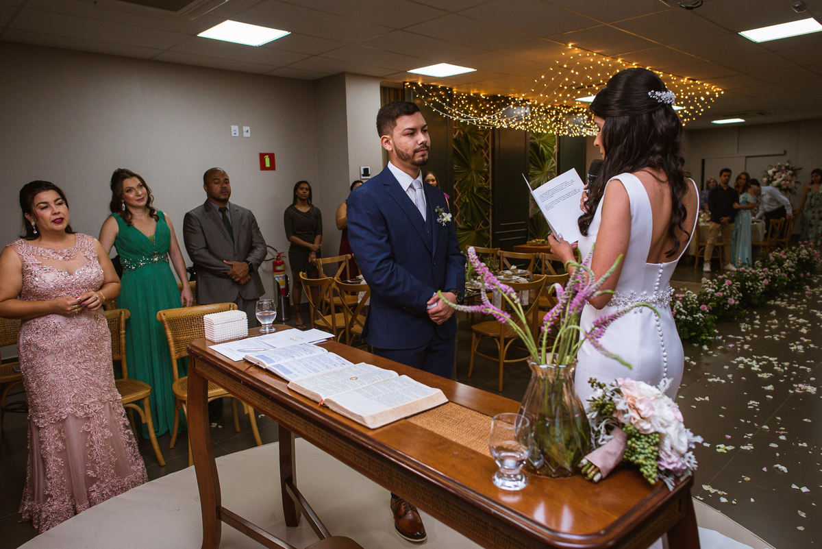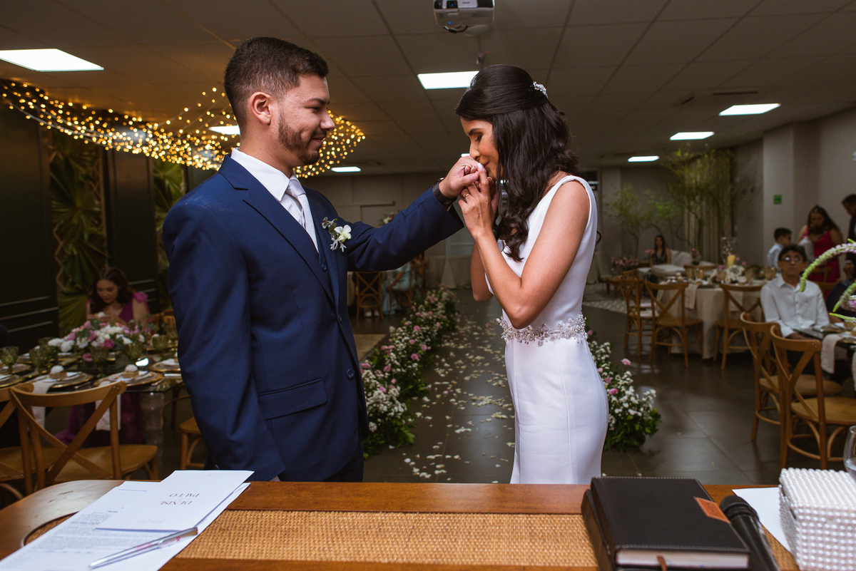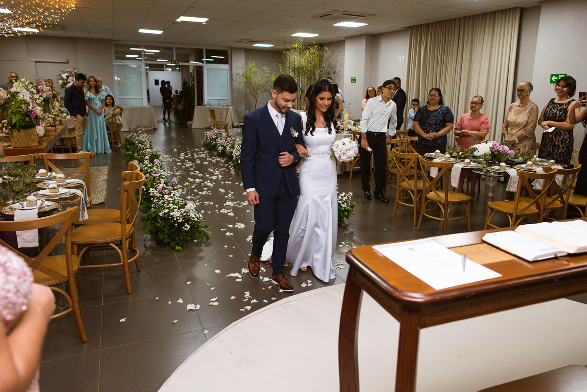 Denise despediu de seus pais e Paulo recebeu sua noiva. Diante de todos, ele a beijou carinhosamente e caminharam juntos rumo à bênção. O celebrante foi o pai do noivo, que é Pastor. Com uma palavra muito cativante, ele fez questão de ressaltar tudo o que o casamento representa. Depois dessa palavra abençoada, a entrada das alianças foi anunciada. E advinha quem as trouxe? Sim, o sobrinho da noiva. Matteo trouxe as alianças para o casal e arrancou sorrisos de todos que assistiam aquela cena. Esse momento foi lindo demais!