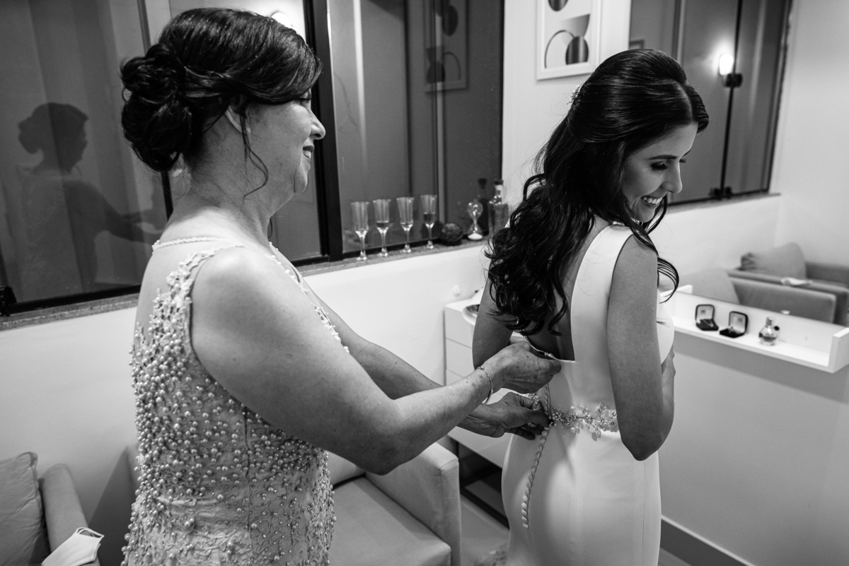 Assim que terminamos a sessão de fotos com o irmão e o papai do noivo, eu parti para o making of da noivinha Denise. Chegando no novíssimo espaço de César Paulista, Denise estava sendo produzida pela maquiadora Mariana Nascentes. Em meio a sorrisos e uma tranquilidade incrível, a noiva estava acompanhada de suas madrinhas, a irmã Léia e posteriormente sua mamãe. Ela optou por uma make bem suave e natural e fez um penteado lindo, com adereços assinados pela Julia Laços. O vestido? Não poderia ter sido feito por mãos mais talentosas do que as de Mírian Brandão. Feito sob encomenda para Denise, o vestido maravilhoso estava lá no cantinho aguardando para brilhar junto com a noiva.