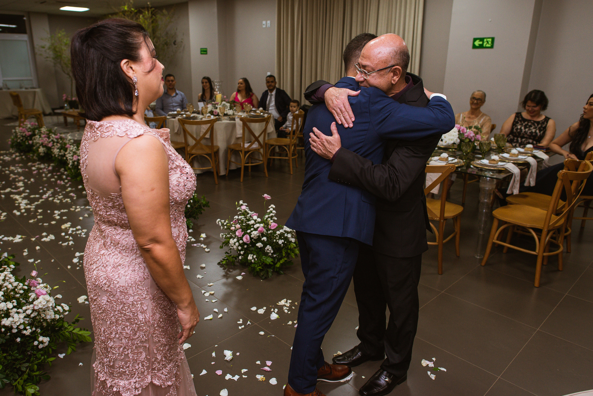 A cerimônia teve seu início com a entrada de Paulo juntamente com seus pais. Foi um momento muito emocionante. Ver ele se despedir dos seus pais me fez pensar quando eu for casar meu filho. Por alguns segundos eu fiquei muito emocionado. Depois de um abraço apertado pude ouvir de seu pai "Deus te abençoe meu filho". Logo depois foi a vez da mãe do noivo se despedir dele. Visivelmente emocionada e tentando de todas as formas não chorar, Viviane o abraçou apertadamente e se despediu do seu primogênito.