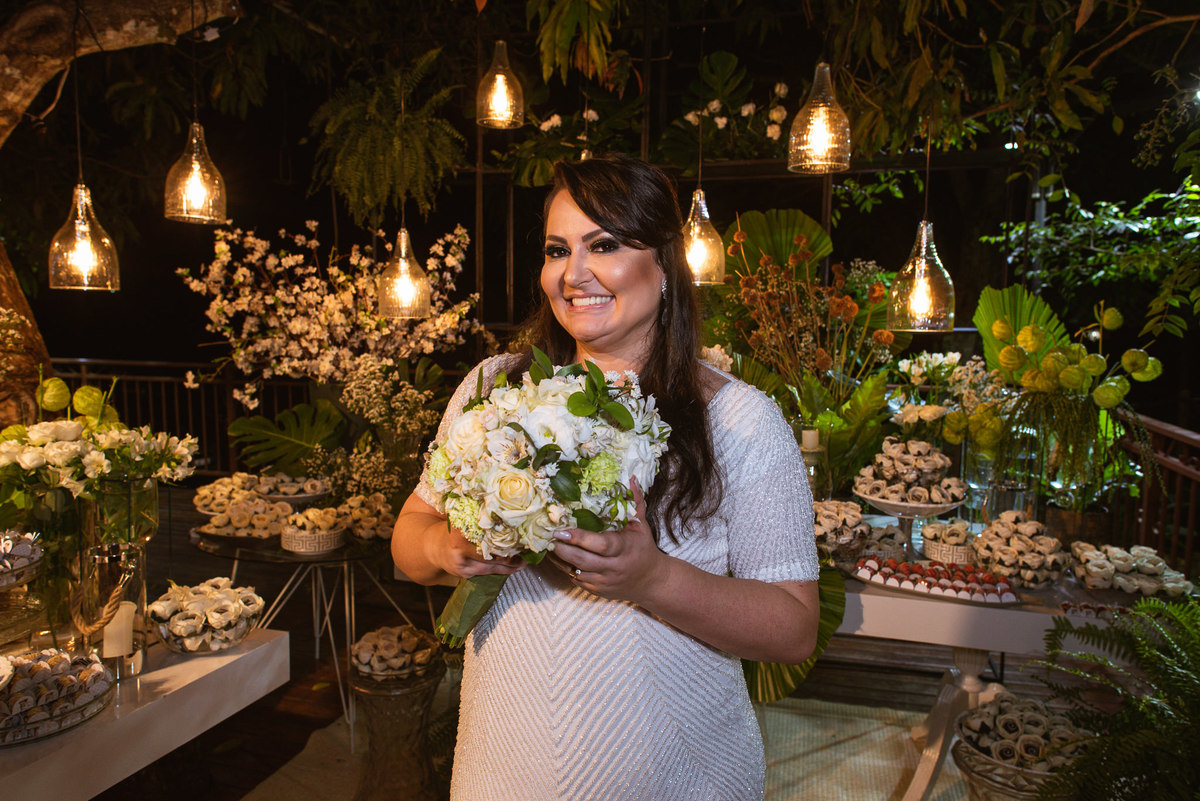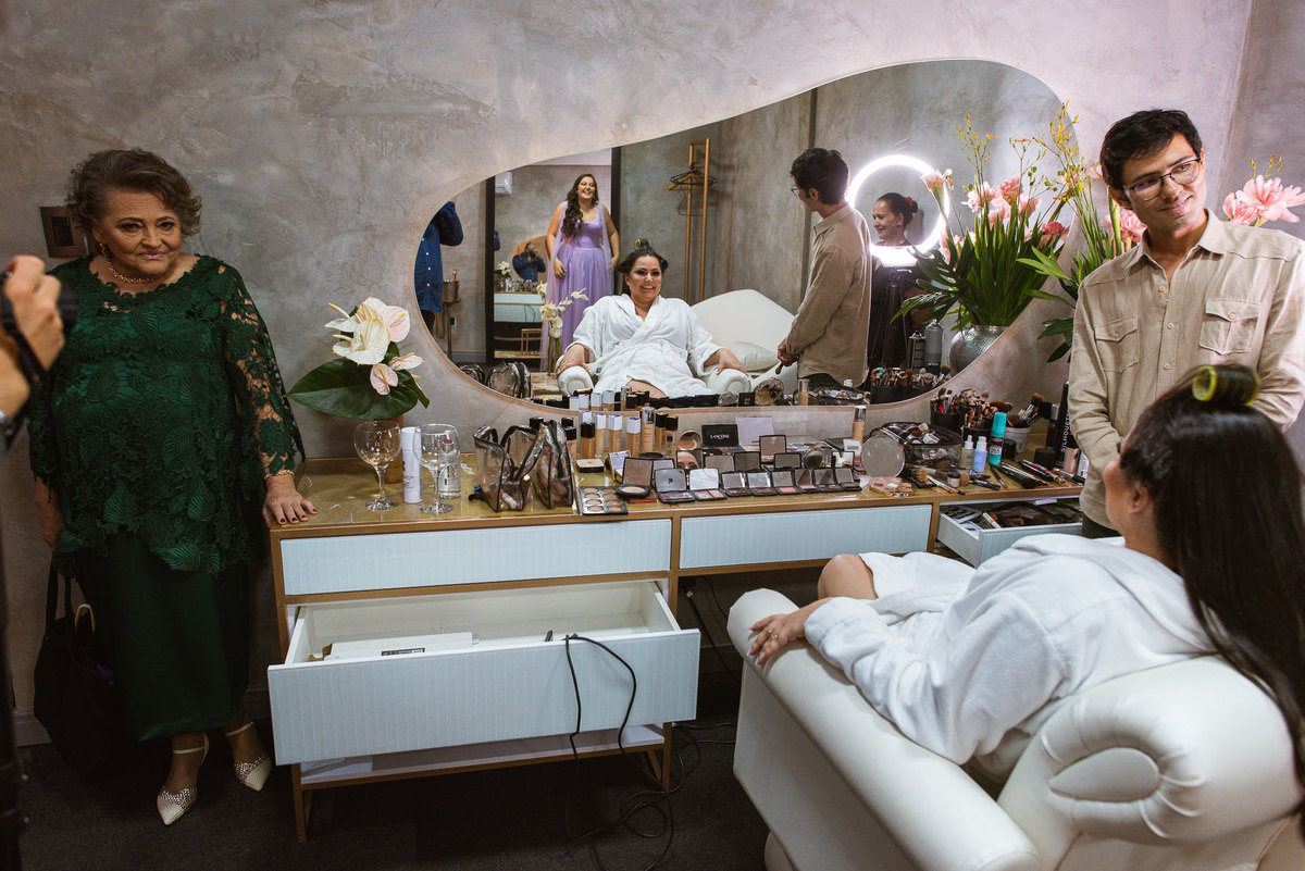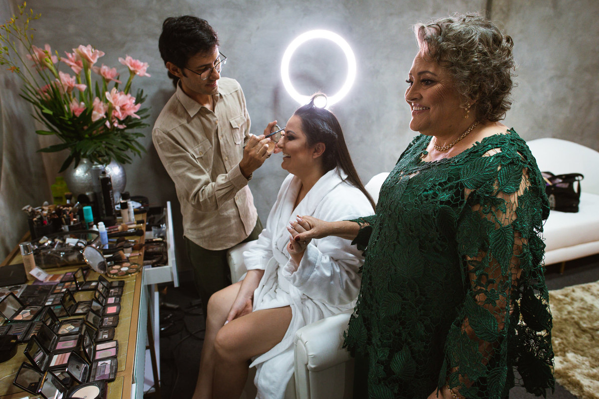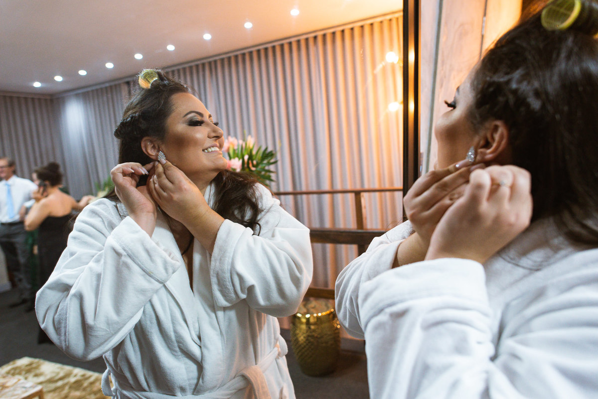 Thiago providenciou uma make exatamente do jeito que a noiva desejou. O penteado escolhido por ela também foi perfeitamente executado da forma com que Dayane havia sonhado. Dona Maria Luisa, mãe da noiva, acompanhou de perto todos os movimentos que aconteciam durante a produção. Sorria, contava histórias e se encantava com a beleza de sua filha. Não poderíamos deixar de citar a beleza da neta, também chamada Maria Luiza que estava linda com seu vestido e produção. Dayane era só sorrisos para todos os lados. Exalava felicidade e muita emoção. Ela mesmo me disse que havia chorado muito durante a semana pensando nos preparativos e sobre como o grande dia estava tão perto...