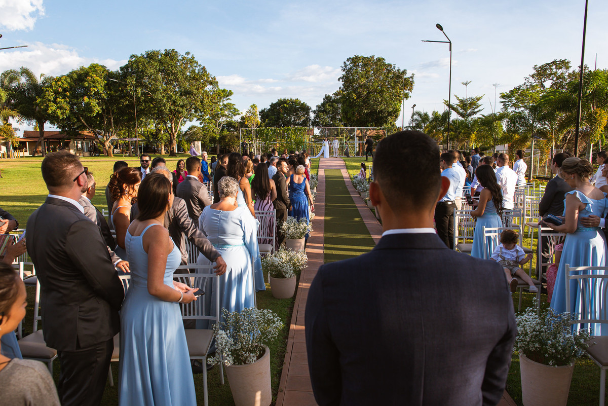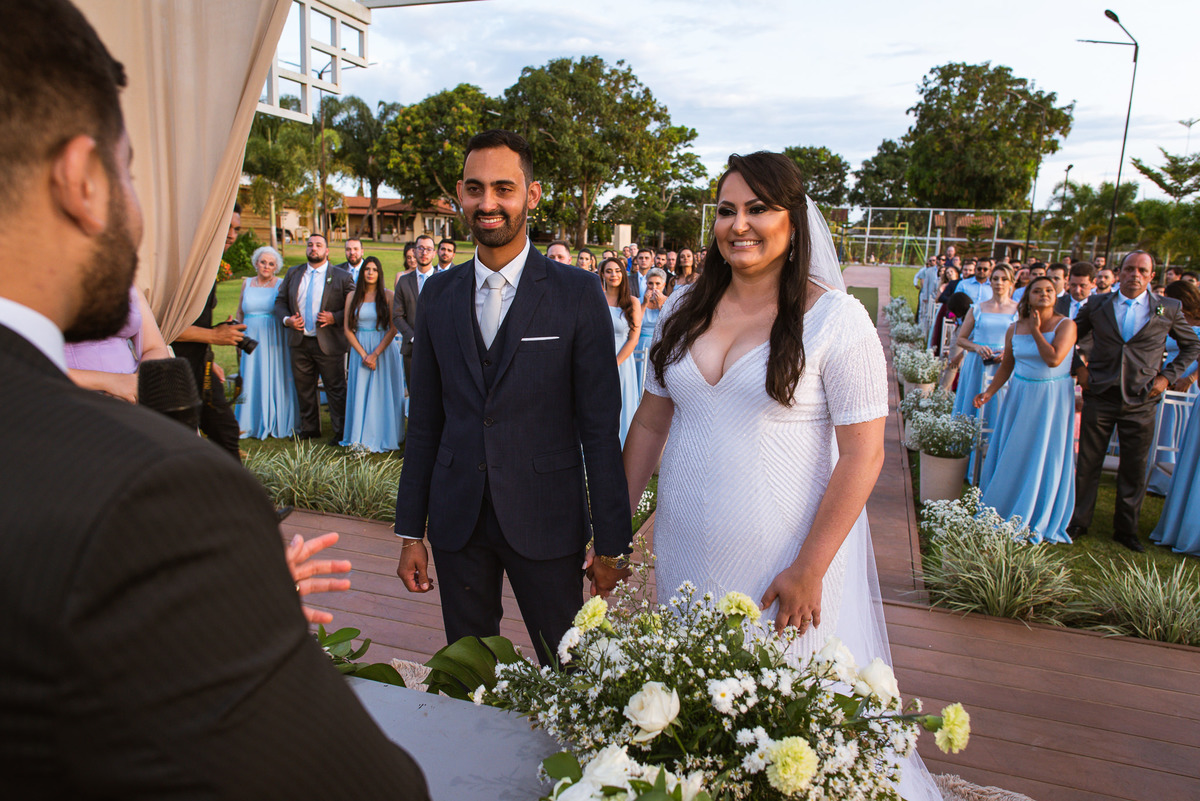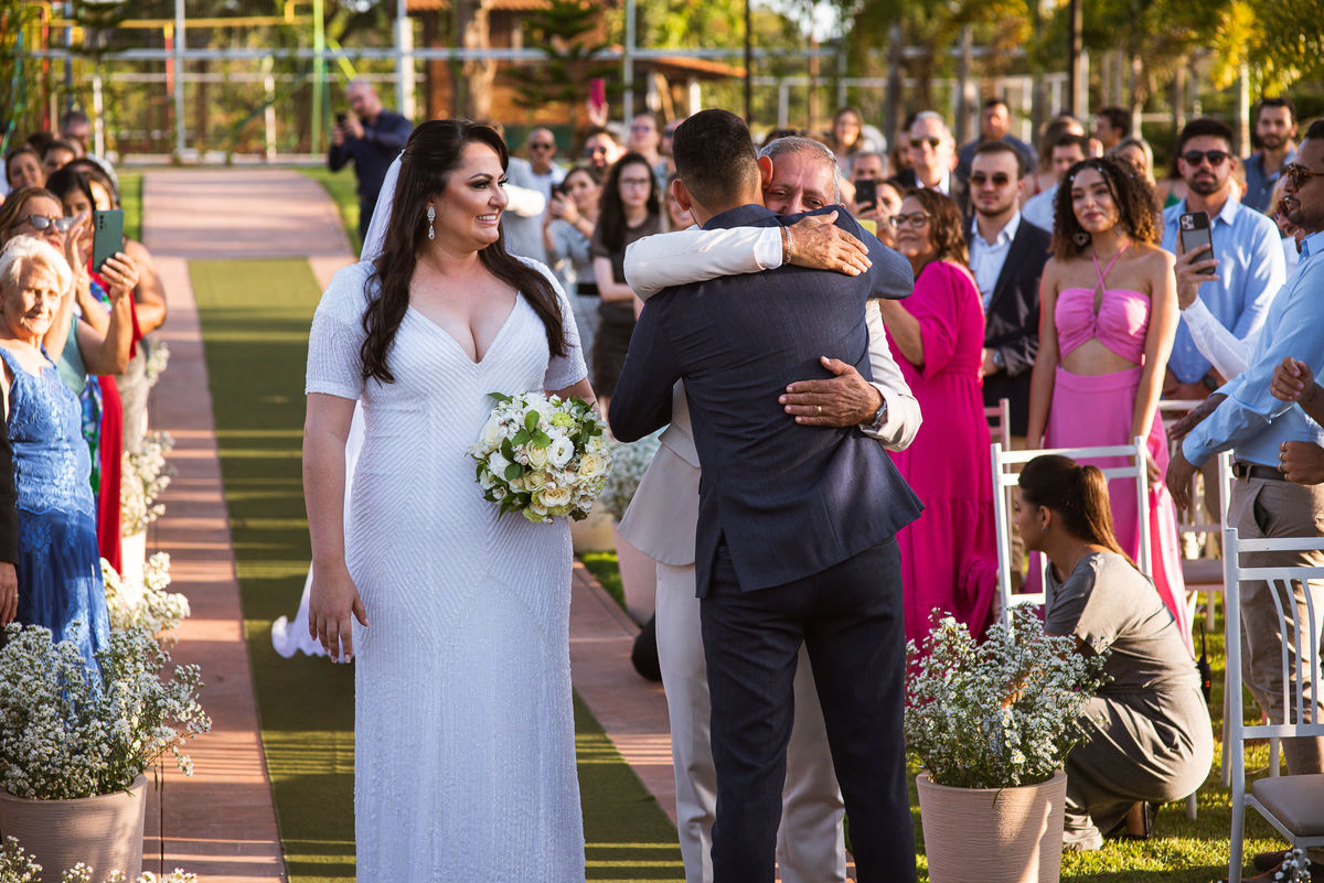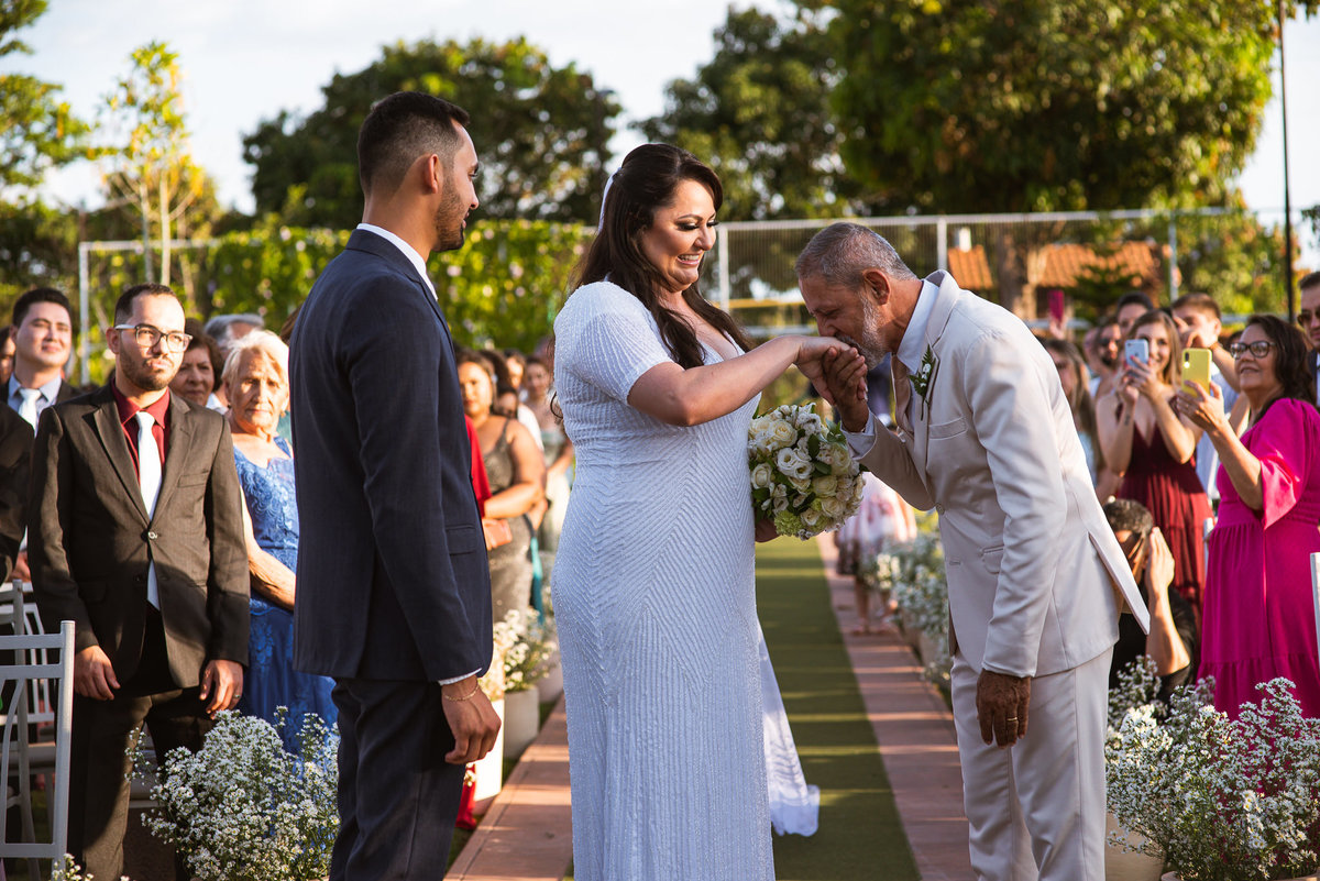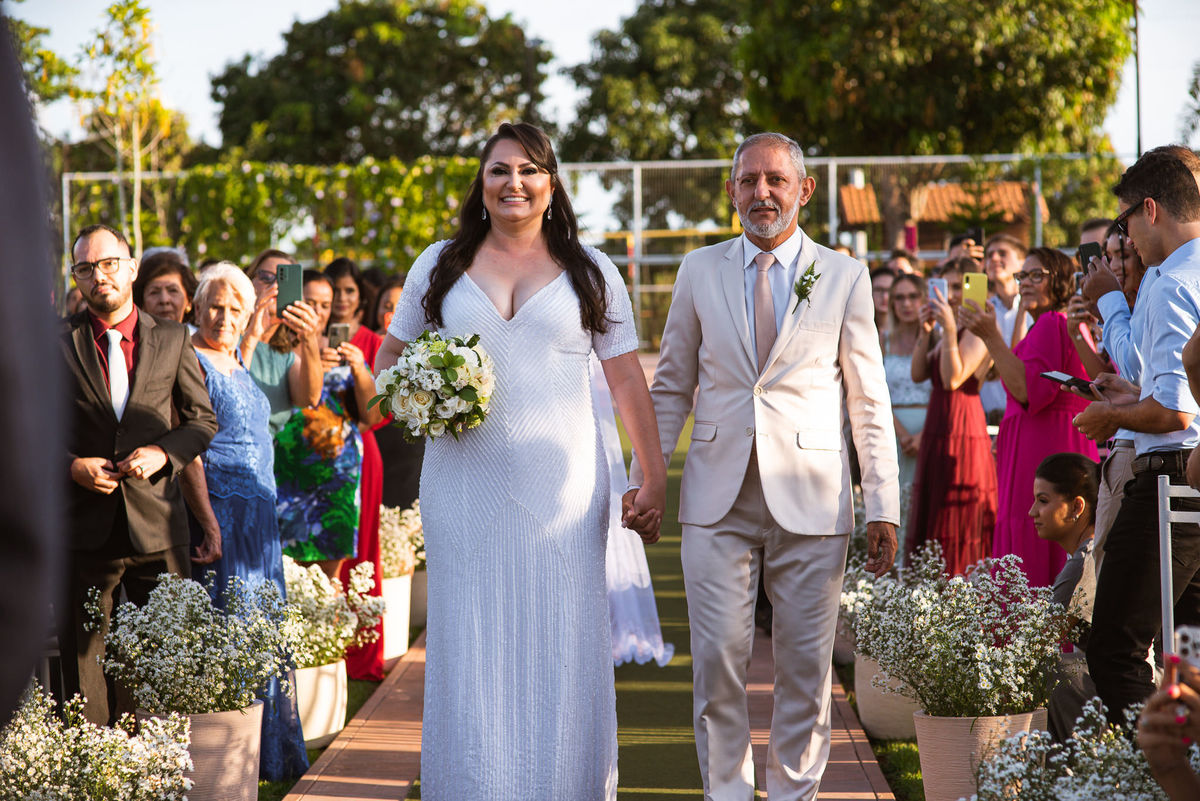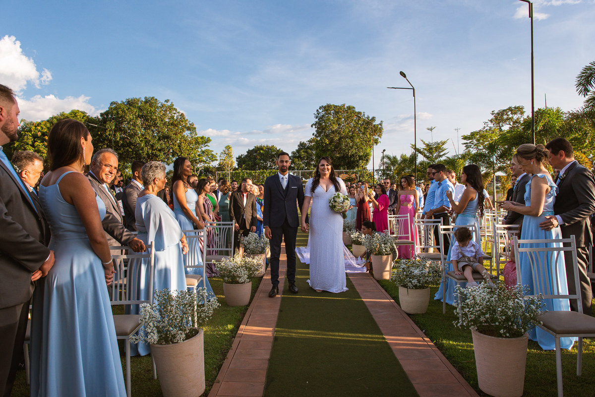 Aquela tarde linda de sol e um céu azul inigualável deixou tudo ainda mais lindo. Daniel juntamente com sua mãe caminhou muito emocionado rumo ao altar. Já no meio da caminhada, ele não segurou as lágrimas. Os padrinhos e madrinhas fizeram da sua entrada um verdadeiro show. Sorriam e abrilhantavam a cerimônia com carisma e muita alegria. Dayane escolheu 11 damas adultas para também fazer parte do seu momento. Enfim, ao som do saxofone, era anunciada a chegada do momento mais importante do casamento. Dayane e seu pai caminhavam lentamente, curtindo cada segundo daquele momento único e inesquecível. Visivelmente emocionado, Daniel mal conseguia conter as lágrimas. Dayane por sua vez, quando avistou seu noivo chorando, não conseguiu mais segurar a emoção.