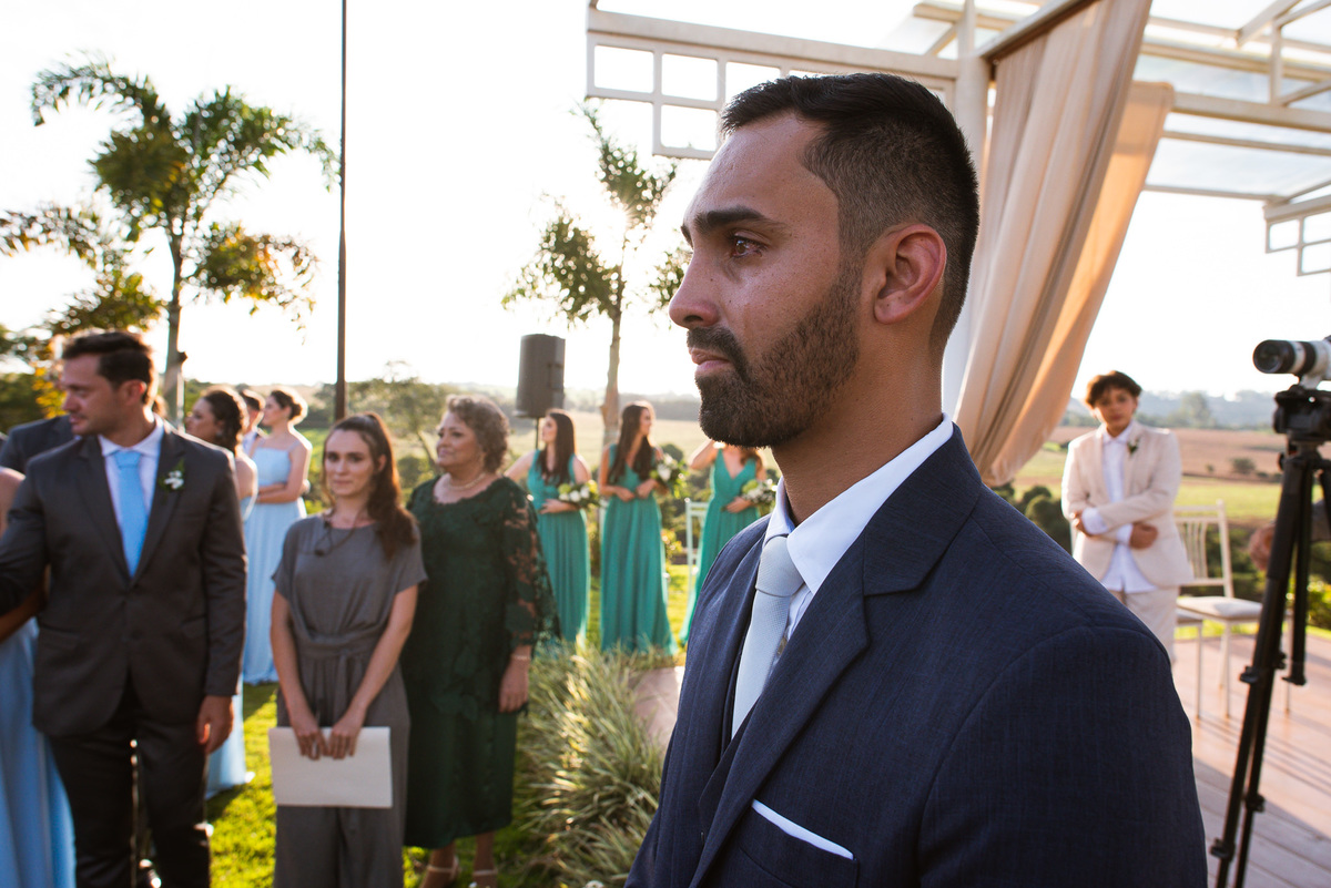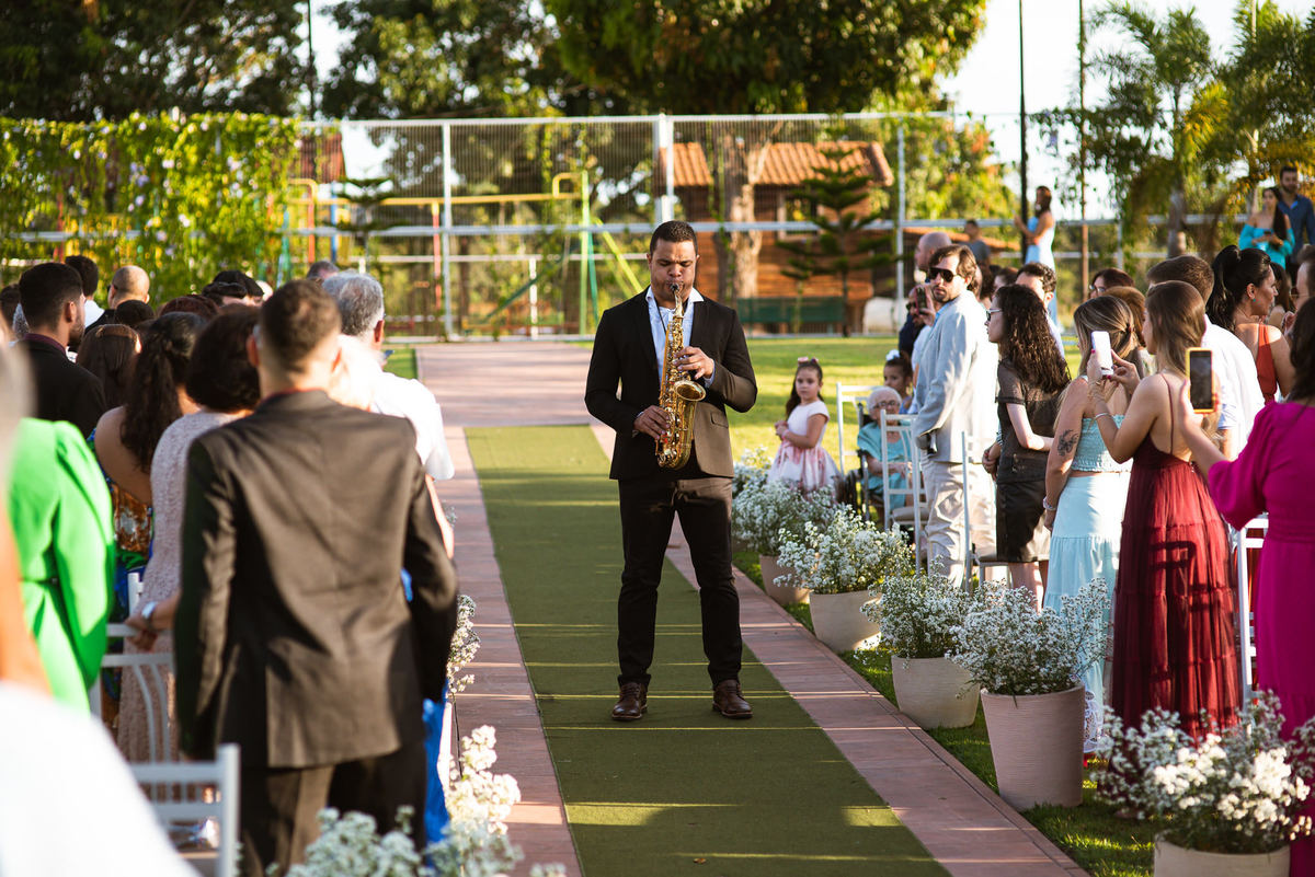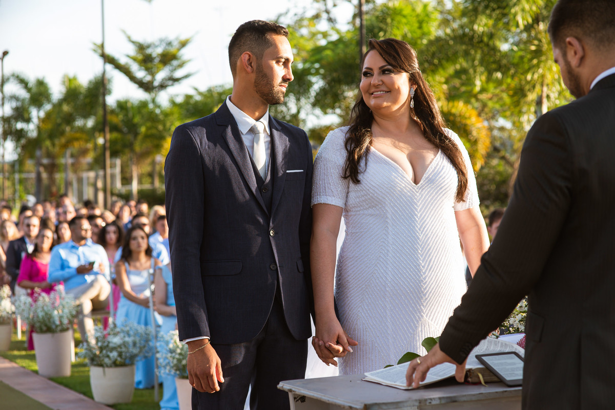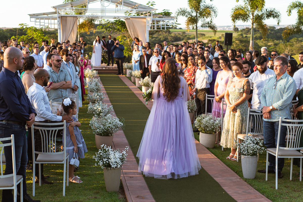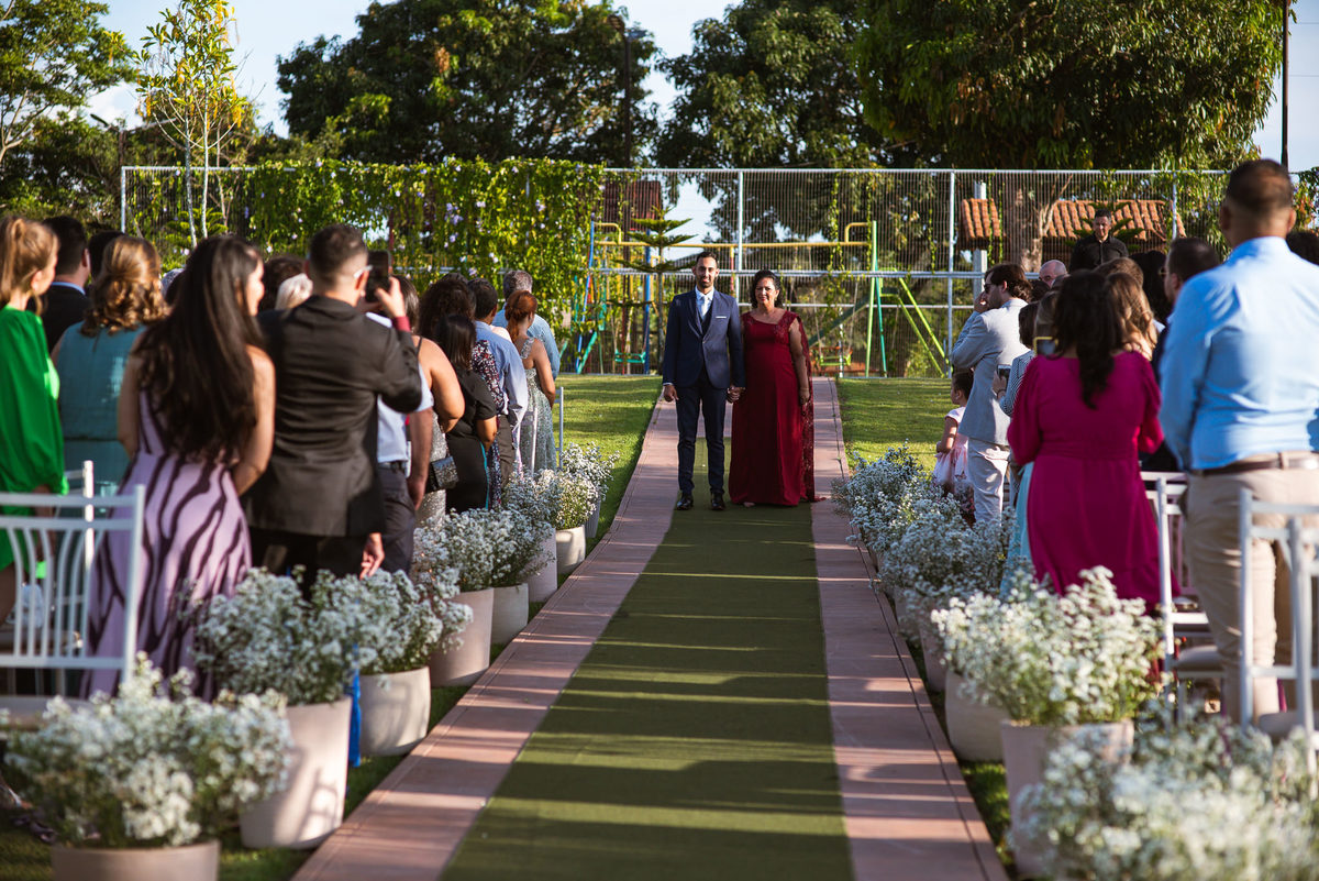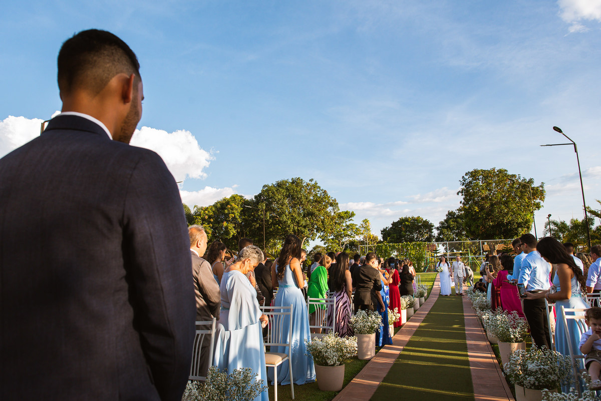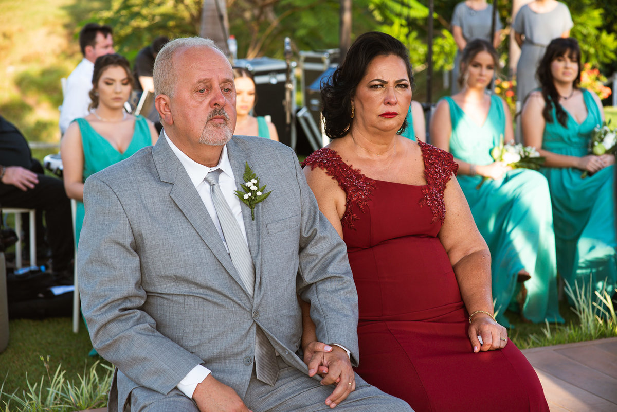 Aquela tarde linda de sol e um céu azul inigualável deixou tudo ainda mais lindo. Daniel juntamente com sua mãe caminhou muito emocionado rumo ao altar. Já no meio da caminhada, ele não segurou as lágrimas. Os padrinhos e madrinhas fizeram da sua entrada um verdadeiro show. Sorriam e abrilhantavam a cerimônia com carisma e muita alegria. Dayane escolheu 11 damas adultas para também fazer parte do seu momento. Enfim, ao som do saxofone, era anunciada a chegada do momento mais importante do casamento. Dayane e seu pai caminhavam lentamente, curtindo cada segundo daquele momento único e inesquecível. Visivelmente emocionado, Daniel mal conseguia conter as lágrimas. Dayane por sua vez, quando avistou seu noivo chorando, não conseguiu mais segurar a emoção.