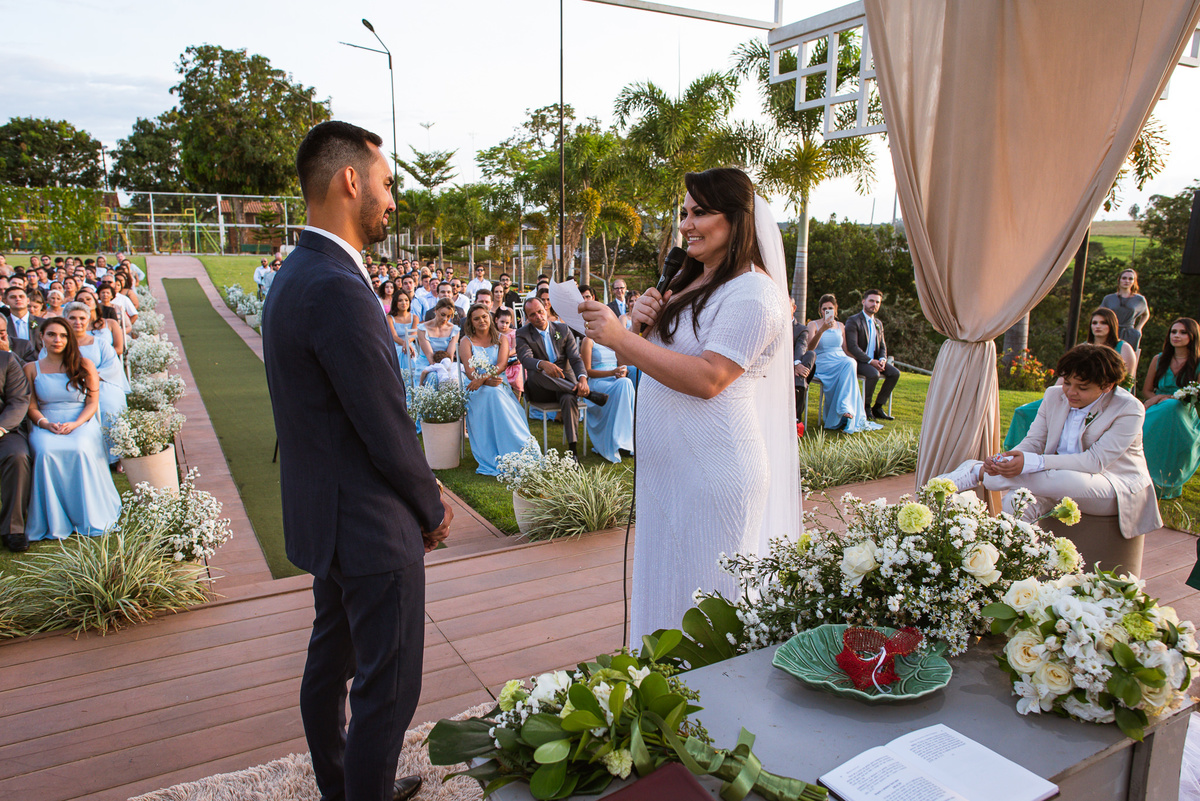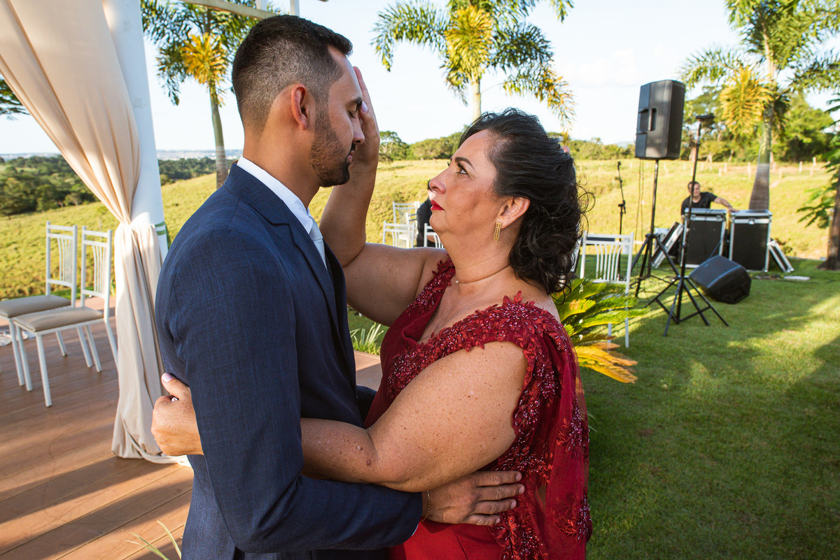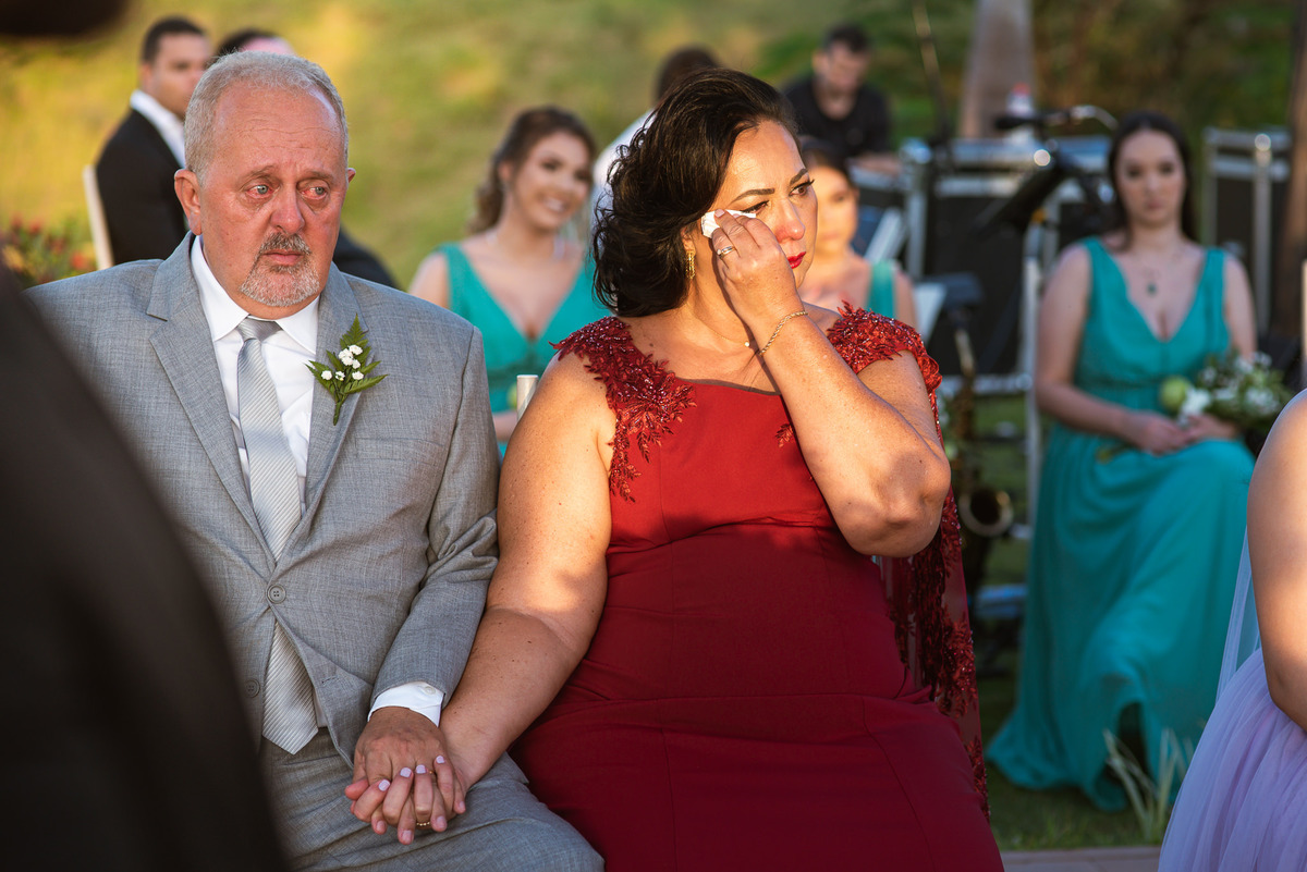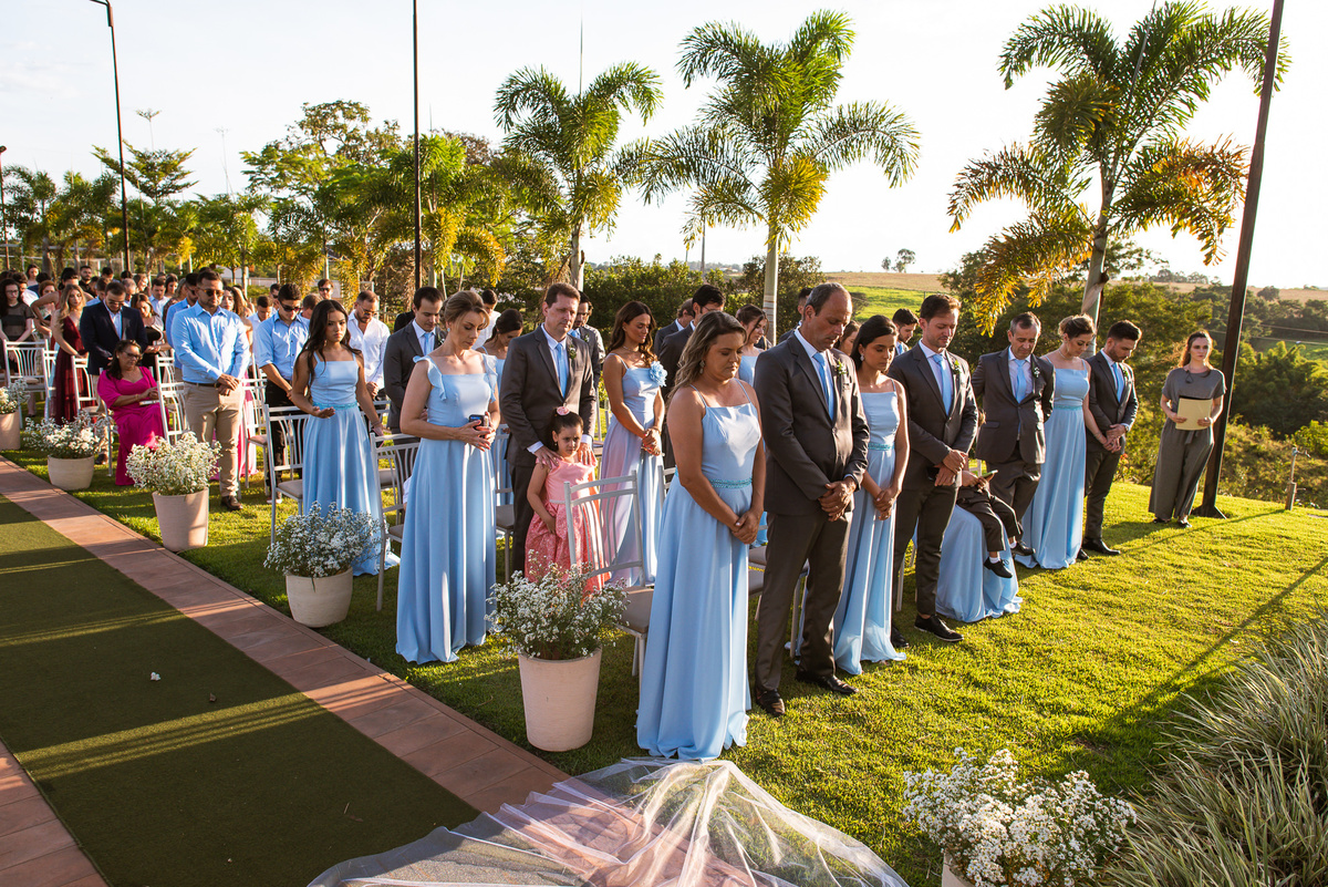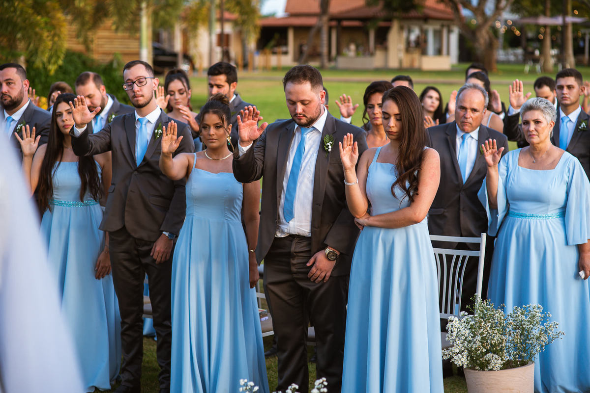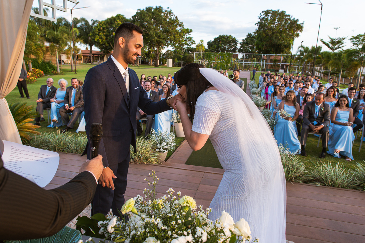 Aquela tarde linda de sol e um céu azul inigualável deixou tudo ainda mais lindo. Daniel juntamente com sua mãe caminhou muito emocionado rumo ao altar. Já no meio da caminhada, ele não segurou as lágrimas. Os padrinhos e madrinhas fizeram da sua entrada um verdadeiro show. Sorriam e abrilhantavam a cerimônia com carisma e muita alegria. Dayane escolheu 11 damas adultas para também fazer parte do seu momento. Enfim, ao som do saxofone, era anunciada a chegada do momento mais importante do casamento. Dayane e seu pai caminhavam lentamente, curtindo cada segundo daquele momento único e inesquecível. Visivelmente emocionado, Daniel mal conseguia conter as lágrimas. Dayane por sua vez, quando avistou seu noivo chorando, não conseguiu mais segurar a emoção.