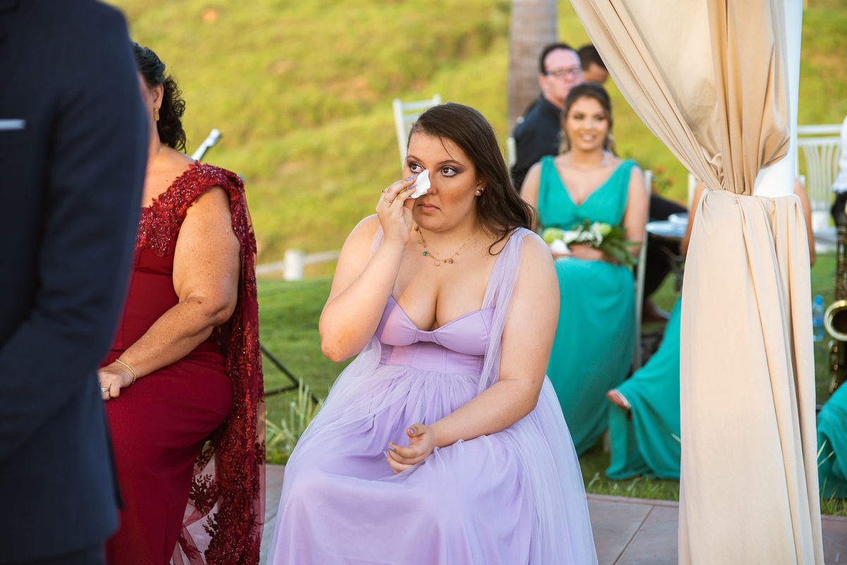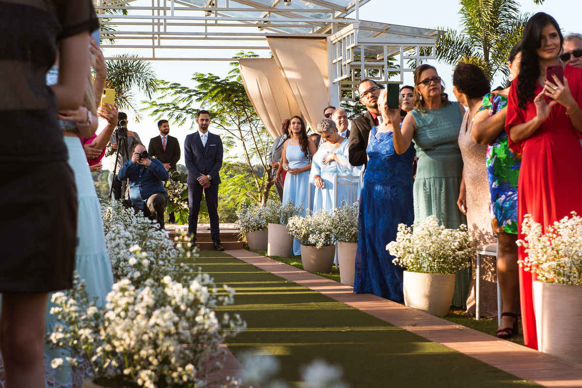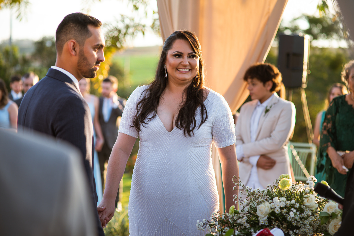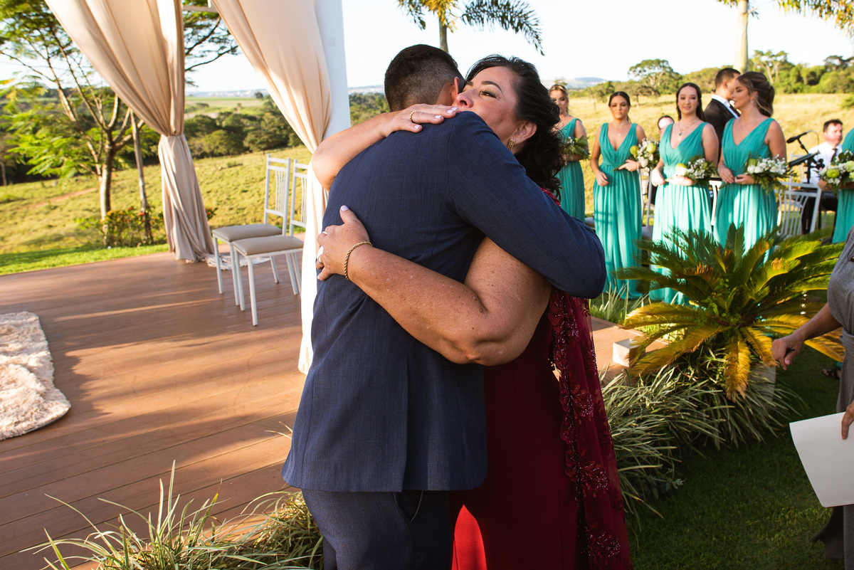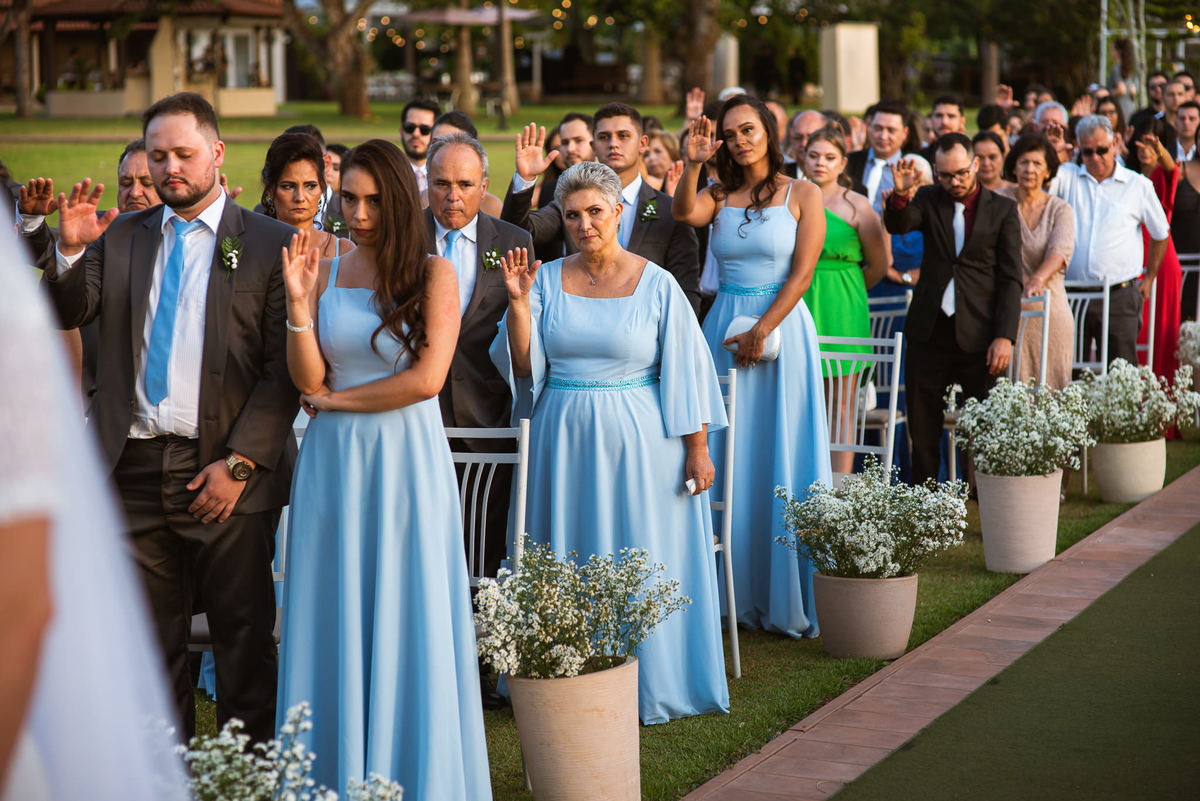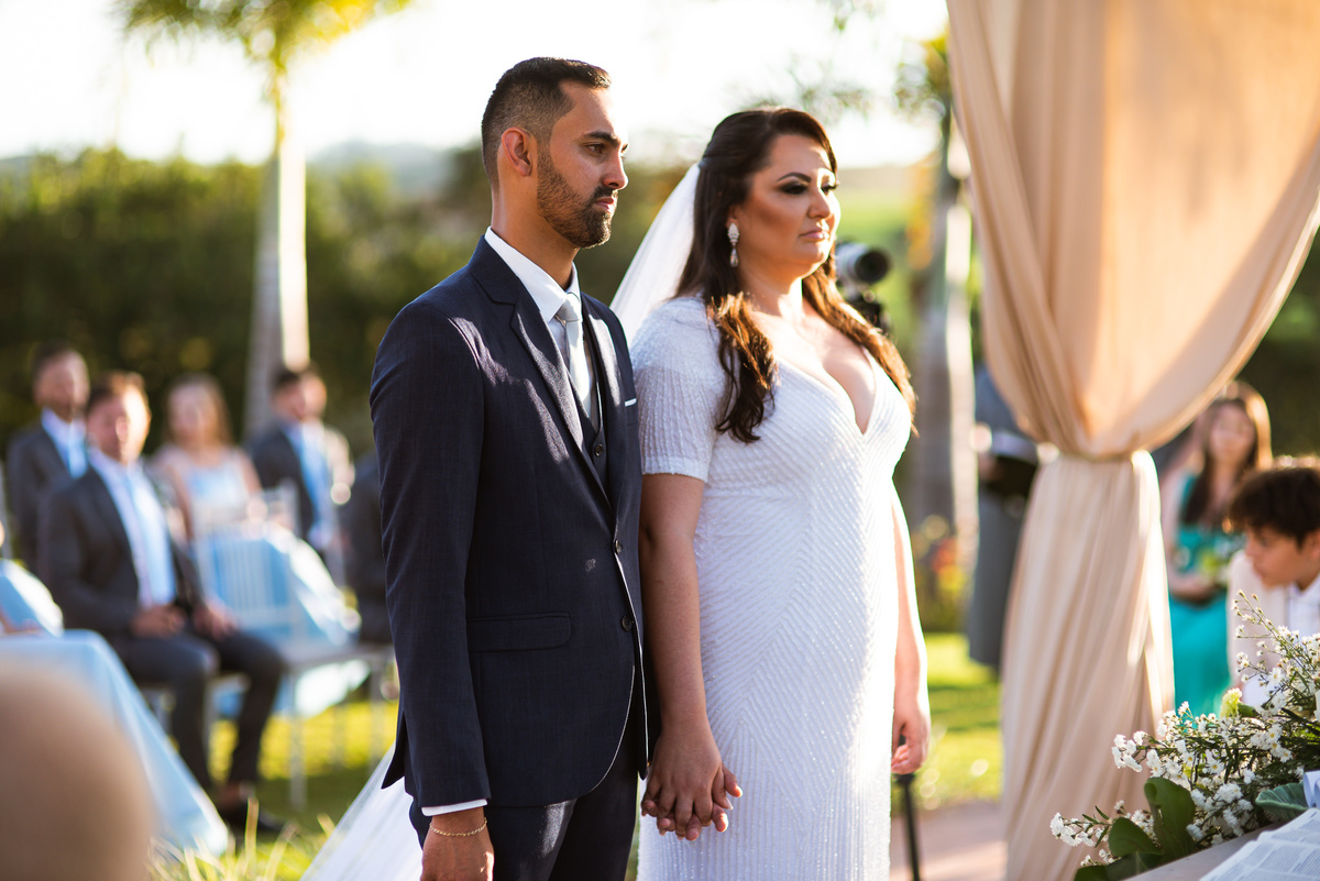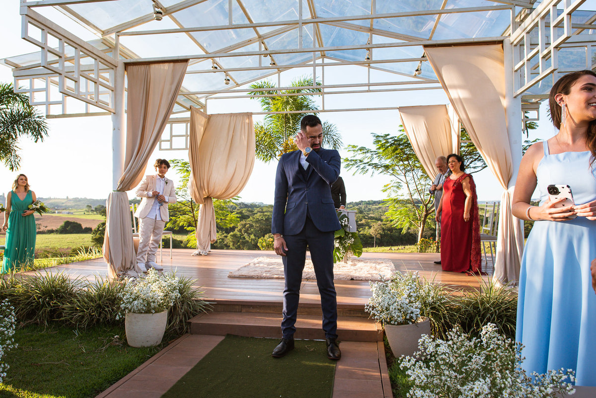 Aquela tarde linda de sol e um céu azul inigualável deixou tudo ainda mais lindo. Daniel juntamente com sua mãe caminhou muito emocionado rumo ao altar. Já no meio da caminhada, ele não segurou as lágrimas. Os padrinhos e madrinhas fizeram da sua entrada um verdadeiro show. Sorriam e abrilhantavam a cerimônia com carisma e muita alegria. Dayane escolheu 11 damas adultas para também fazer parte do seu momento. Enfim, ao som do saxofone, era anunciada a chegada do momento mais importante do casamento. Dayane e seu pai caminhavam lentamente, curtindo cada segundo daquele momento único e inesquecível. Visivelmente emocionado, Daniel mal conseguia conter as lágrimas. Dayane por sua vez, quando avistou seu noivo chorando, não conseguiu mais segurar a emoção.