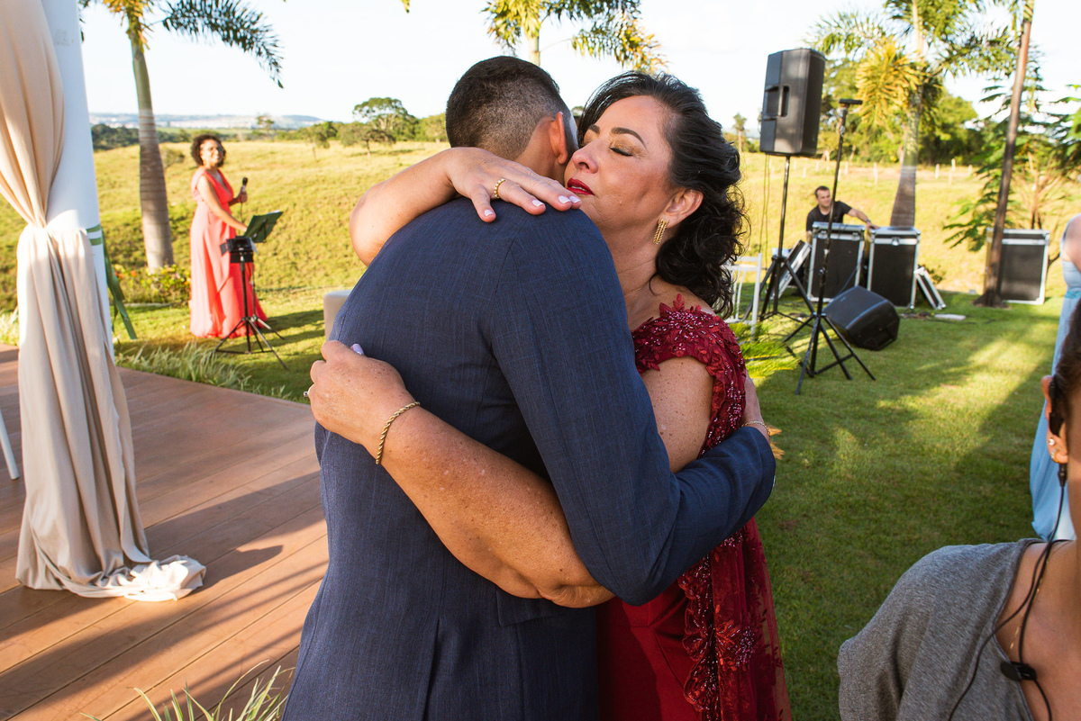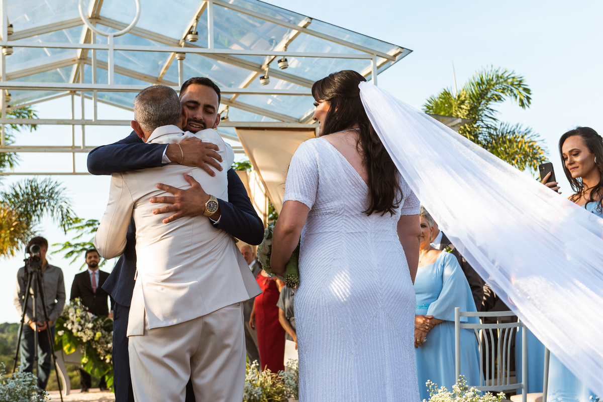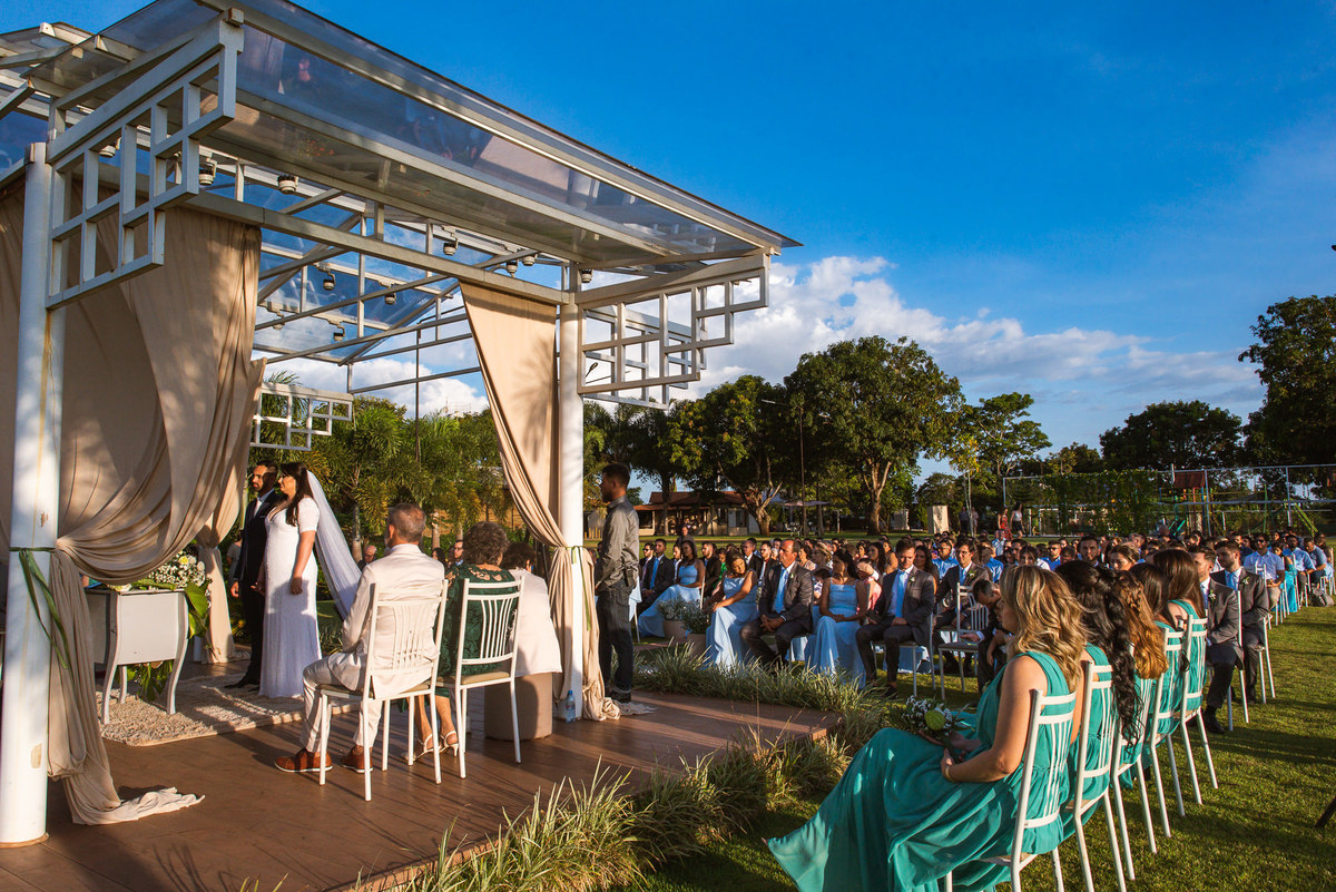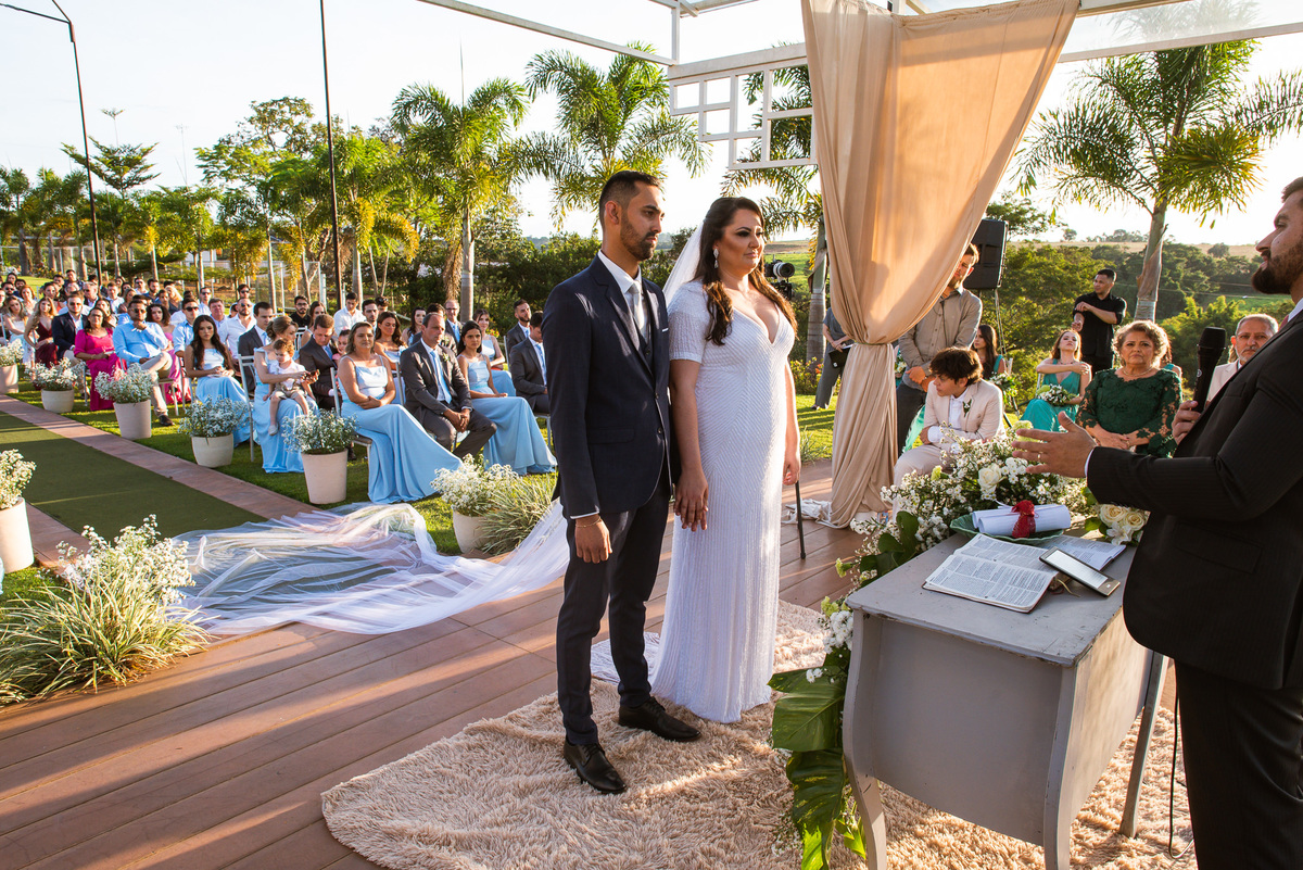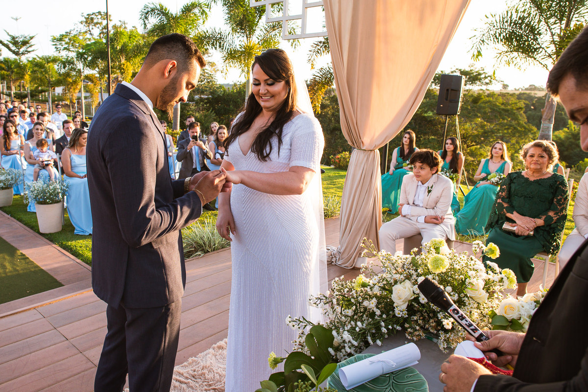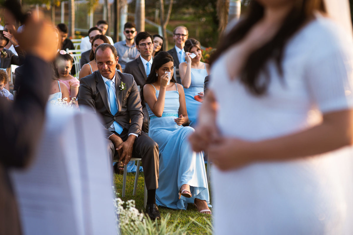 Aquela tarde linda de sol e um céu azul inigualável deixou tudo ainda mais lindo. Daniel juntamente com sua mãe caminhou muito emocionado rumo ao altar. Já no meio da caminhada, ele não segurou as lágrimas. Os padrinhos e madrinhas fizeram da sua entrada um verdadeiro show. Sorriam e abrilhantavam a cerimônia com carisma e muita alegria. Dayane escolheu 11 damas adultas para também fazer parte do seu momento. Enfim, ao som do saxofone, era anunciada a chegada do momento mais importante do casamento. Dayane e seu pai caminhavam lentamente, curtindo cada segundo daquele momento único e inesquecível. Visivelmente emocionado, Daniel mal conseguia conter as lágrimas. Dayane por sua vez, quando avistou seu noivo chorando, não conseguiu mais segurar a emoção.