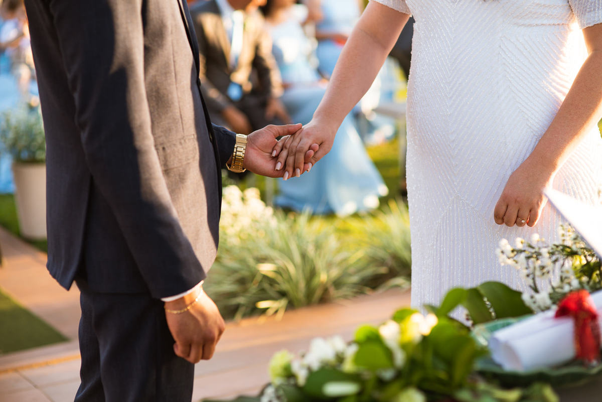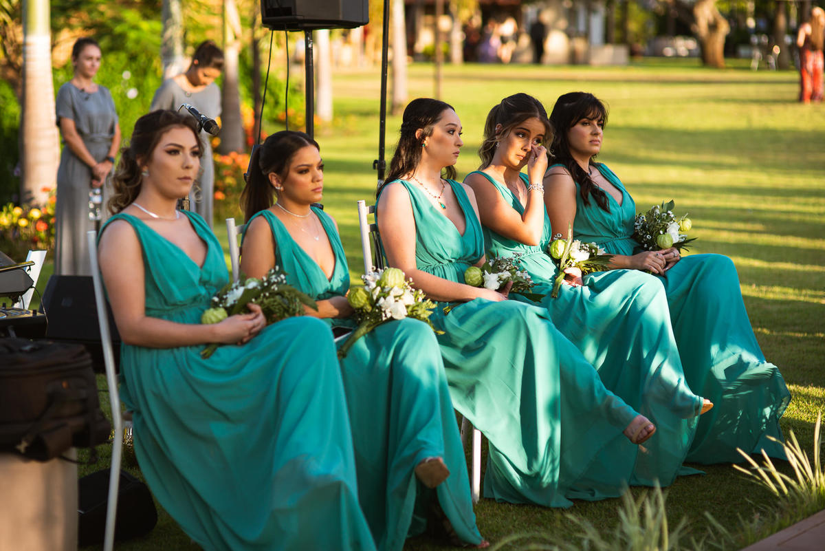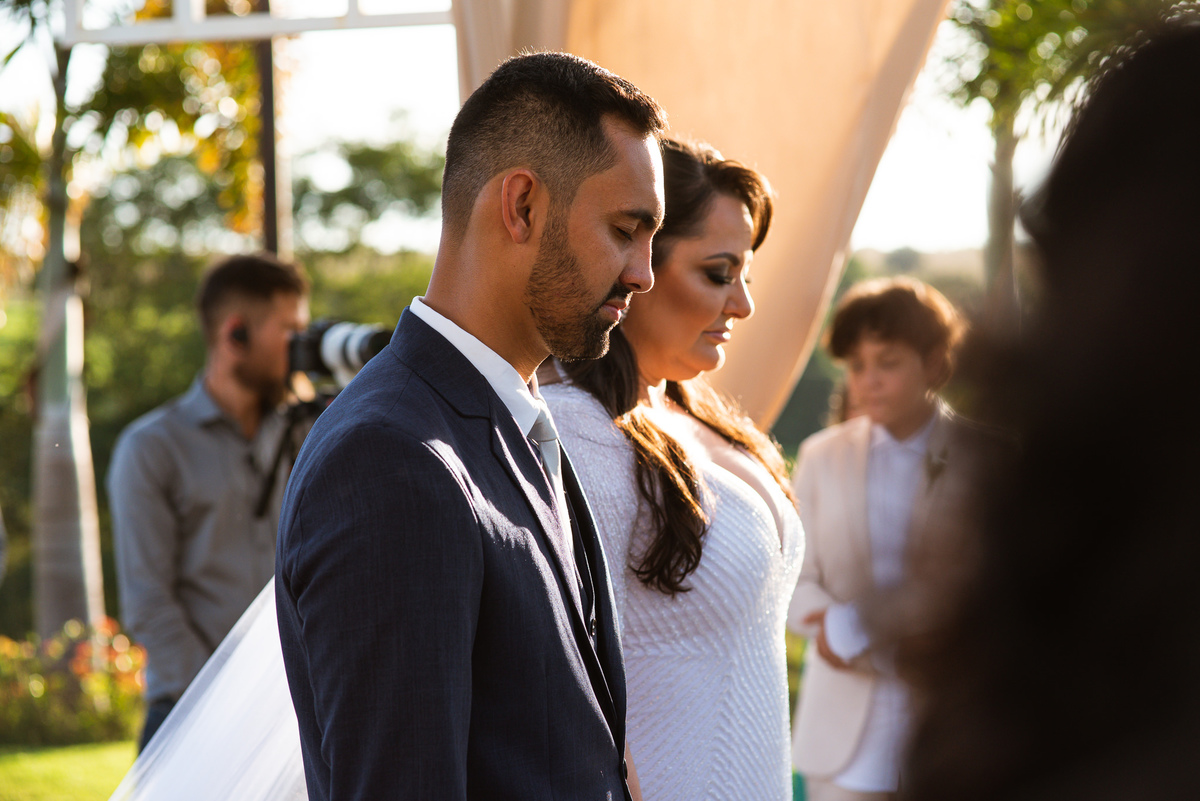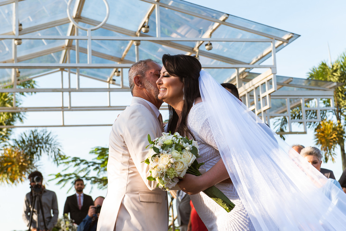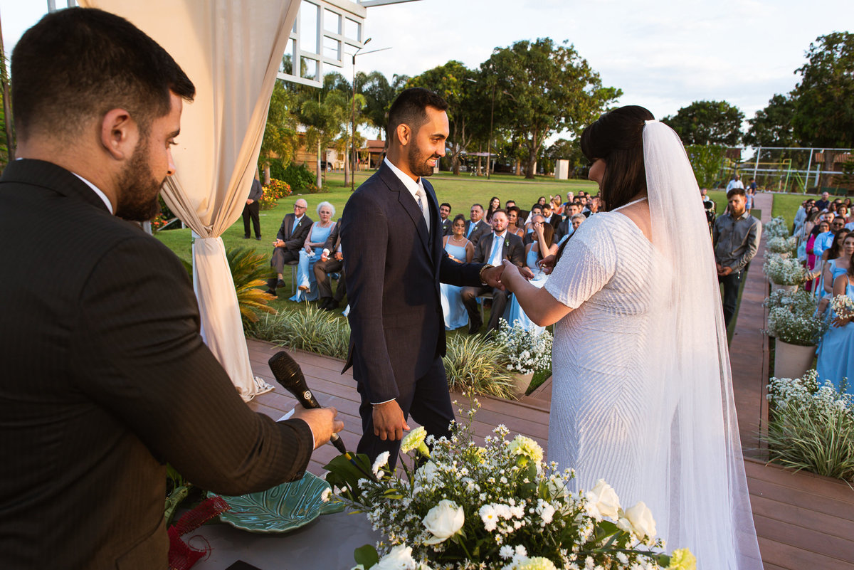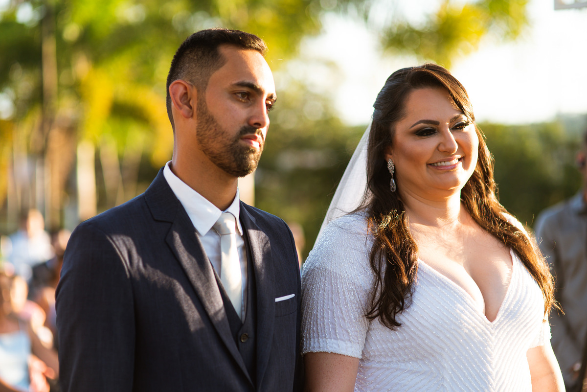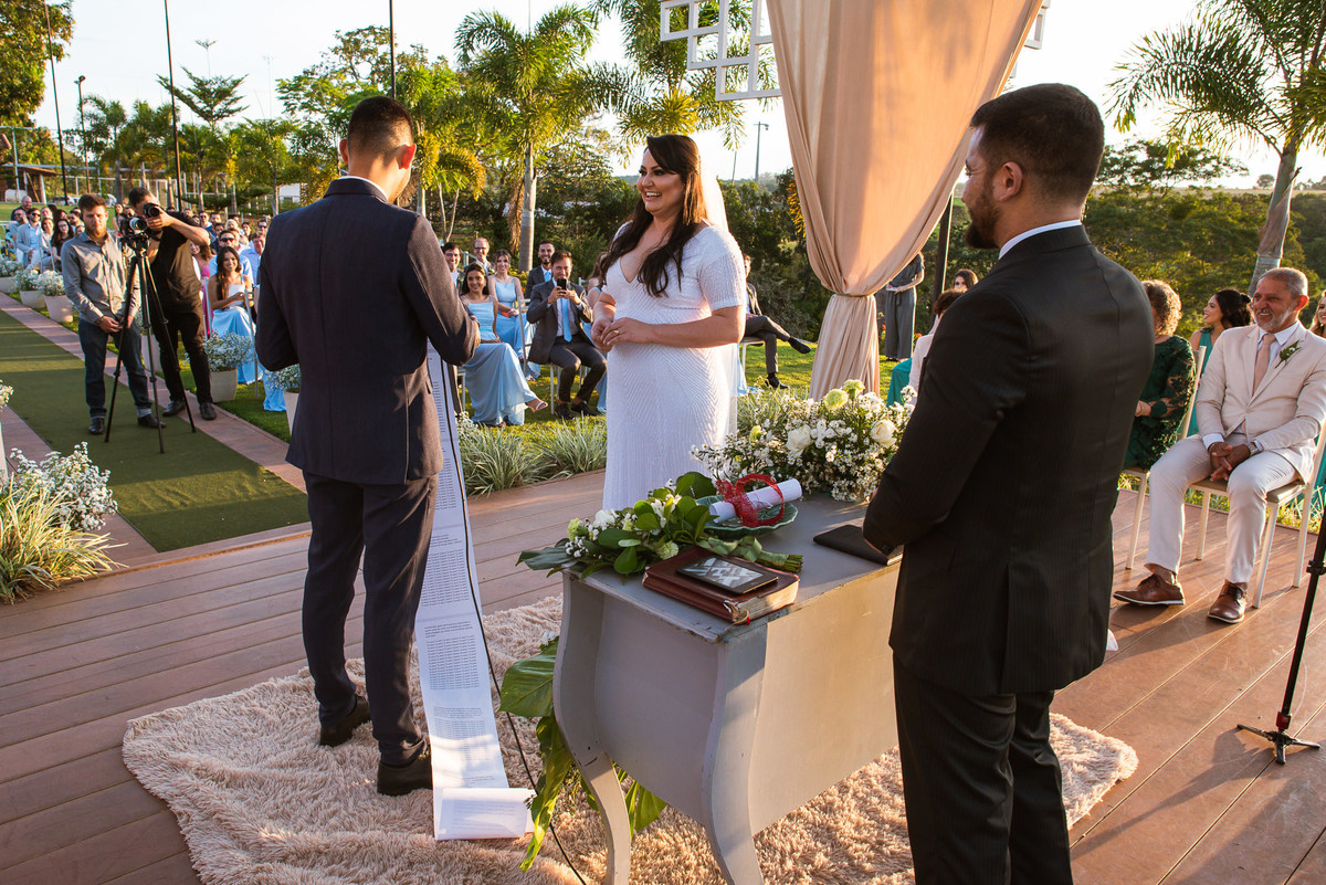 Aquela tarde linda de sol e um céu azul inigualável deixou tudo ainda mais lindo. Daniel juntamente com sua mãe caminhou muito emocionado rumo ao altar. Já no meio da caminhada, ele não segurou as lágrimas. Os padrinhos e madrinhas fizeram da sua entrada um verdadeiro show. Sorriam e abrilhantavam a cerimônia com carisma e muita alegria. Dayane escolheu 11 damas adultas para também fazer parte do seu momento. Enfim, ao som do saxofone, era anunciada a chegada do momento mais importante do casamento. Dayane e seu pai caminhavam lentamente, curtindo cada segundo daquele momento único e inesquecível. Visivelmente emocionado, Daniel mal conseguia conter as lágrimas. Dayane por sua vez, quando avistou seu noivo chorando, não conseguiu mais segurar a emoção.