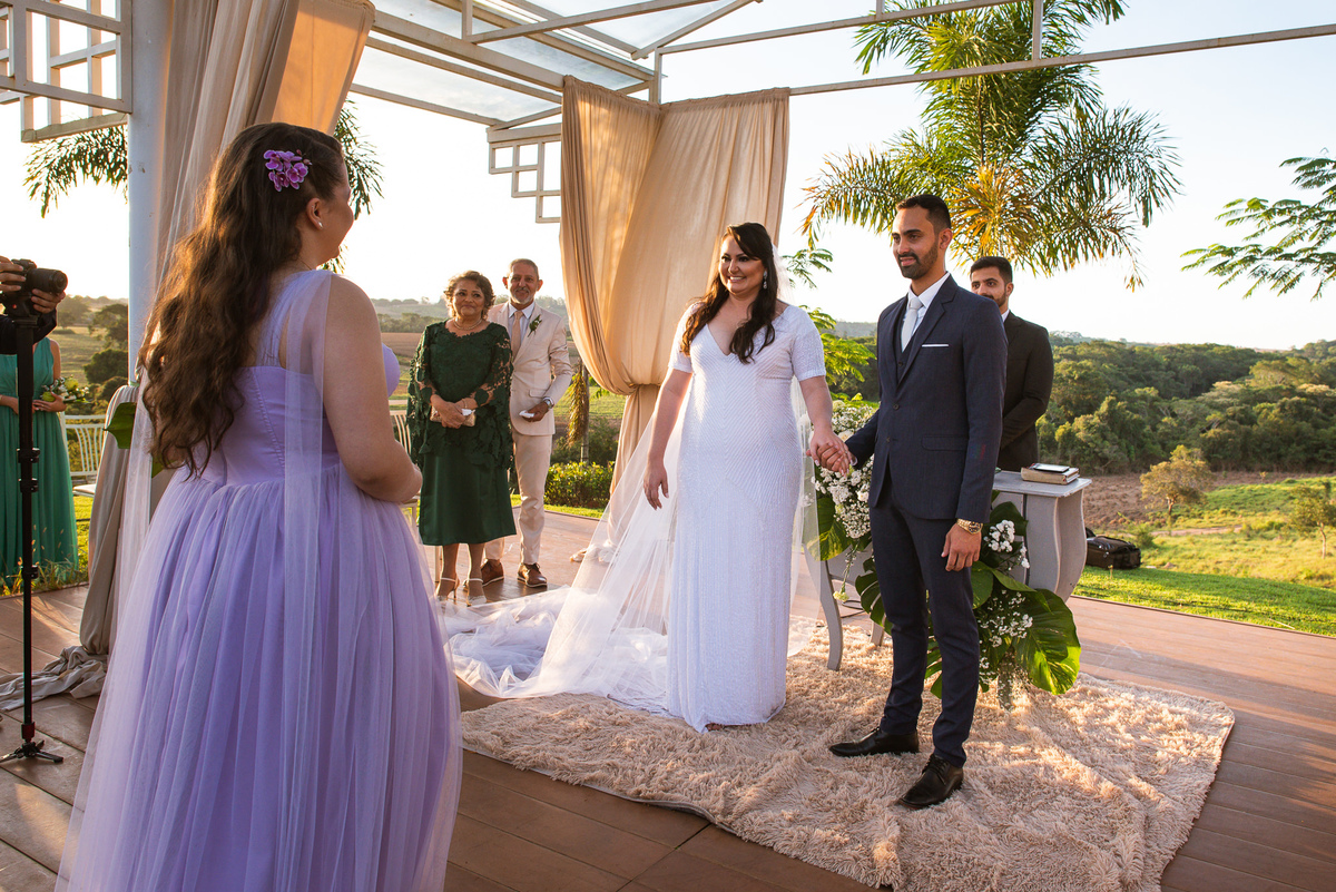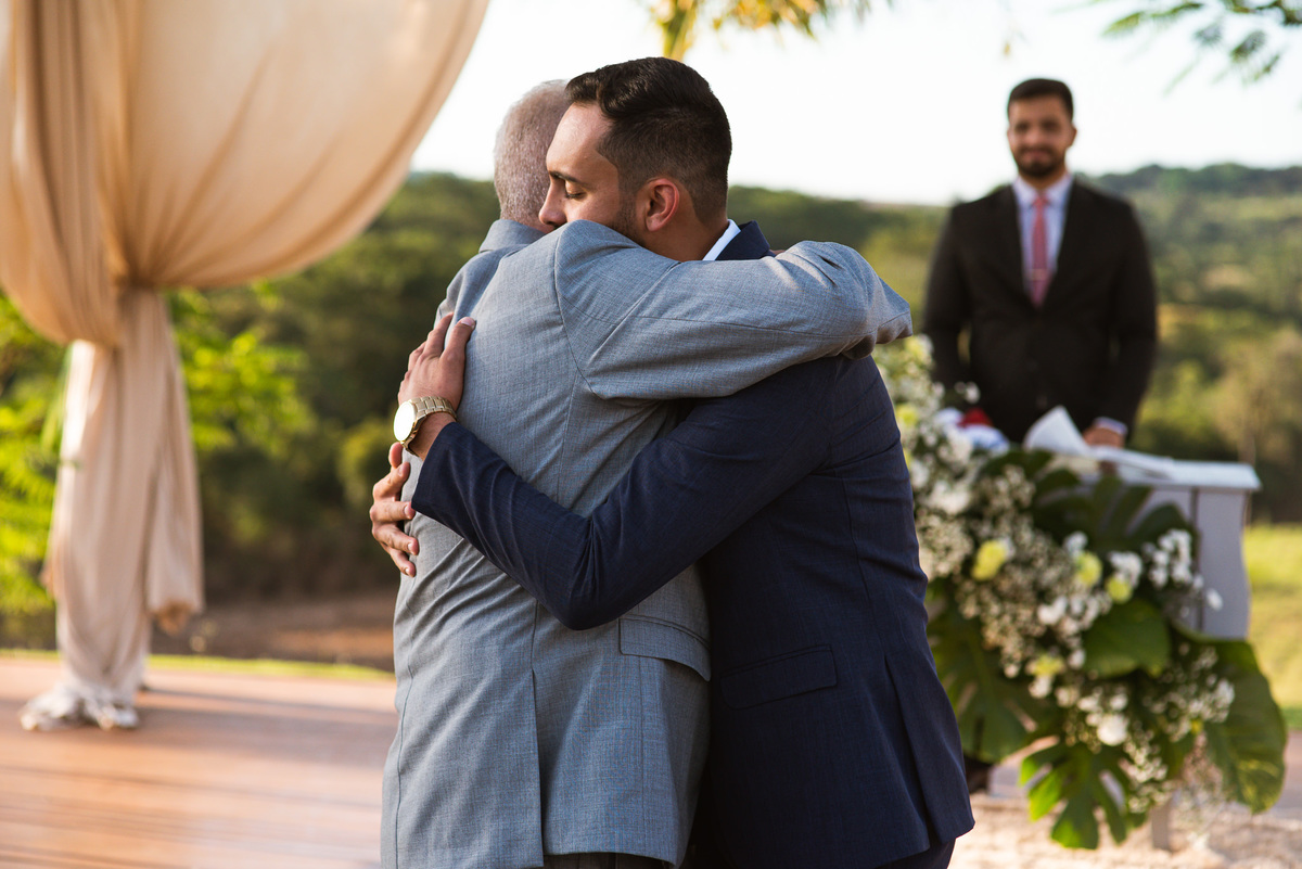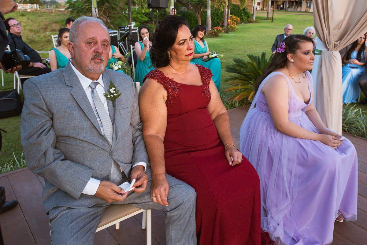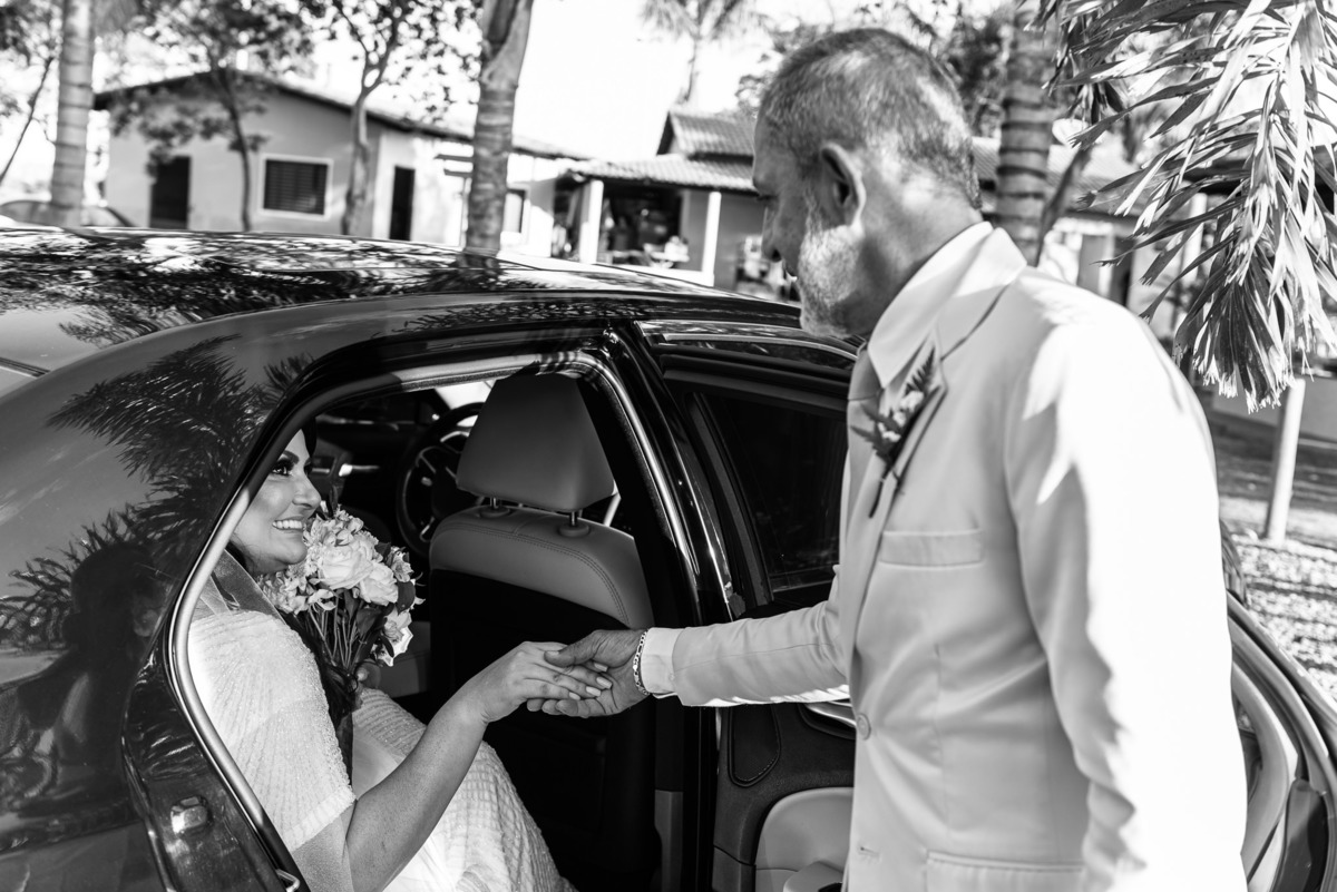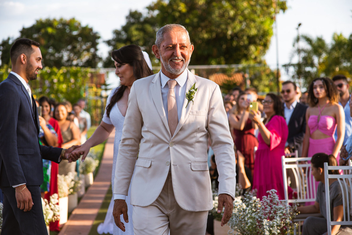 Dayane por sua vez já estava pronta também. Finalizada a produção, fizemos algumas fotos e já partimos rumo ao belíssimo Sítio Tõe do Jó. Lá chegando, avistamos todos os convidados aguardando o início da cerimônia. A decoração do local chamava a atenção de todos. Estava tudo perfeito! A noiva estava no carro aguardando somente os preparativos finais para dar início à celebração. O pai da noiva, Sr. Eugênio estava todo estiloso. De mãos dadas com sua filha, ele beijou carinhosamente e desejou toda felicidade do mundo à ela naquele momento. Com os músicos movimentando seus instrumentos, a cerimônia teve seu início.