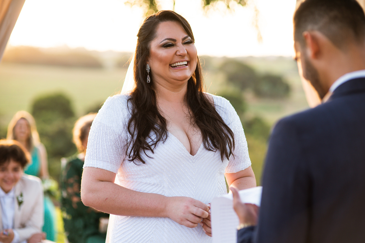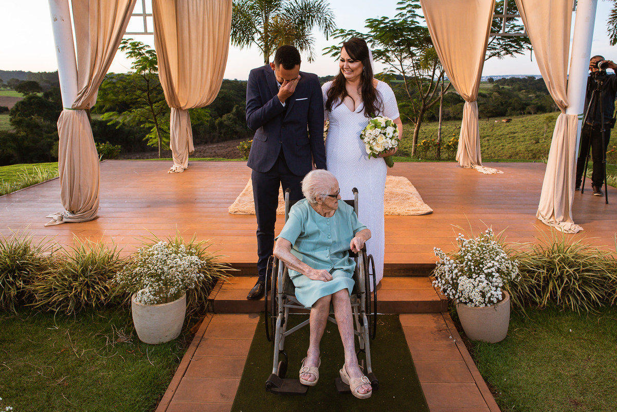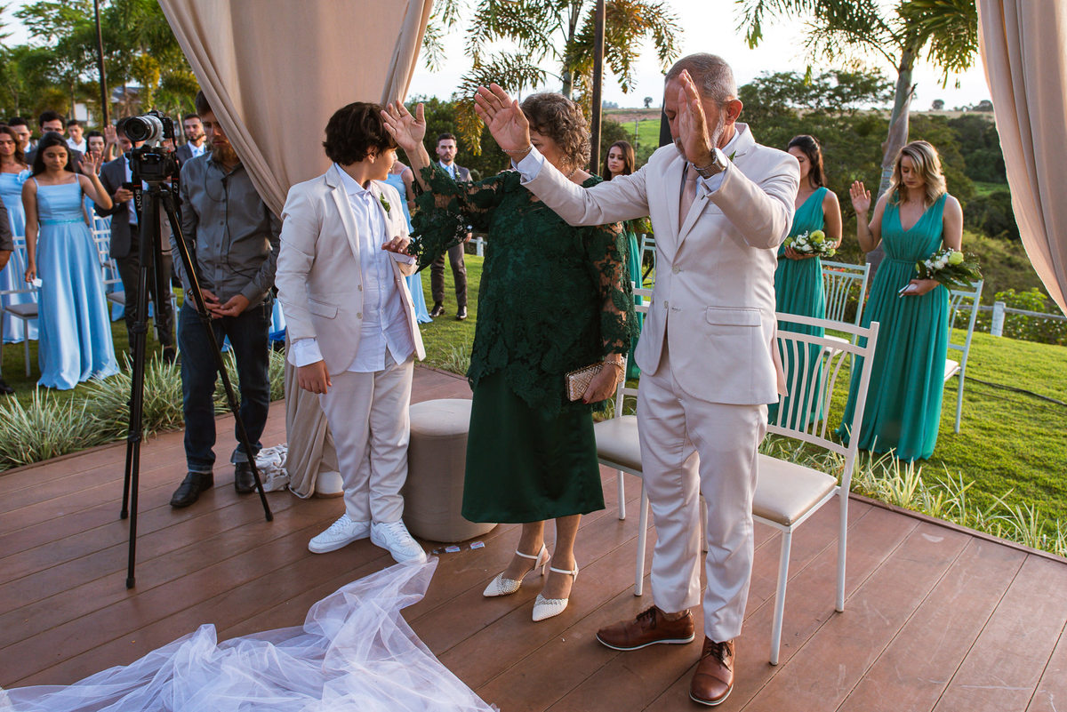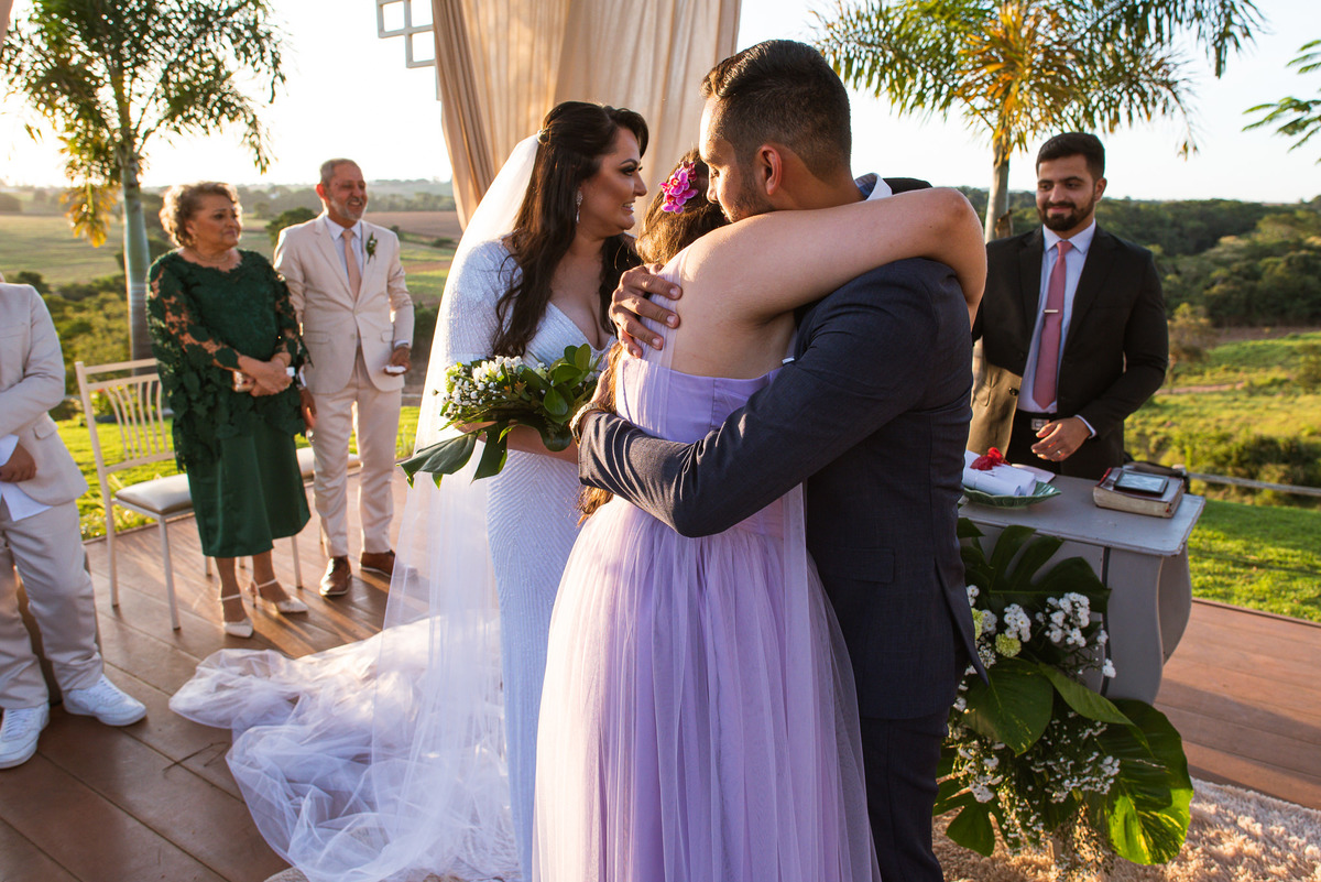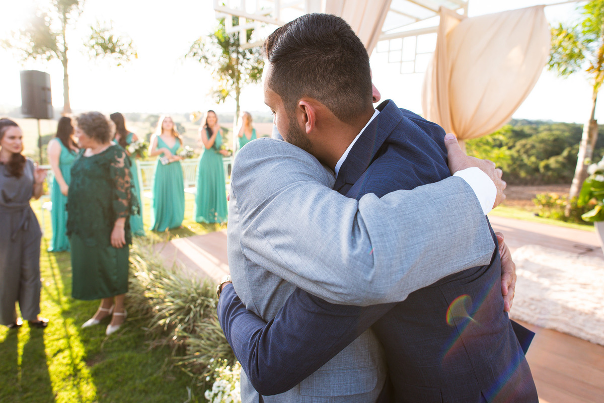 Dayane por sua vez já estava pronta também. Finalizada a produção, fizemos algumas fotos e já partimos rumo ao belíssimo Sítio Tõe do Jó. Lá chegando, avistamos todos os convidados aguardando o início da cerimônia. A decoração do local chamava a atenção de todos. Estava tudo perfeito! A noiva estava no carro aguardando somente os preparativos finais para dar início à celebração. O pai da noiva, Sr. Eugênio estava todo estiloso. De mãos dadas com sua filha, ele beijou carinhosamente e desejou toda felicidade do mundo à ela naquele momento. Com os músicos movimentando seus instrumentos, a cerimônia teve seu início.