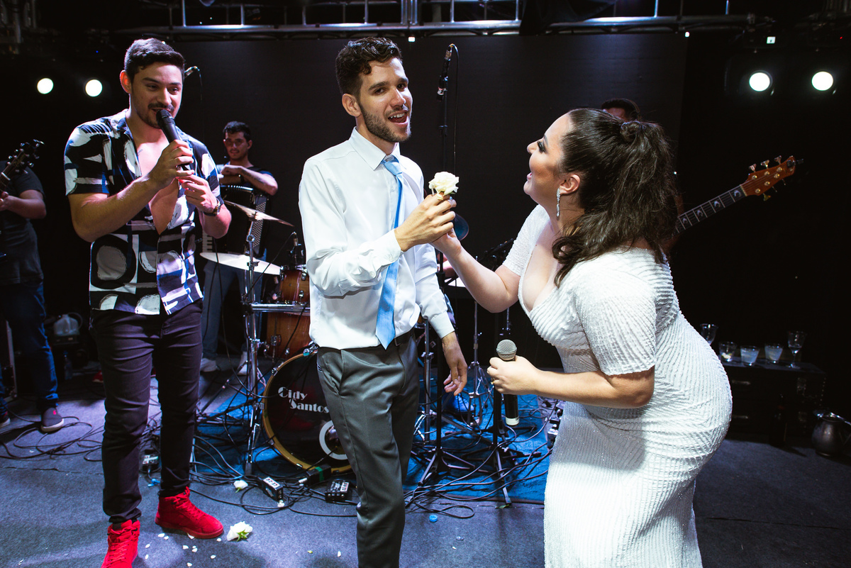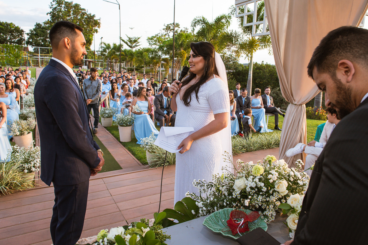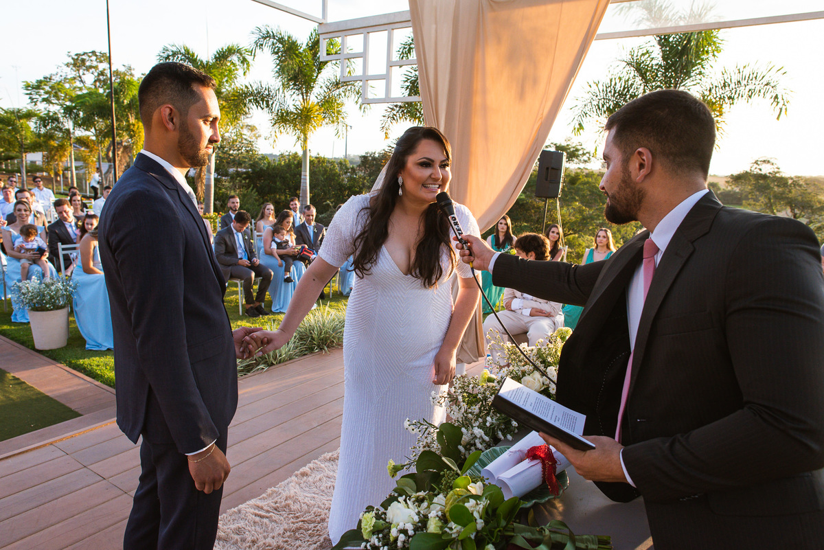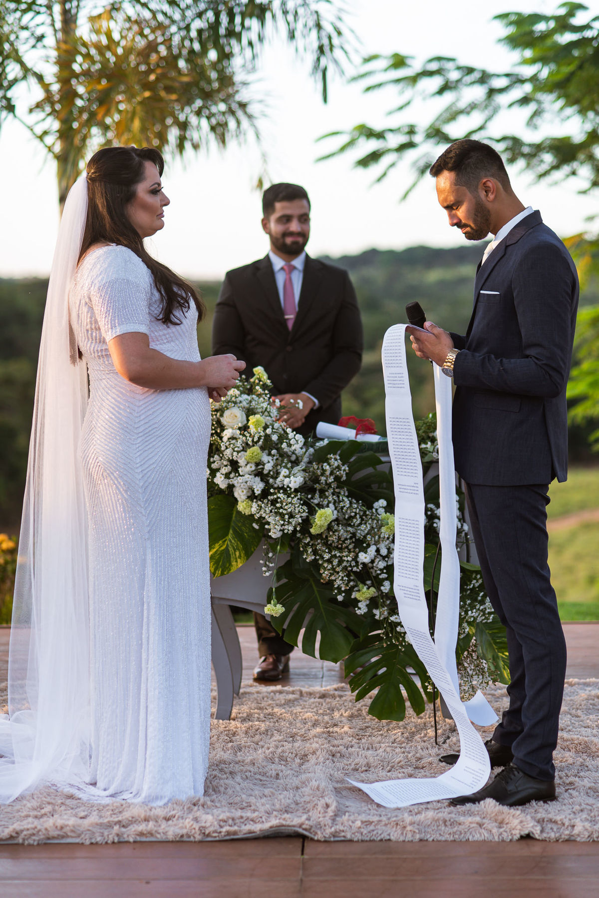 Esse encontro super emocionante teve seu ápice quando Sr. Eugênio beijou e entregou a mão de Dayane para Daniel. Depois de um forte abraço, Daniel ficou frente a frente com sua noiva. Um olhar que dispensava qualquer poesia ou palavra. Enfim, o noivo beijou respeitosamente sua noiva e os dois caminharam junto para receber a bênção de Deus sobre sua união. Tivemos uma palavra abençoada e repleta de pontos muito importantes. Na hora dos votos, Daniel surpreendeu todo mundo sacando um rolo de mais de dois metros de votos a serem lidos. Mas não passava de uma brincadeira. Tudo que ele queria dizer estava escrito ali já nos primeiros pedaços do papel.