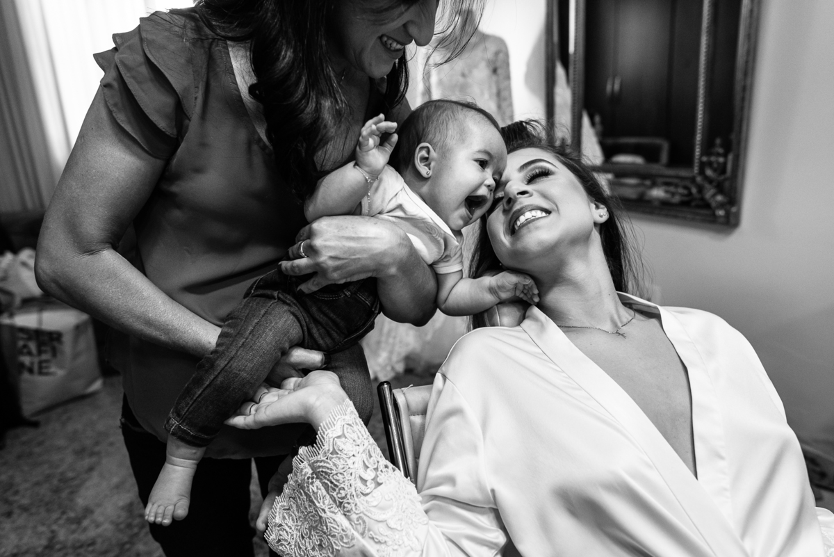 Falar de amor é falar desse casal. Mirelle e Phelipe formam uma dupla e tanto. Ele é mais quietinho, tímido. Mirelle é mais alto astral, comunicativa e sorridente. E quer par melhor do que um completando o outro? Pois bem, começamos o nosso dia de noiva no Espaço Salvatore, onde Mirelle estava sendo produzida. Chegando lá, fui surpreendido pela sobrinha da noiva no colo da mamãe. Gente, é inexplicável como essa menininha linda estava sorridente pra todo lado! O vestidinho em miniatura estava lá do lado do vestido da noiva.