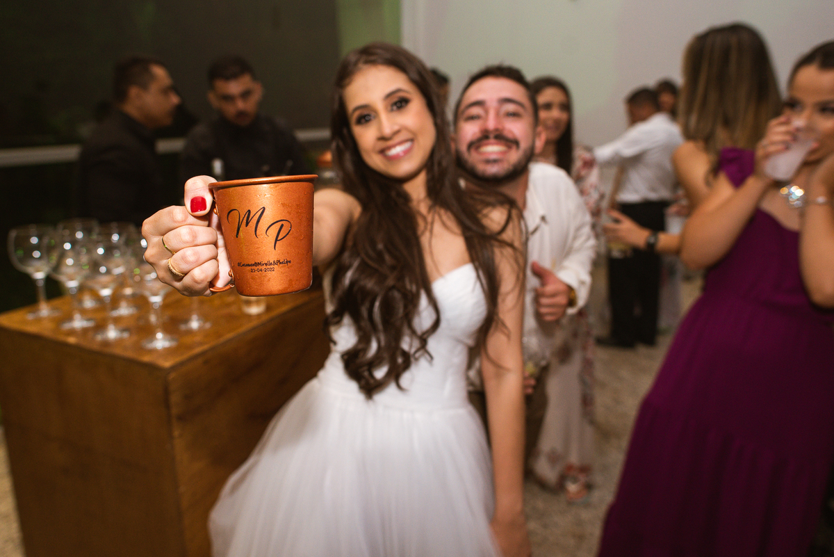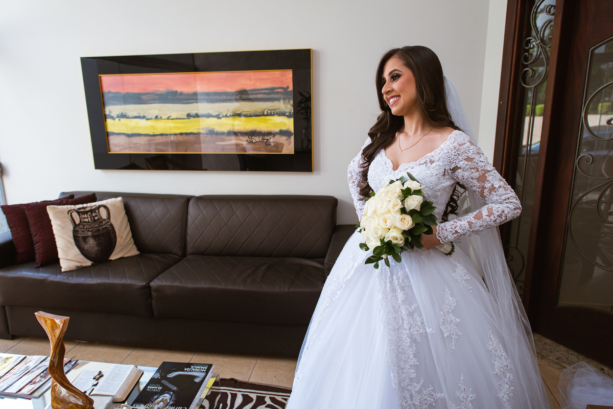 Mirelle estava toda contente, distribuindo sorridos para todos os lados. O vestido escolhido foi da Enlace Maison e caiu como uma luva em seu manequim. A mãe da noiva e suas irmãs também participaram do making of, alegrando ainda mais o grande dia. O brinde foi um charme. Os roupões são tradicionalíssimos para todas, mas você já viu um roupão em miniatura? Pois é, tudo foi pensado para que a pequena daminha participasse junto com as dindinhas. Depois do brinde, fizemos as fotos com as madrinhas e partimos para finalizar a produção.