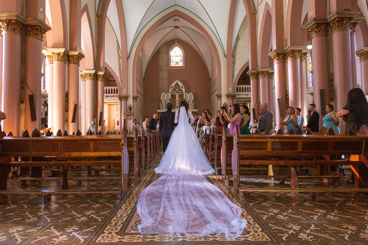 Do outro lado, Mirelle aguardava ansiosamente pelo início da cerimônia. Seu pai a acompanhou durante todas as fotos que fazemos no carro. Participou ativamente e abrilhantou esse momento tão especial. Com sorrisos para ela, beijou sua mão e acompanhou sua caminhada rumo ao altar. Phelipe já entrava com sua mãe e lá na frente aguardava sua noiva. Os padrinhos e os pajens fizeram suas entradas de forma excepcional. A daminha que estava lá no salão com a noiva entrou em um carrinho, sendo levada por outra daminha. Foi um momento muito especial! Agora, já com as portas fechadas, o músico já iniciou a marcha nupcial. Aquele som ecoava por toda a Igreja e arrepiava todos os convidados.