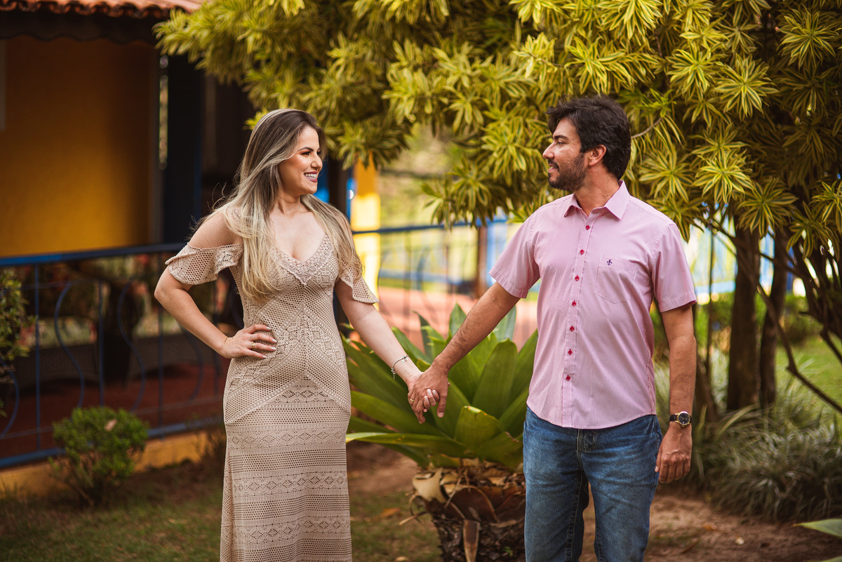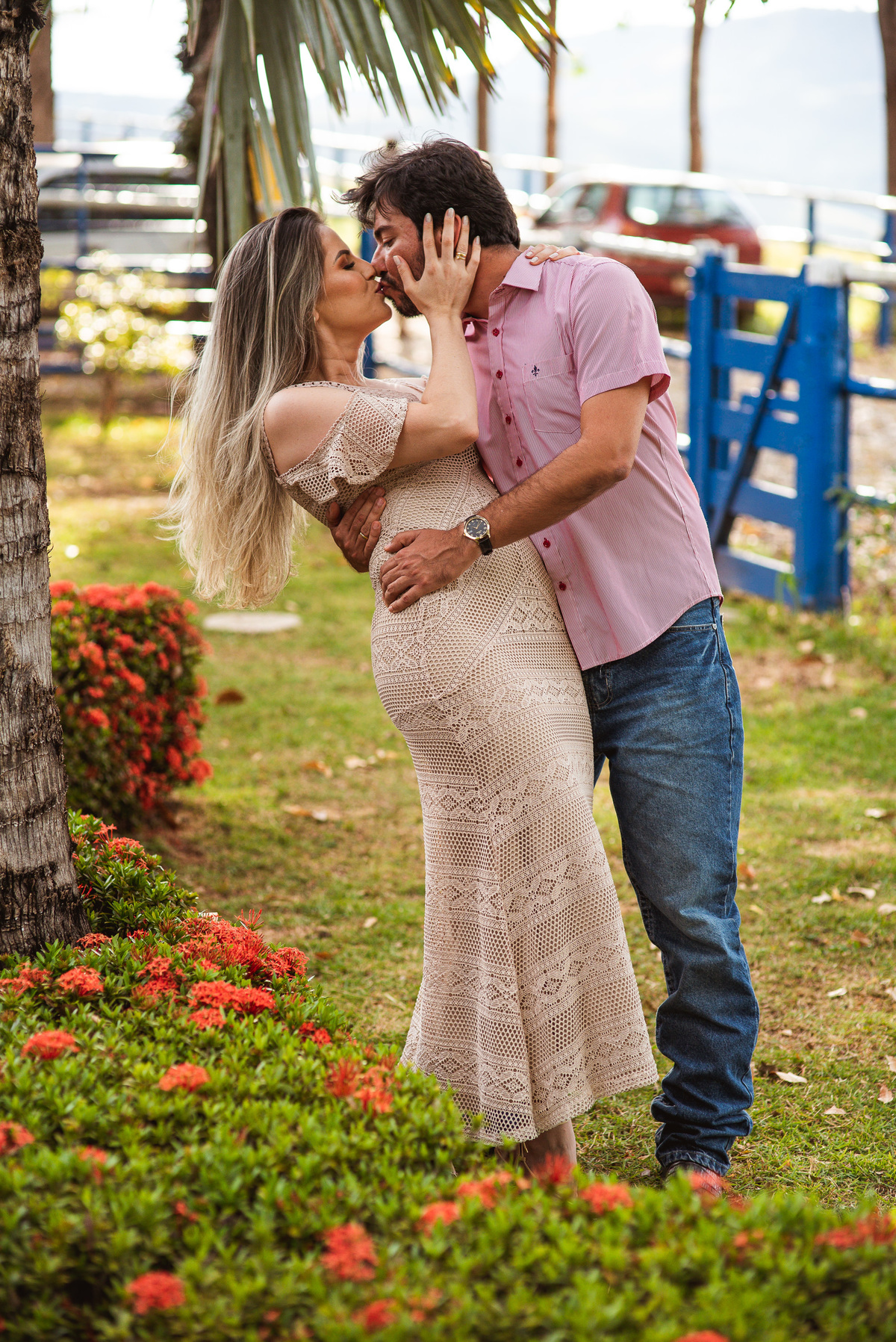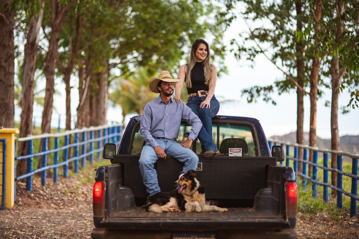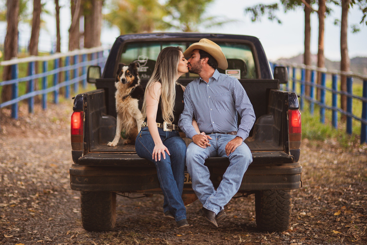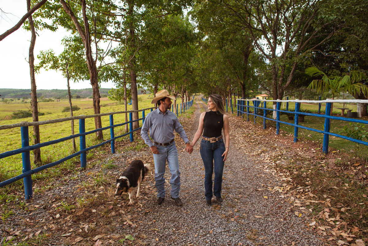 A chegada da fazenda já mostrava o quão lindo ela era. O dono escolheu as cores azul e amarelo e por onde passávamos, tudo estava parecendo que havia acabado de ser pintado. O jardim estava lindo e cada cantinho ali remetia a memória dos dois. Passeamos e fotografamos em cada lugar dentro da propriedade. Chegamos também no pequeno quiosque onde os dois se encontraram pela primeira vez. Além disso, ali onde o o primeiro beijo aconteceu. Eu, que não sou bobo nem nada, já pedi pra eles repetirem a cena e registrei tudo. Léo tem um cachorro lindo que o acompanha sempre nas viagens pra fazenda. E claro que ele não deixaria seu companheiro de fora do ensaio. Teve latido, corrida, lambeijo e tudo mais. Foi incrível!
