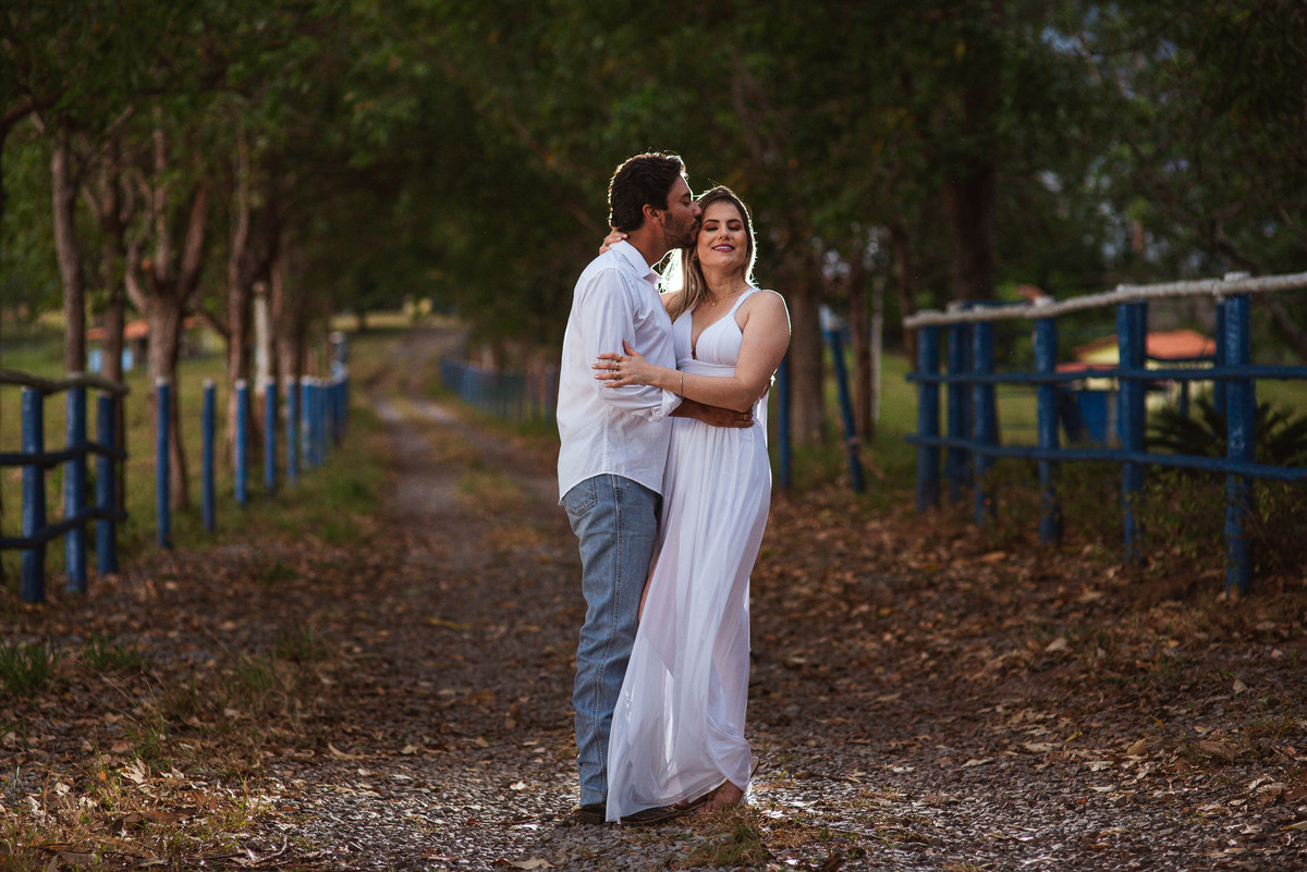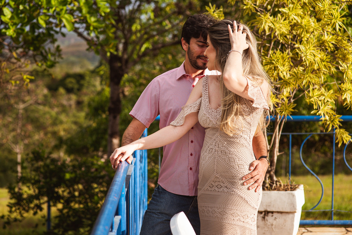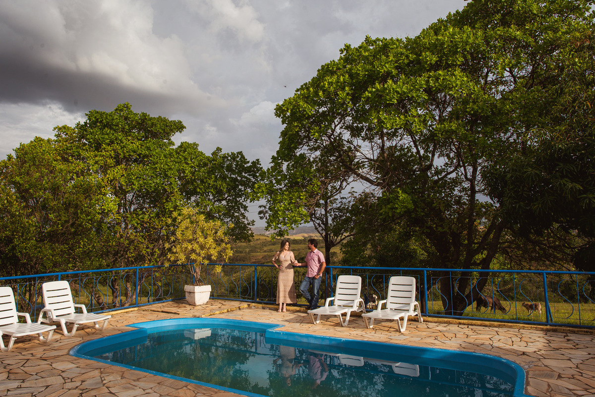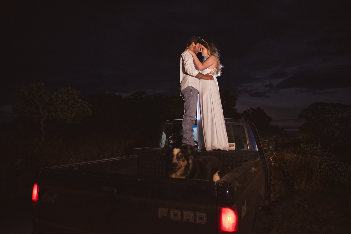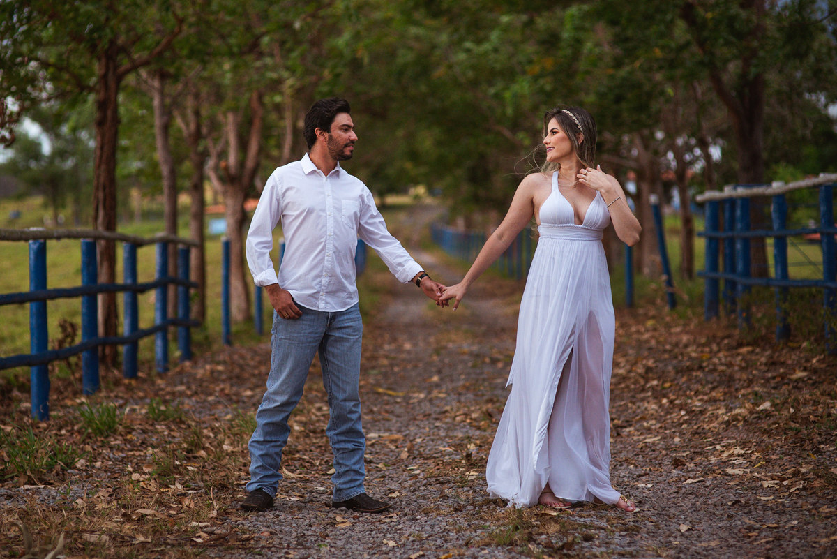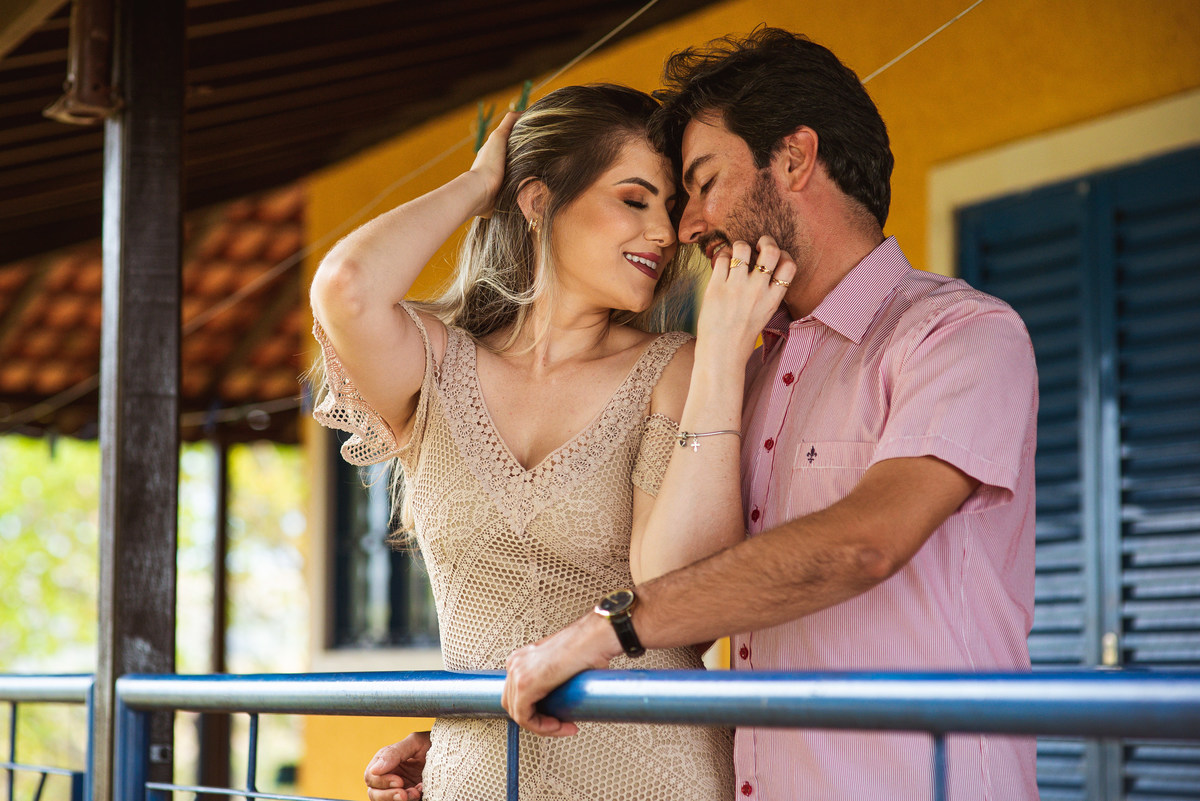 A chegada da fazenda já mostrava o quão lindo ela era. O dono escolheu as cores azul e amarelo e por onde passávamos, tudo estava parecendo que havia acabado de ser pintado. O jardim estava lindo e cada cantinho ali remetia a memória dos dois. Passeamos e fotografamos em cada lugar dentro da propriedade. Chegamos também no pequeno quiosque onde os dois se encontraram pela primeira vez. Além disso, ali onde o o primeiro beijo aconteceu. Eu, que não sou bobo nem nada, já pedi pra eles repetirem a cena e registrei tudo. Léo tem um cachorro lindo que o acompanha sempre nas viagens pra fazenda. E claro que ele não deixaria seu companheiro de fora do ensaio. Teve latido, corrida, lambeijo e tudo mais. Foi incrível!
