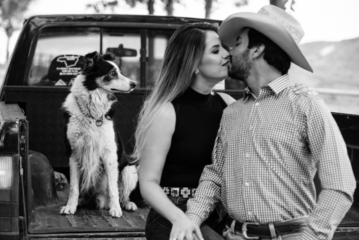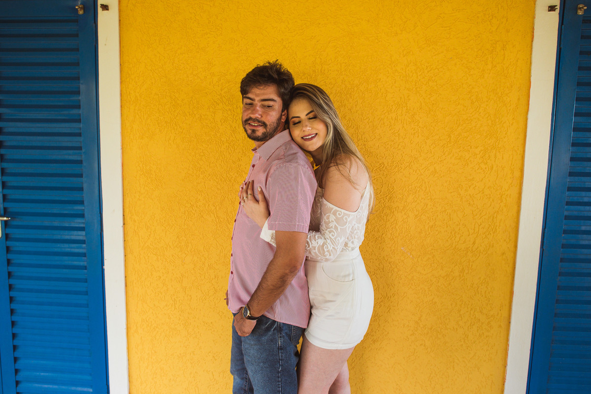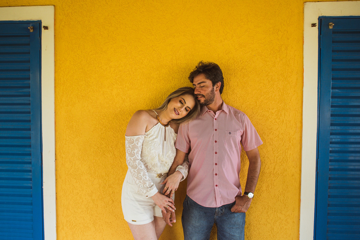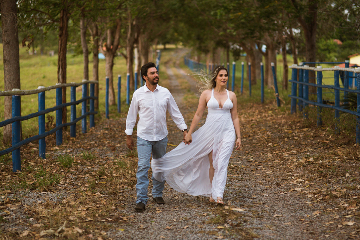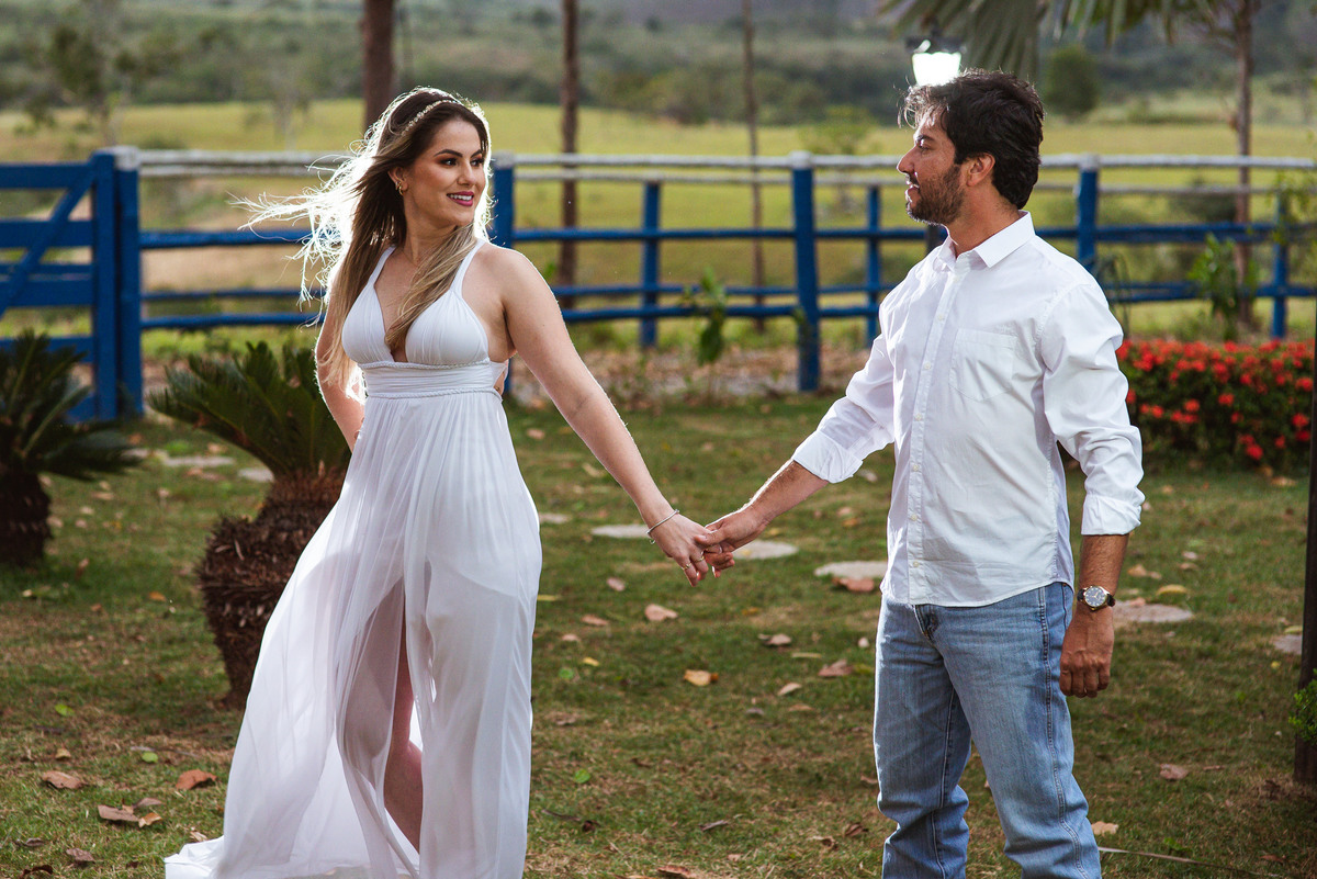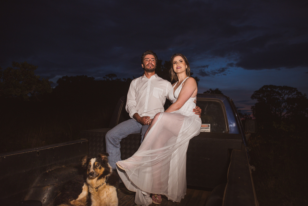A chegada da fazenda já mostrava o quão lindo ela era. O dono escolheu as cores azul e amarelo e por onde passávamos, tudo estava parecendo que havia acabado de ser pintado. O jardim estava lindo e cada cantinho ali remetia a memória dos dois. Passeamos e fotografamos em cada lugar dentro da propriedade. Chegamos também no pequeno quiosque onde os dois se encontraram pela primeira vez. Além disso, ali onde o o primeiro beijo aconteceu. Eu, que não sou bobo nem nada, já pedi pra eles repetirem a cena e registrei tudo. Léo tem um cachorro lindo que o acompanha sempre nas viagens pra fazenda. E claro que ele não deixaria seu companheiro de fora do ensaio. Teve latido, corrida, lambeijo e tudo mais. Foi incrível!