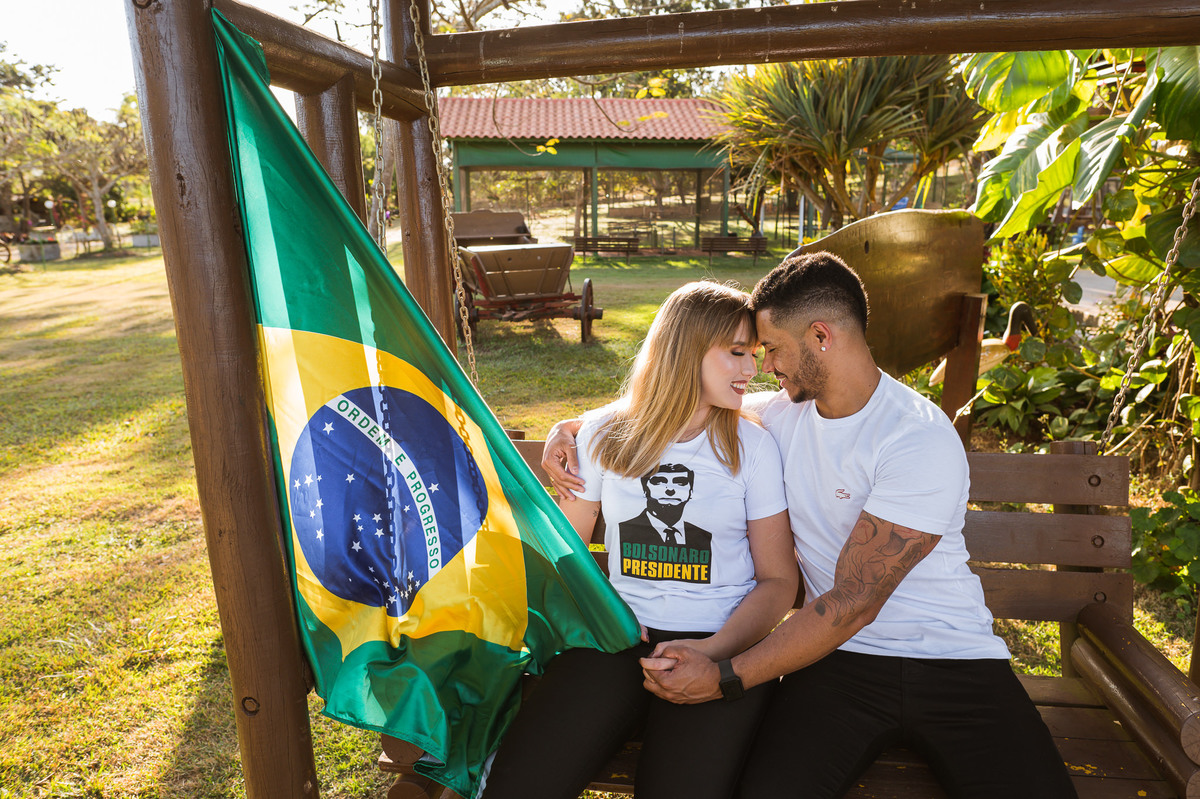 Hoje é dia de postar um ensaio muito bacana, realizado no espaço Cantinho da Natureza. Mariana e Ronan fizeram questão de demonstrar todo seu amor pelo Presidente da República e pelo Brasil, vestindo a camiseta com o rosto de Bolsonaro, além da bandeira nacional que emoldurou parte das fotos do ensaio. O cantinho da natureza é lindo por si só, agora envolvendo o amor desses dois fez tudo ficar mais lindo ainda.