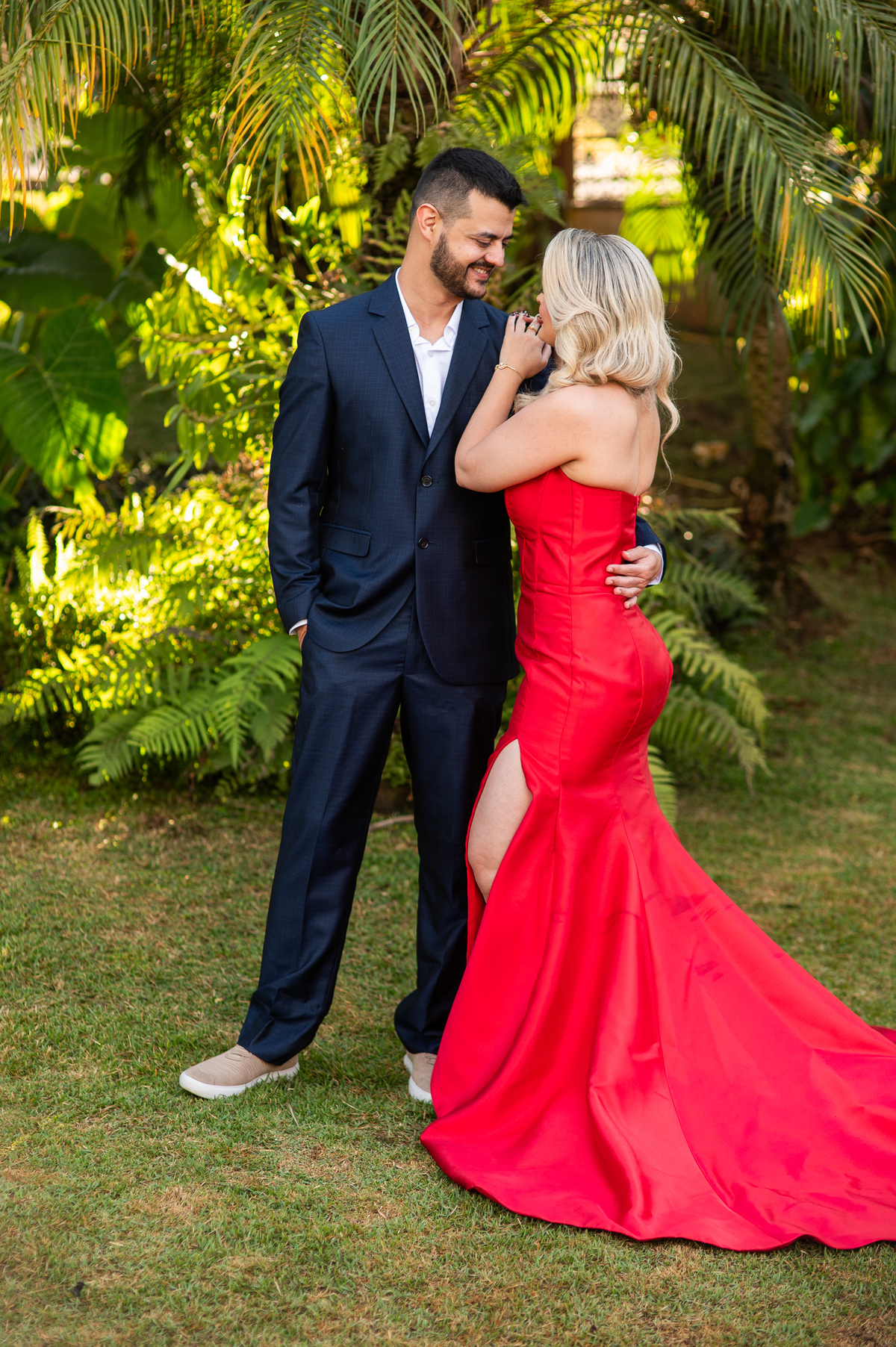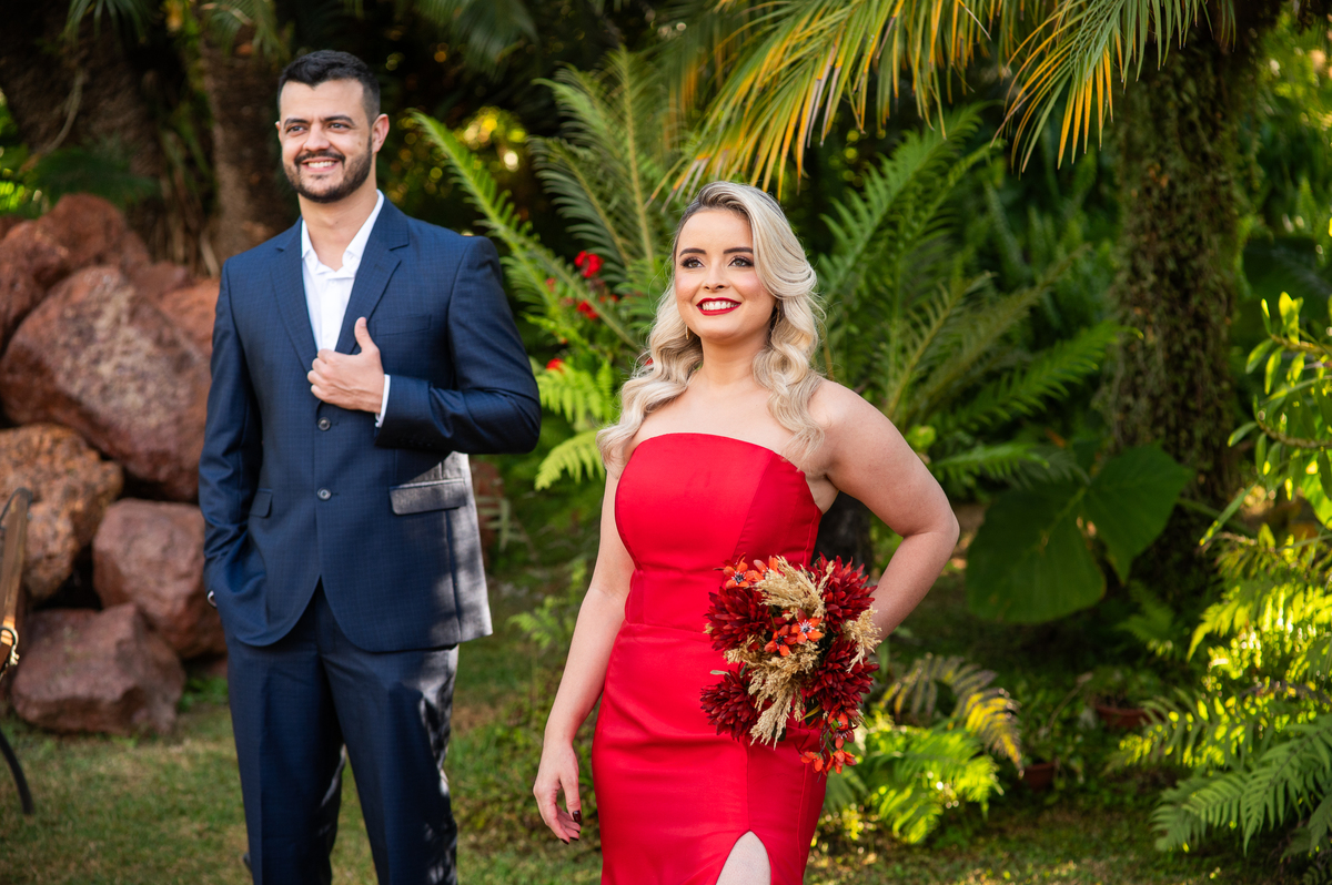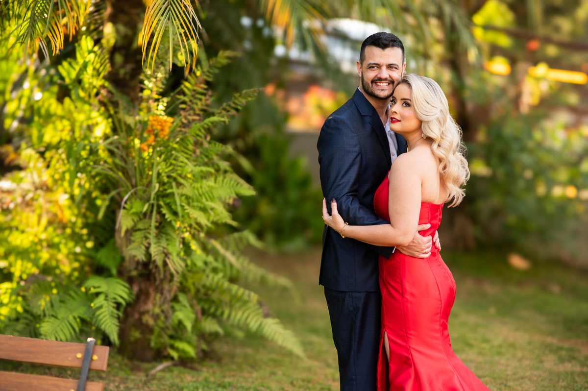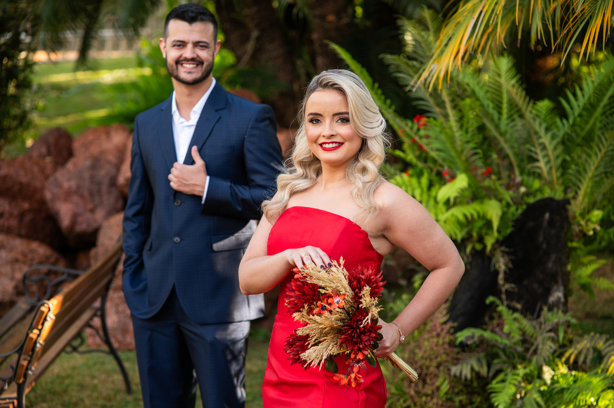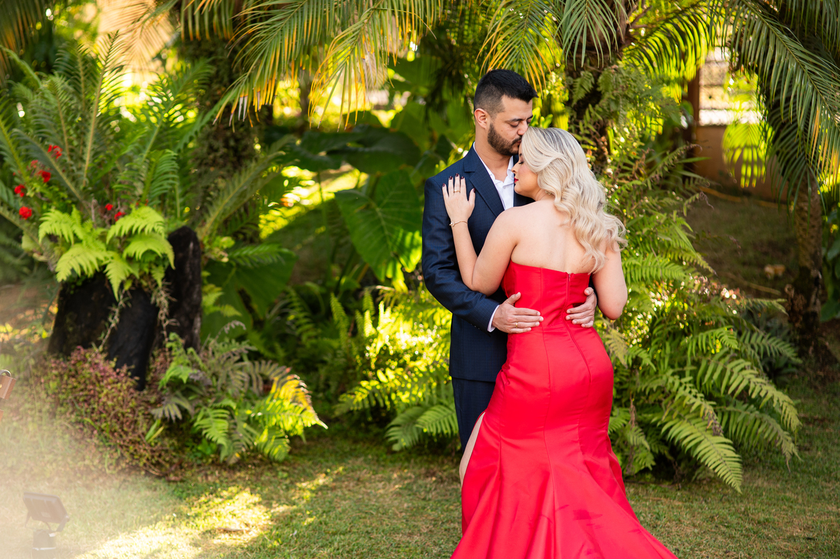Começamos nosso ensaio no maravilhoso espaço Amorim Garden, onde fizemos belíssimas fotografias. Ana Carolina estava com um vestido vermelho impecável. O sol reluzia por entre meio as flores que existem por lá e o vermelho do vestido se destacava. Ana estava muito feliz e sorridente, ambos muito tranquilos com o momento. E isso é de fundamental importância. Eu sempre digo aos meus casais que a única coisa que precisamos é deles estarem bem no dia. Isso é o suficiente para o sucesso do ensaio. Percorremos vários lugares dentro do espaço de fotos e registramos tudo. Ao final da tarde, ainda fui surpreendido com uma super motocicleta que faria parte do ensaio e eu não sabia. Carol preparou todos os looks combinando com cada conjunto.