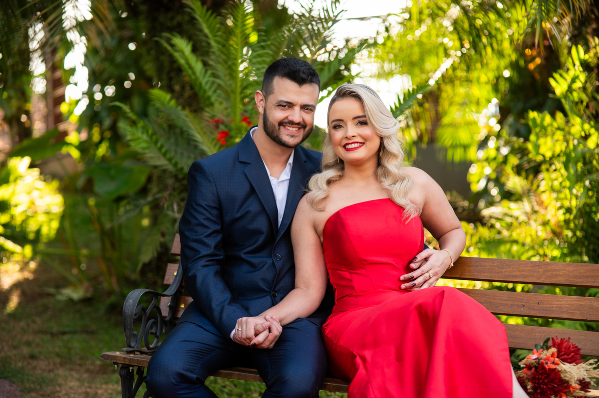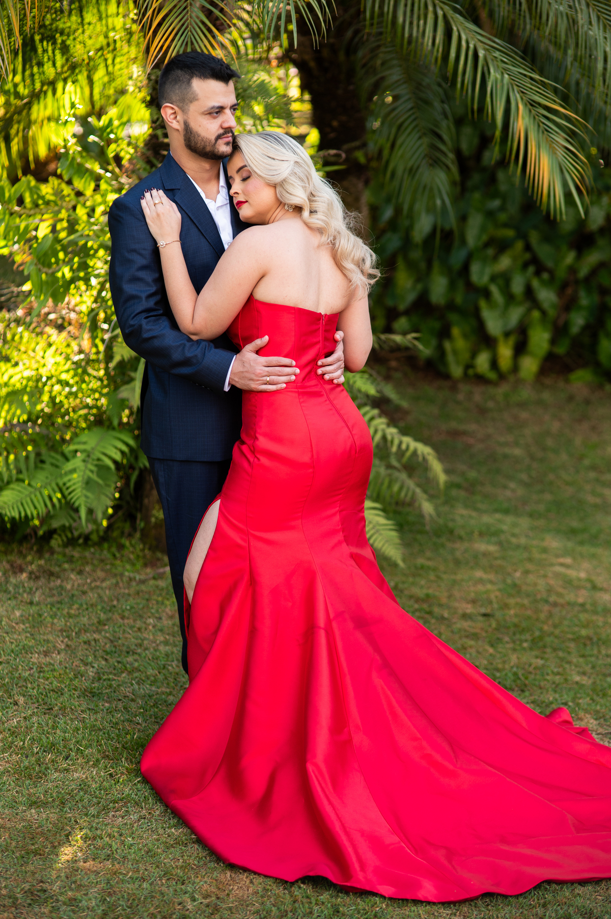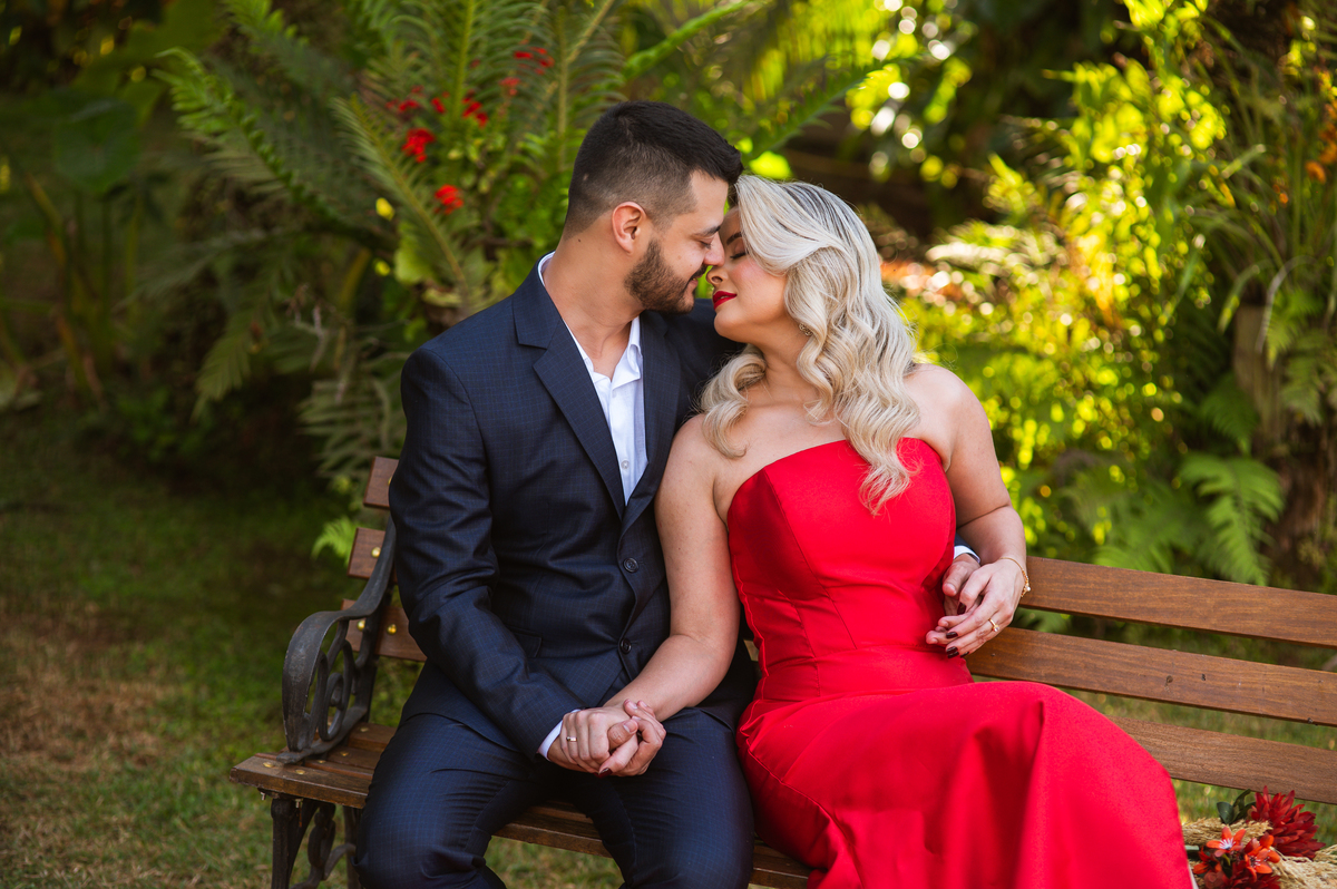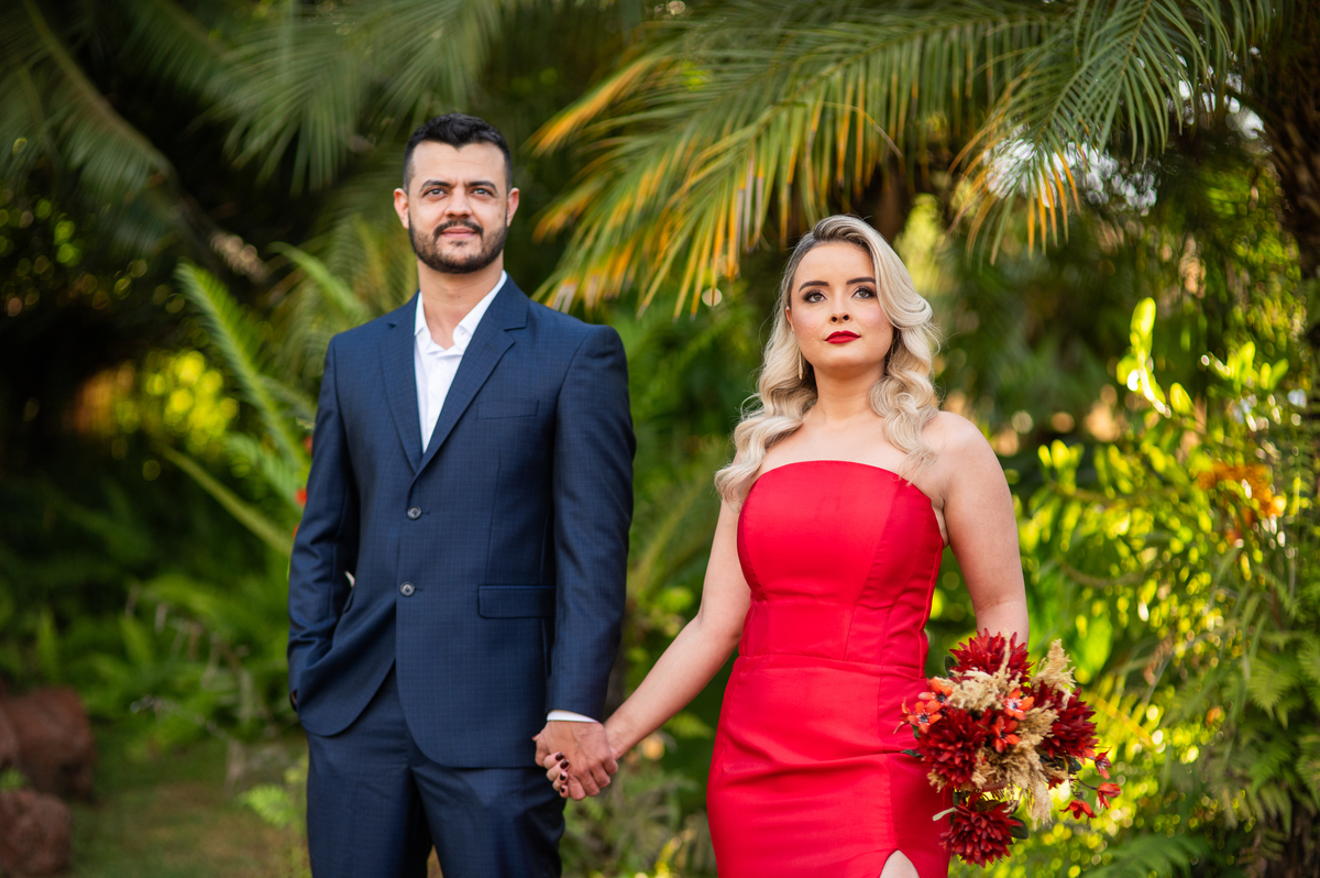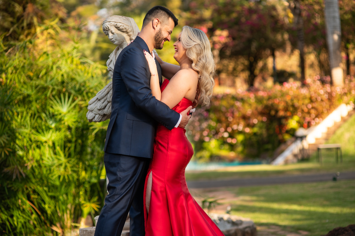Começamos nosso ensaio no maravilhoso espaço Amorim Garden, onde fizemos belíssimas fotografias. Ana Carolina estava com um vestido vermelho impecável. O sol reluzia por entre meio as flores que existem por lá e o vermelho do vestido se destacava. Ana estava muito feliz e sorridente, ambos muito tranquilos com o momento. E isso é de fundamental importância. Eu sempre digo aos meus casais que a única coisa que precisamos é deles estarem bem no dia. Isso é o suficiente para o sucesso do ensaio. Percorremos vários lugares dentro do espaço de fotos e registramos tudo. Ao final da tarde, ainda fui surpreendido com uma super motocicleta que faria parte do ensaio e eu não sabia. Carol preparou todos os looks combinando com cada conjunto.