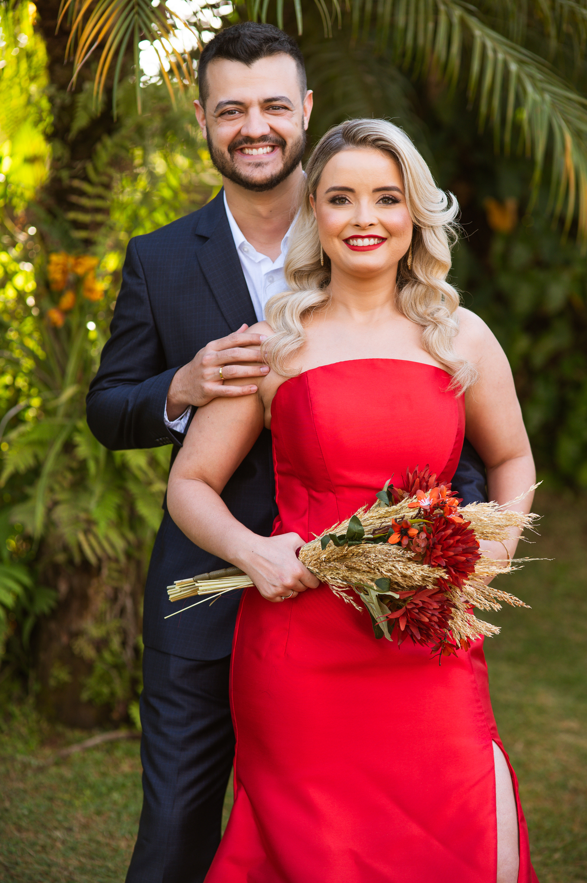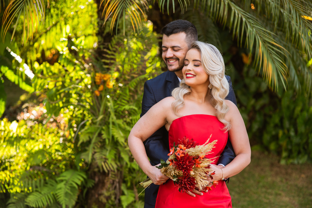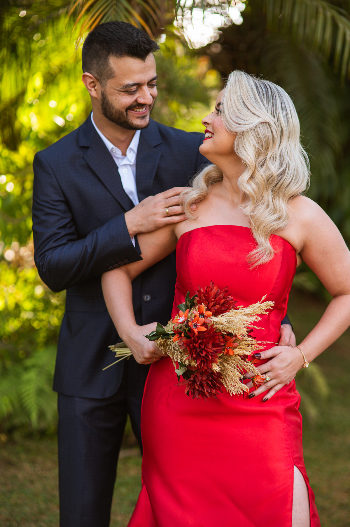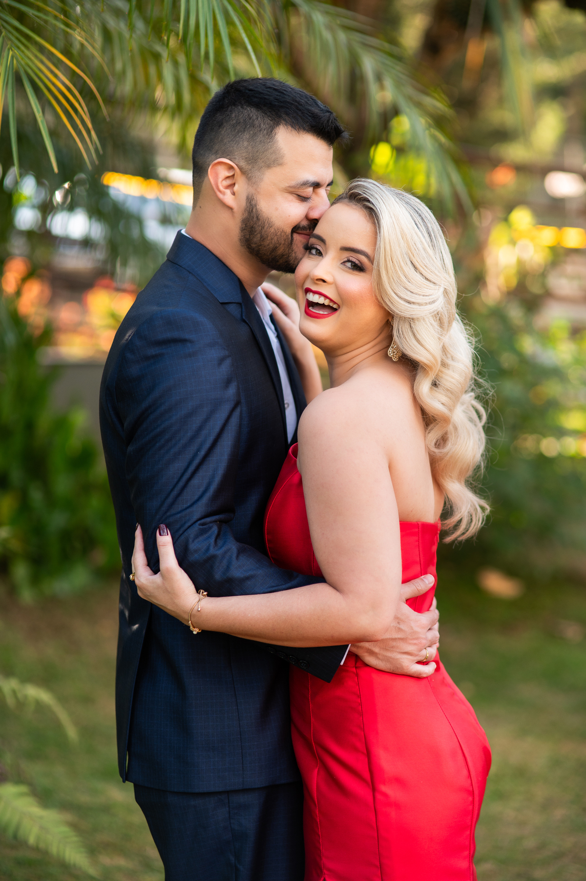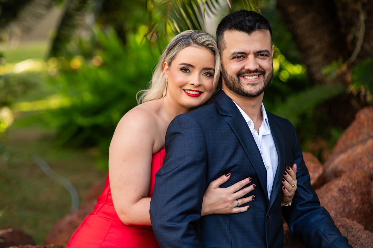 Começamos nosso ensaio no maravilhoso espaço Amorim Garden, onde fizemos belíssimas fotografias. Ana Carolina estava com um vestido vermelho impecável. O sol reluzia por entre meio as flores que existem por lá e o vermelho do vestido se destacava. Ana estava muito feliz e sorridente, ambos muito tranquilos com o momento. E isso é de fundamental importância. Eu sempre digo aos meus casais que a única coisa que precisamos é deles estarem bem no dia. Isso é o suficiente para o sucesso do ensaio. Percorremos vários lugares dentro do espaço de fotos e registramos tudo. Ao final da tarde, ainda fui surpreendido com uma super motocicleta que faria parte do ensaio e eu não sabia. Carol preparou todos os looks combinando com cada conjunto.