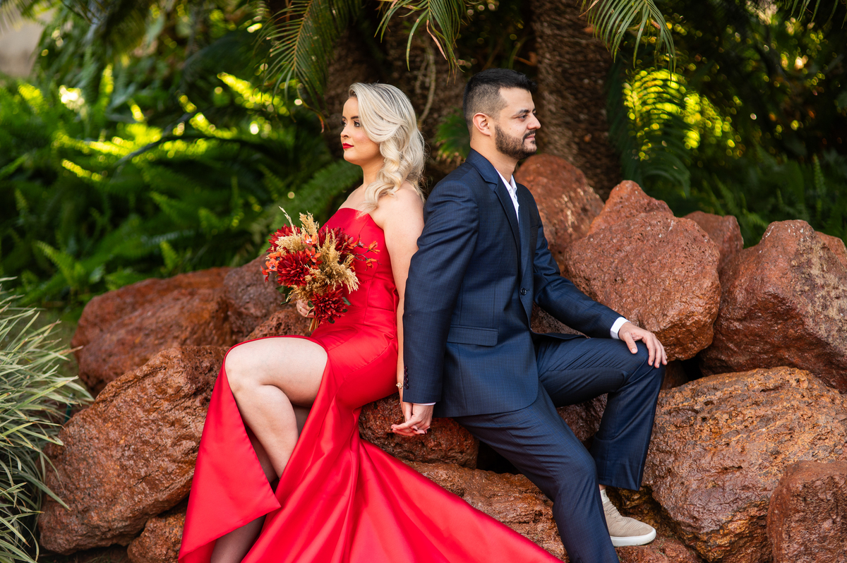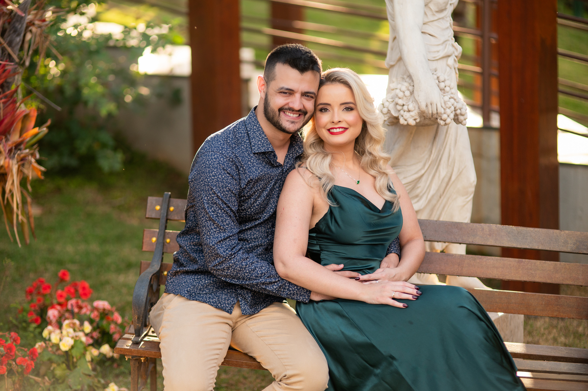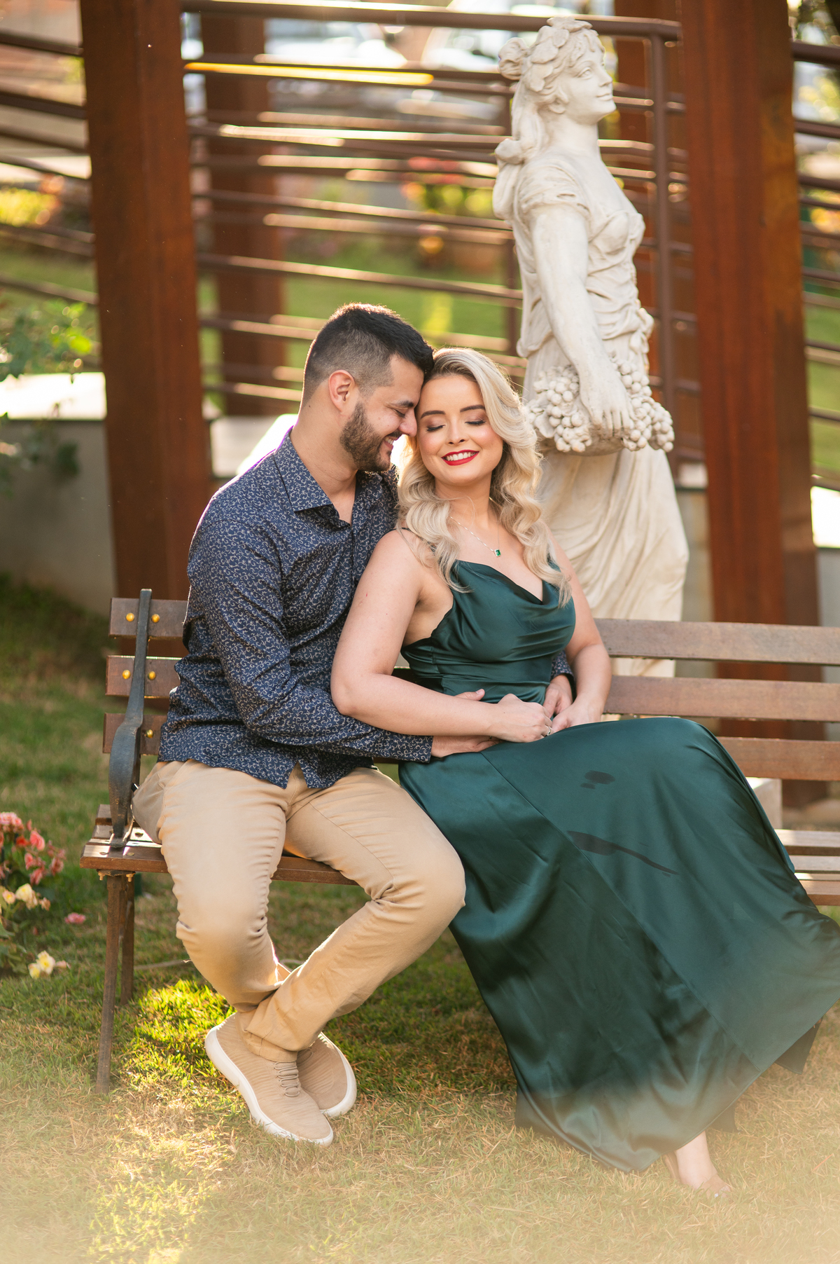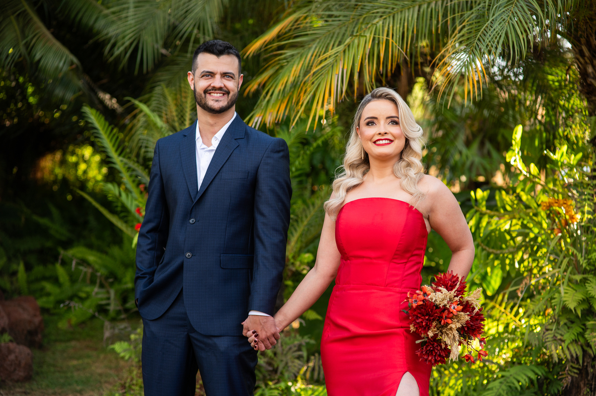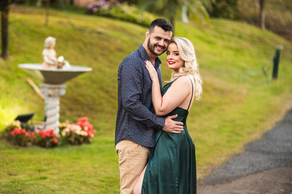 Começamos nosso ensaio no maravilhoso espaço Amorim Garden, onde fizemos belíssimas fotografias. Ana Carolina estava com um vestido vermelho impecável. O sol reluzia por entre meio as flores que existem por lá e o vermelho do vestido se destacava. Ana estava muito feliz e sorridente, ambos muito tranquilos com o momento. E isso é de fundamental importância. Eu sempre digo aos meus casais que a única coisa que precisamos é deles estarem bem no dia. Isso é o suficiente para o sucesso do ensaio. Percorremos vários lugares dentro do espaço de fotos e registramos tudo. Ao final da tarde, ainda fui surpreendido com uma super motocicleta que faria parte do ensaio e eu não sabia. Carol preparou todos os looks combinando com cada conjunto.