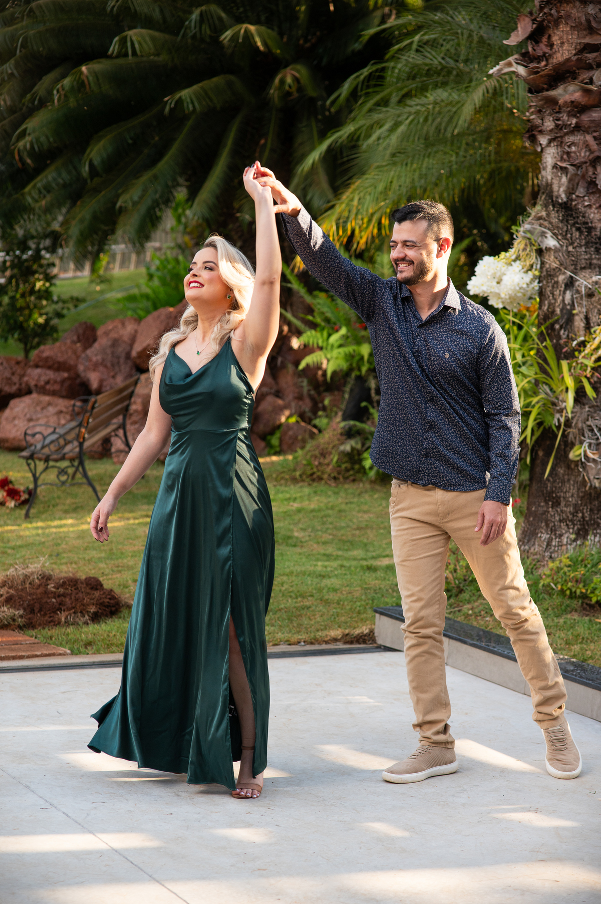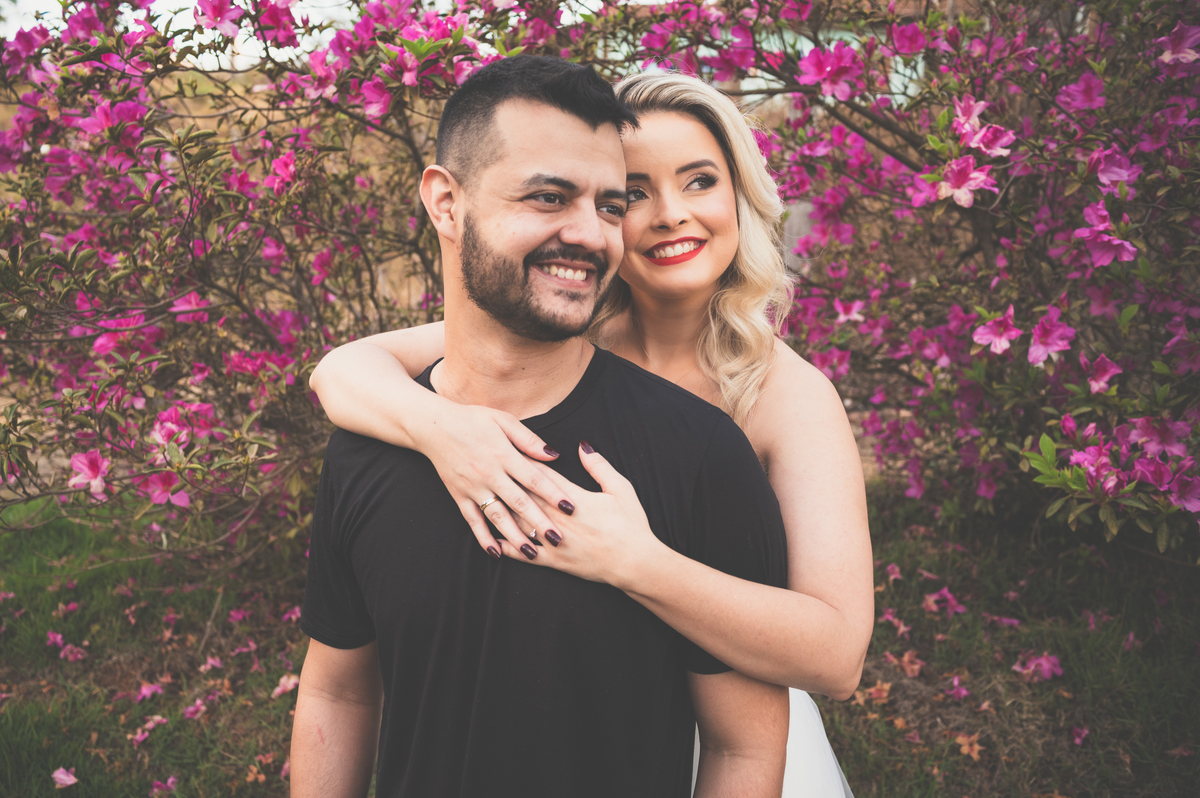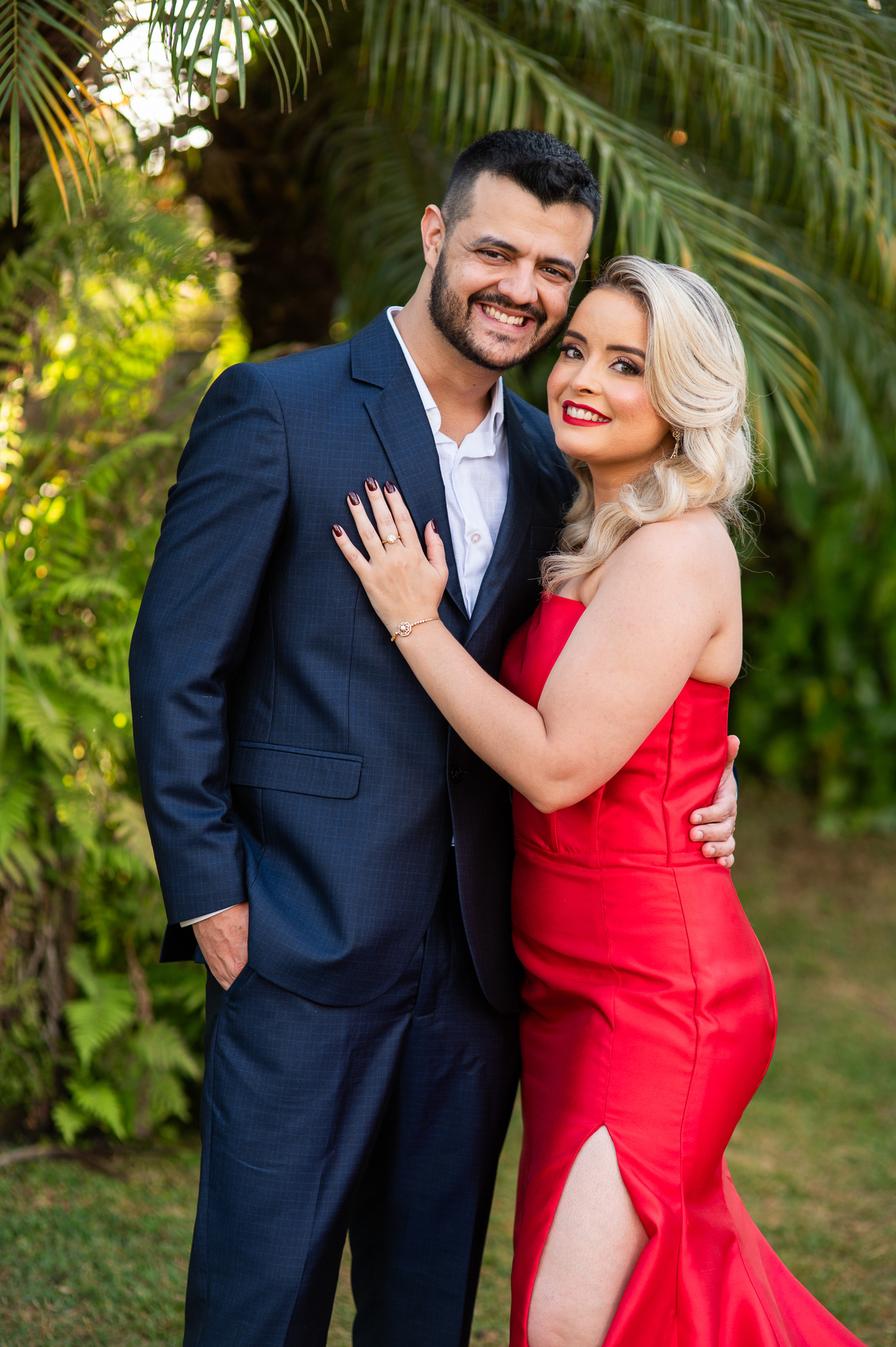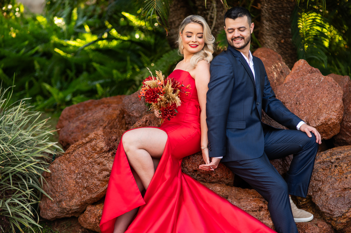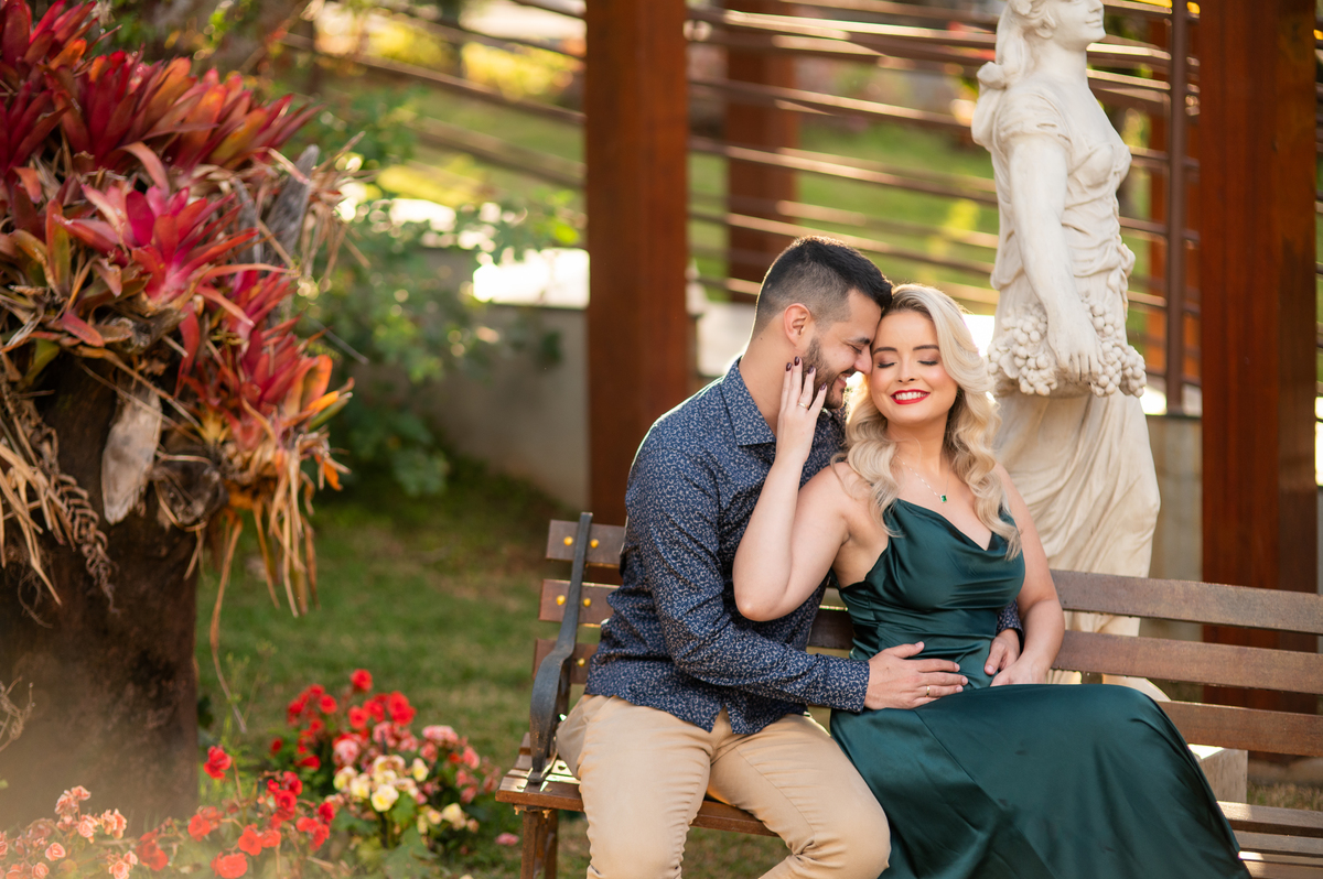 Começamos nosso ensaio no maravilhoso espaço Amorim Garden, onde fizemos belíssimas fotografias. Ana Carolina estava com um vestido vermelho impecável. O sol reluzia por entre meio as flores que existem por lá e o vermelho do vestido se destacava. Ana estava muito feliz e sorridente, ambos muito tranquilos com o momento. E isso é de fundamental importância. Eu sempre digo aos meus casais que a única coisa que precisamos é deles estarem bem no dia. Isso é o suficiente para o sucesso do ensaio. Percorremos vários lugares dentro do espaço de fotos e registramos tudo. Ao final da tarde, ainda fui surpreendido com uma super motocicleta que faria parte do ensaio e eu não sabia. Carol preparou todos os looks combinando com cada conjunto.
