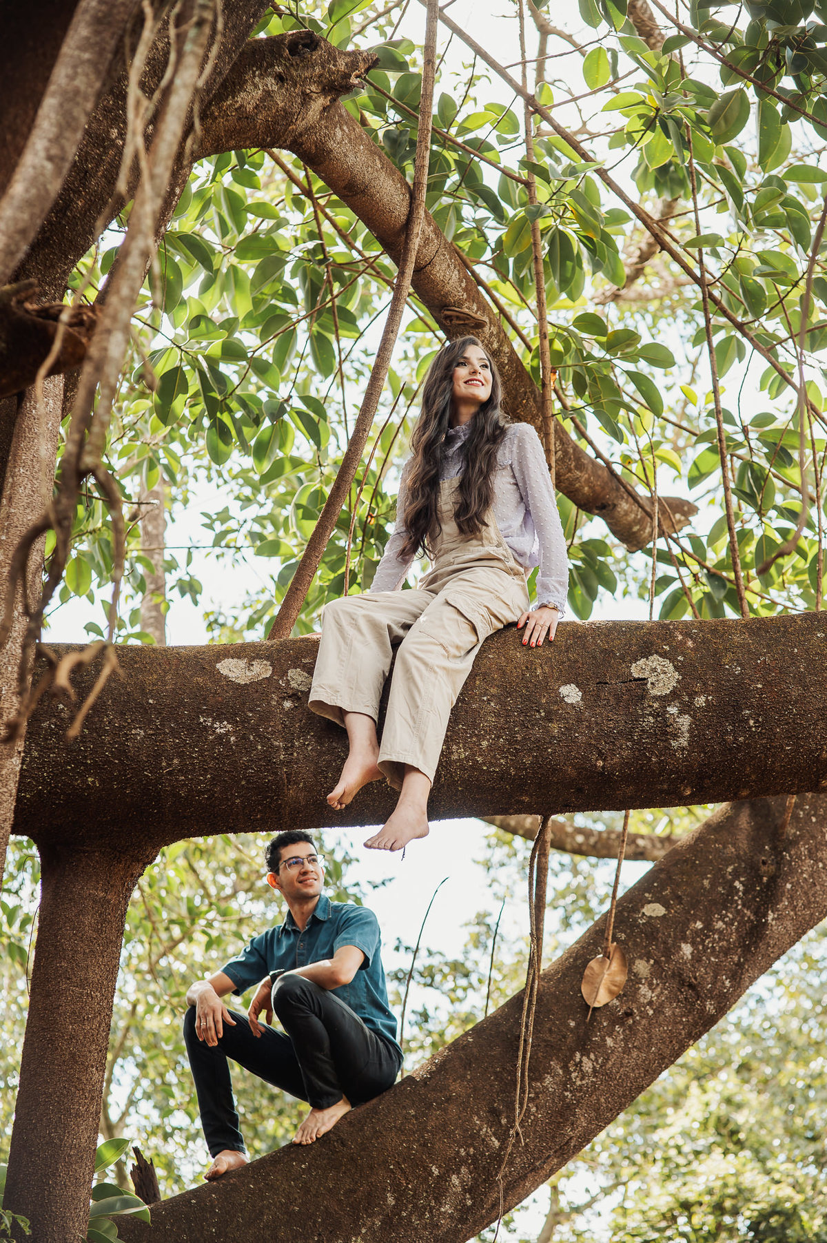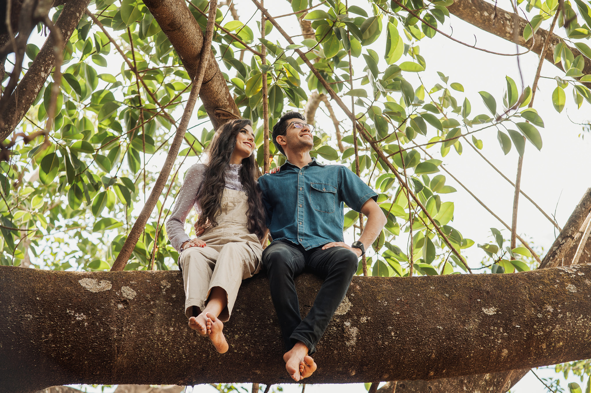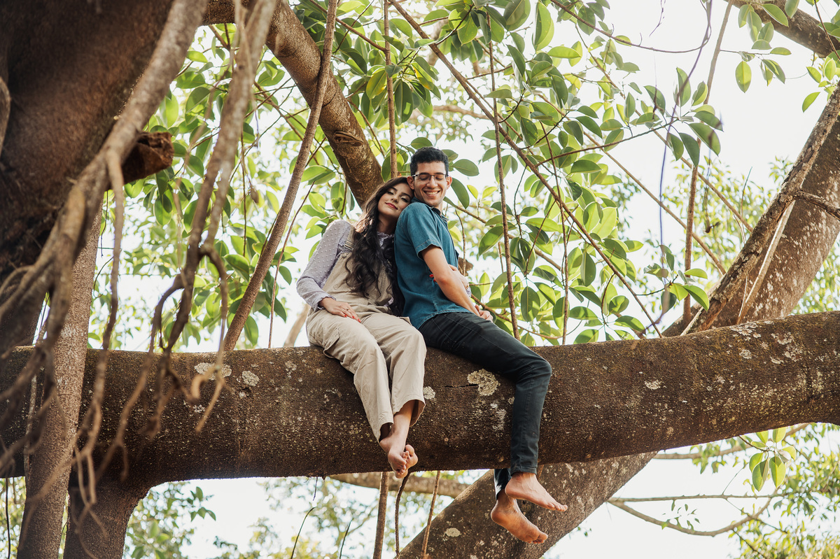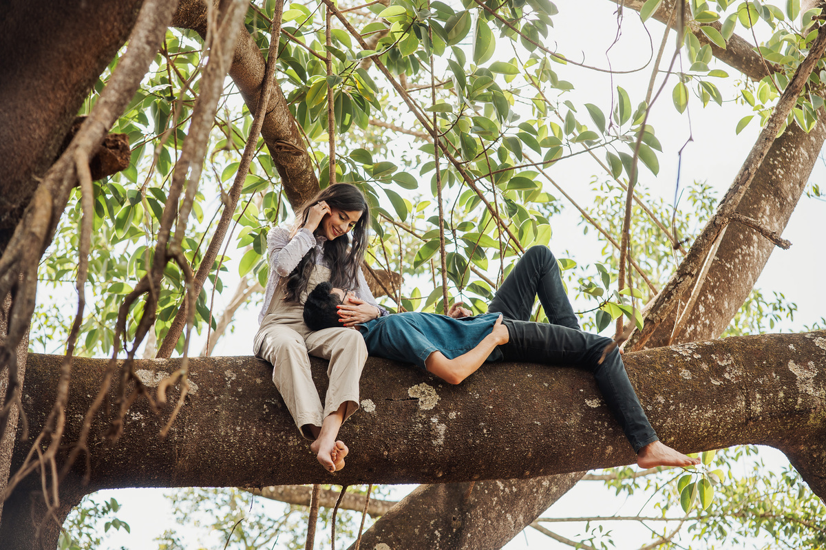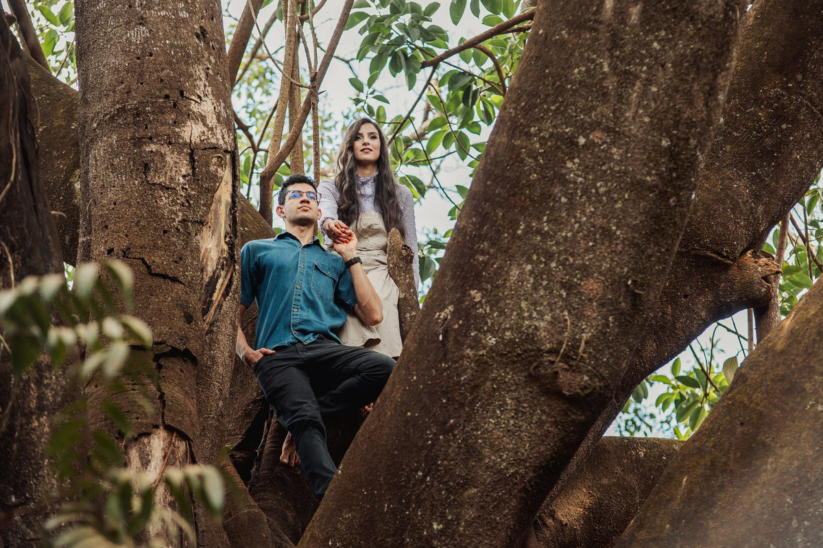 Conversamos muito e chegamos no local onde combinamos anteriormente. Eles tem o costume de passear por esse lugar e queriam que ficasse registrado no seu ensaio. E assim fizemos. O local é bem diferente de tudo que tenho acostumado a fazer. Chegamos em uma grande árvore, e eu pensei comigo: Como será que eles querem essas fotos aqui? Quando eu menos espero, os dois me respondem: Iremos subir lá naquele galho, apontando pra cima. Pensei, o que? Não é possível. Pois vocês verão com seus próprios olhos nas fotos. Eles subiram numa velocidade e destreza que há muitos anos não via.