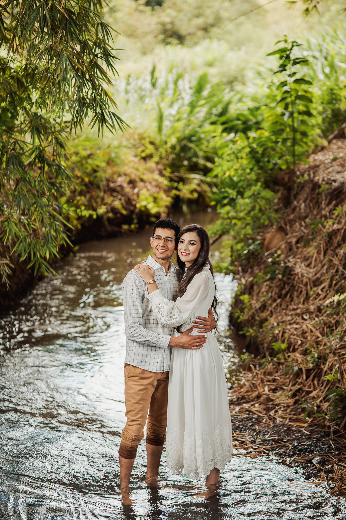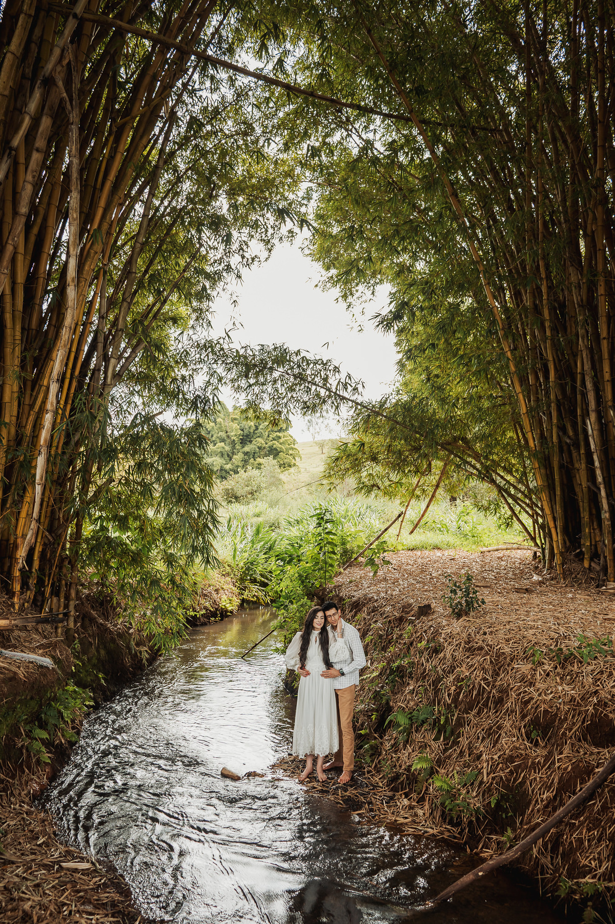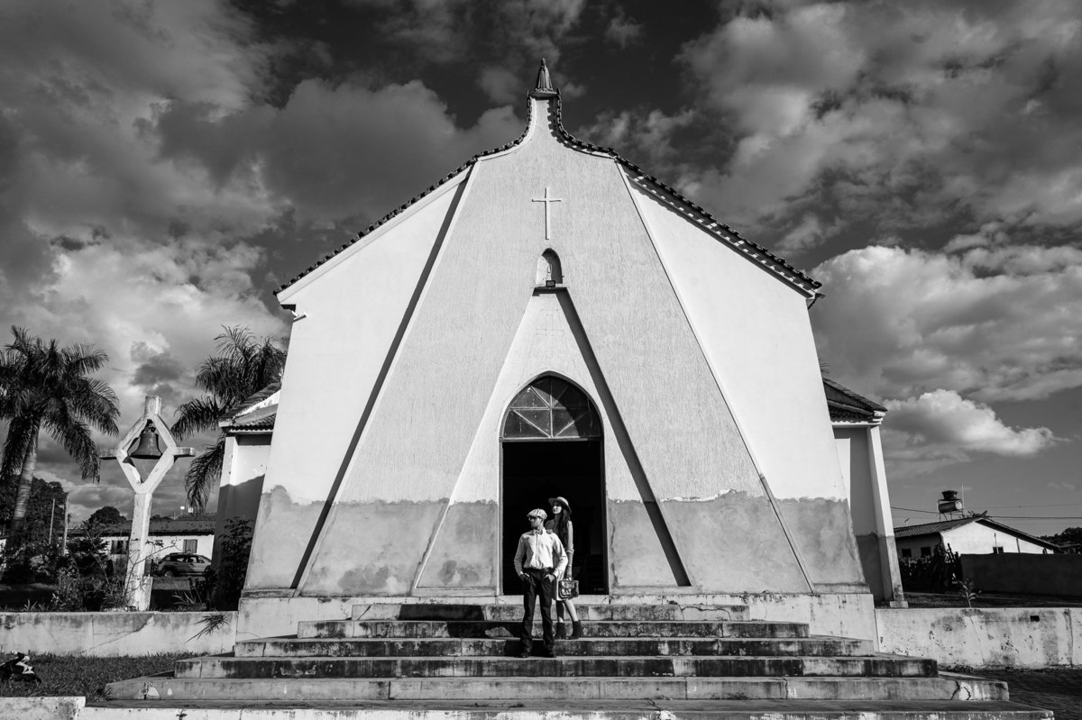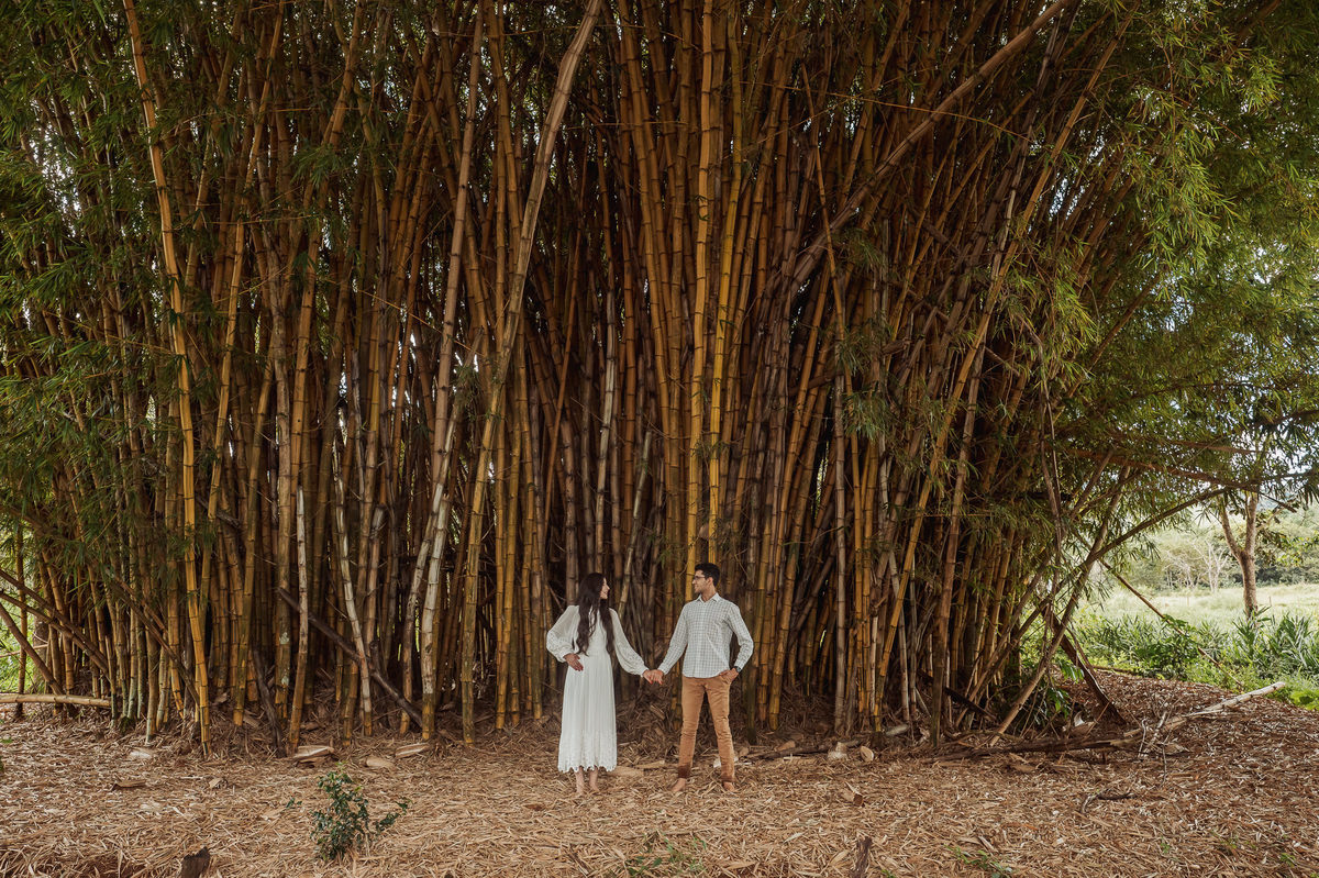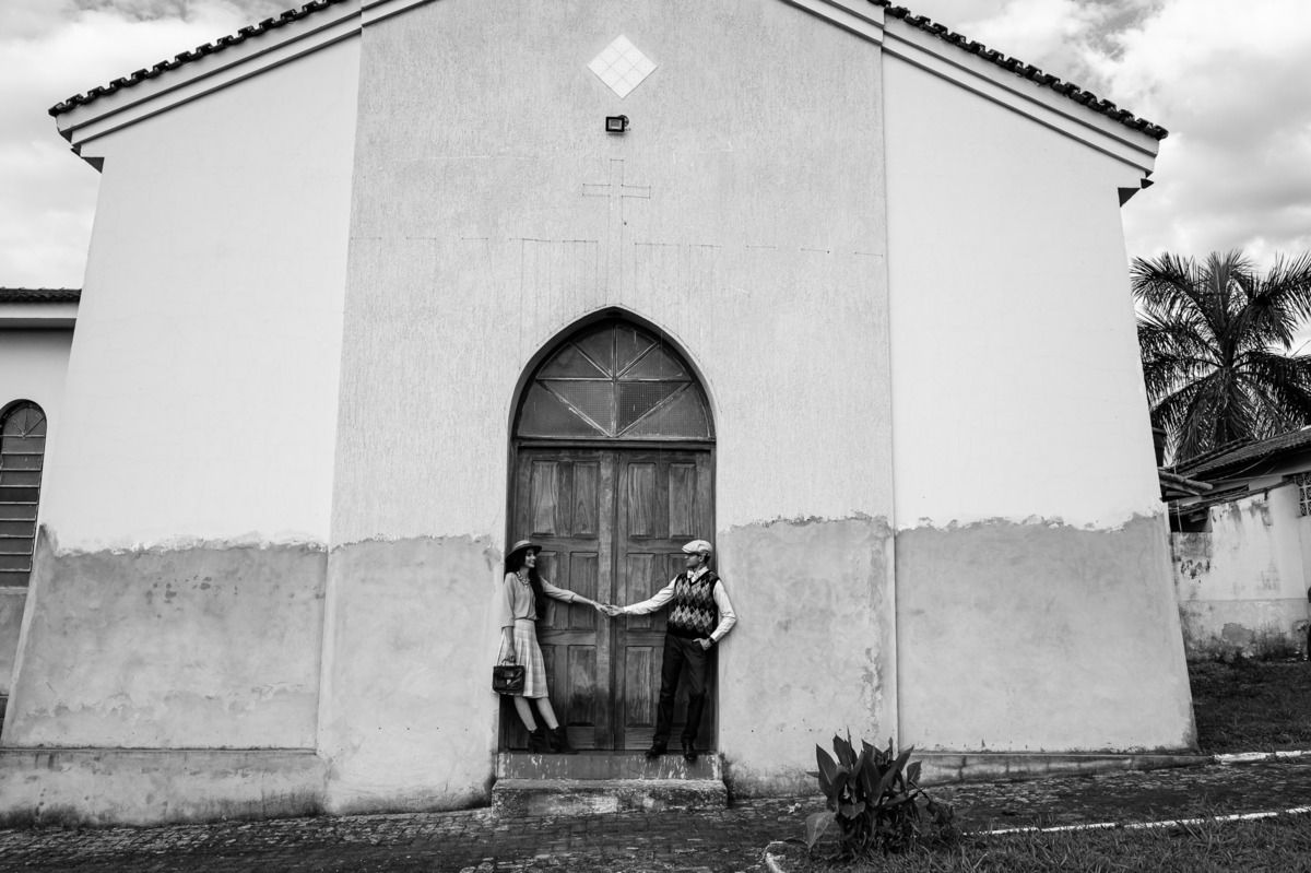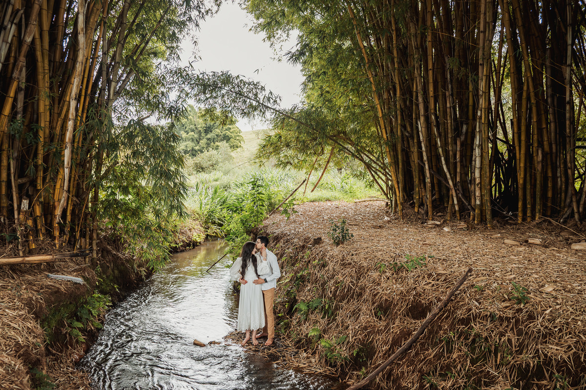 Começamos por lá registrando esse talento deles em subir nas árvores. E eles já tinham esse costume. O noivo é biólogo e a noiva sua companheira de aventuras. Depois, passamos pelo povoado de Arraial dos Afonsos, onde aproveitamos a Capela aberta para usar a estrutura como fundo das fotos. Eles fizeram questão de usar seu look temporal para casar com o envelhecido do local. Ficou lindo demais. Depois, passamos pela estrada e chegamos em um grande bambuzal. Por entre ele, passa um córrego muito simplório. Fotografamos com o bambuzal de fundo e também deles dentro do lago.