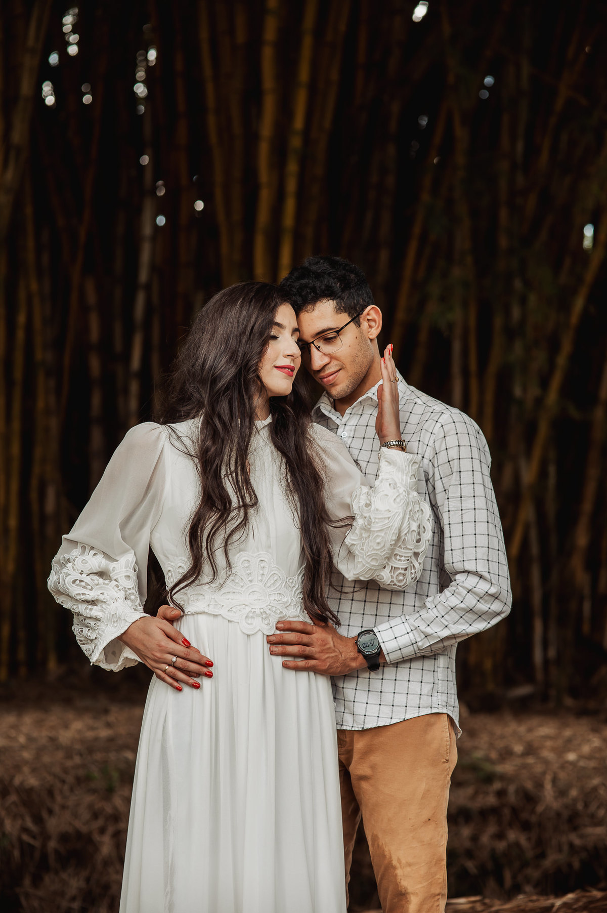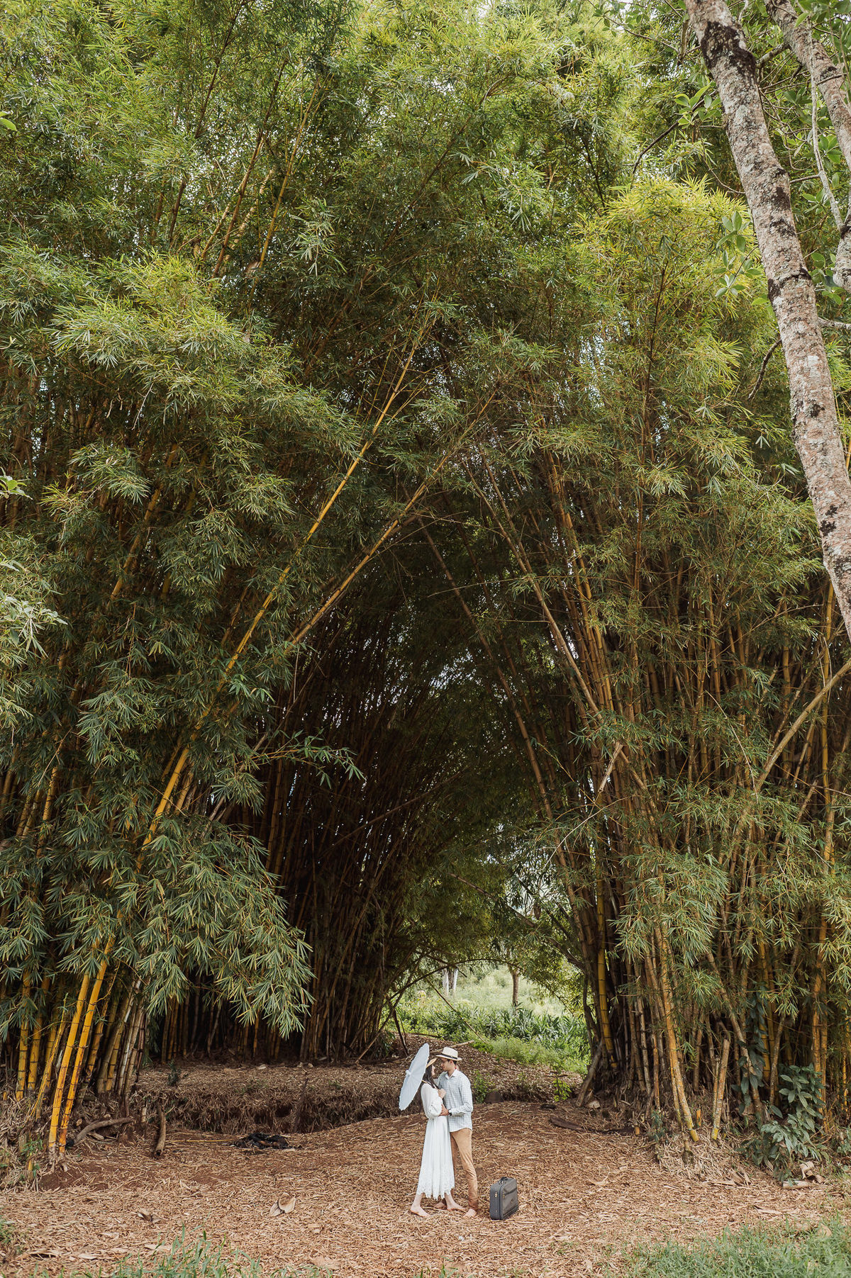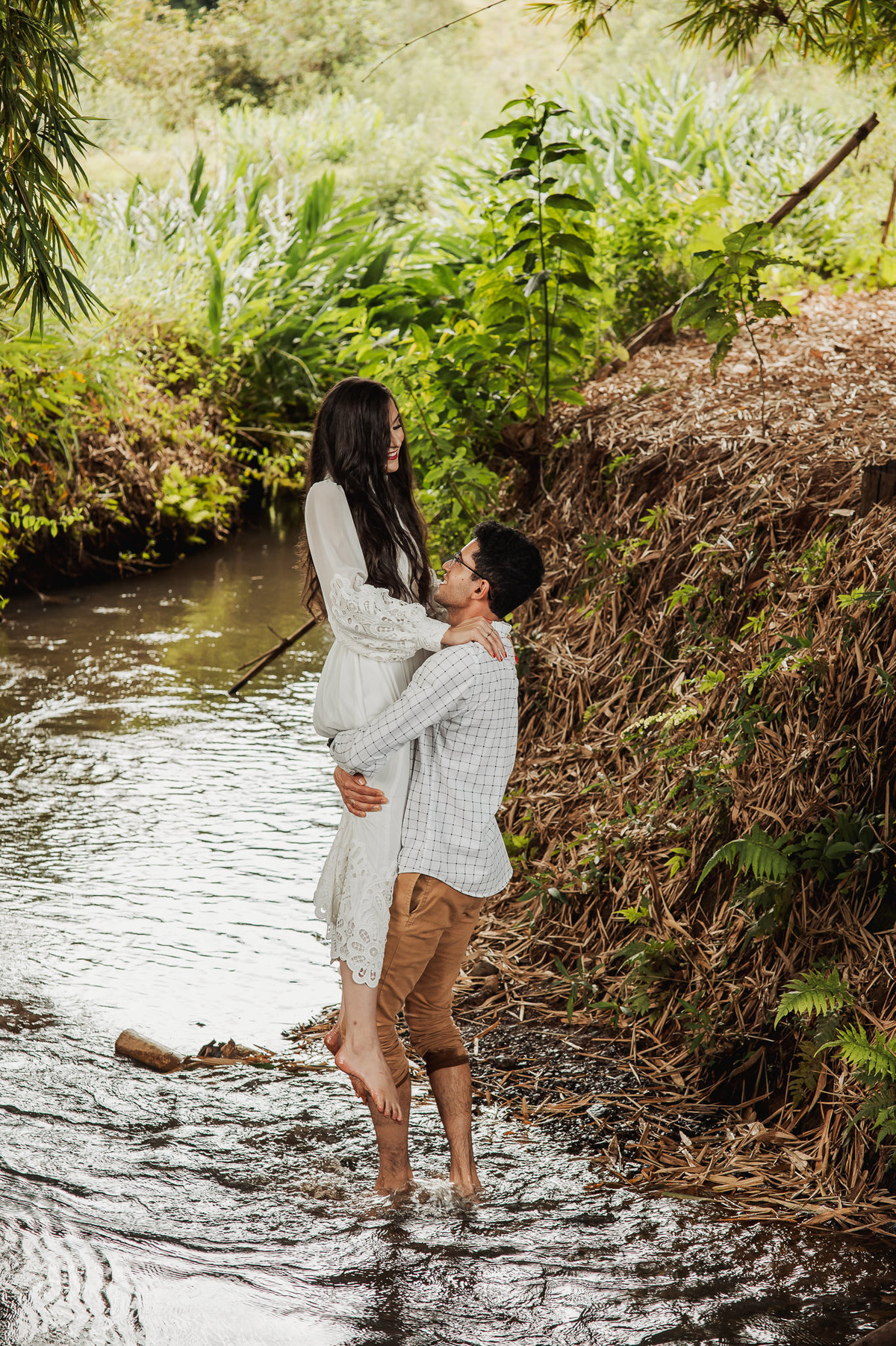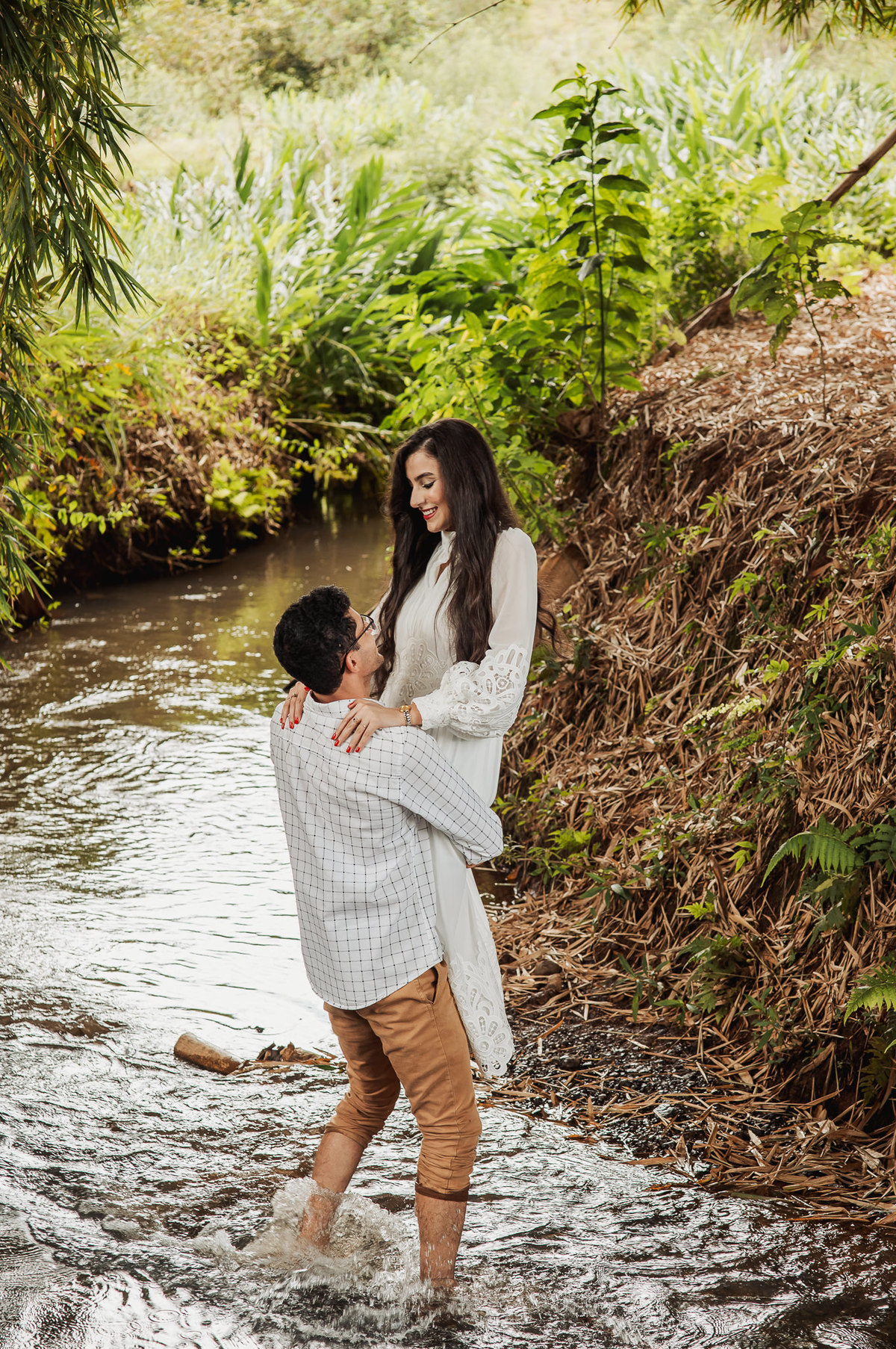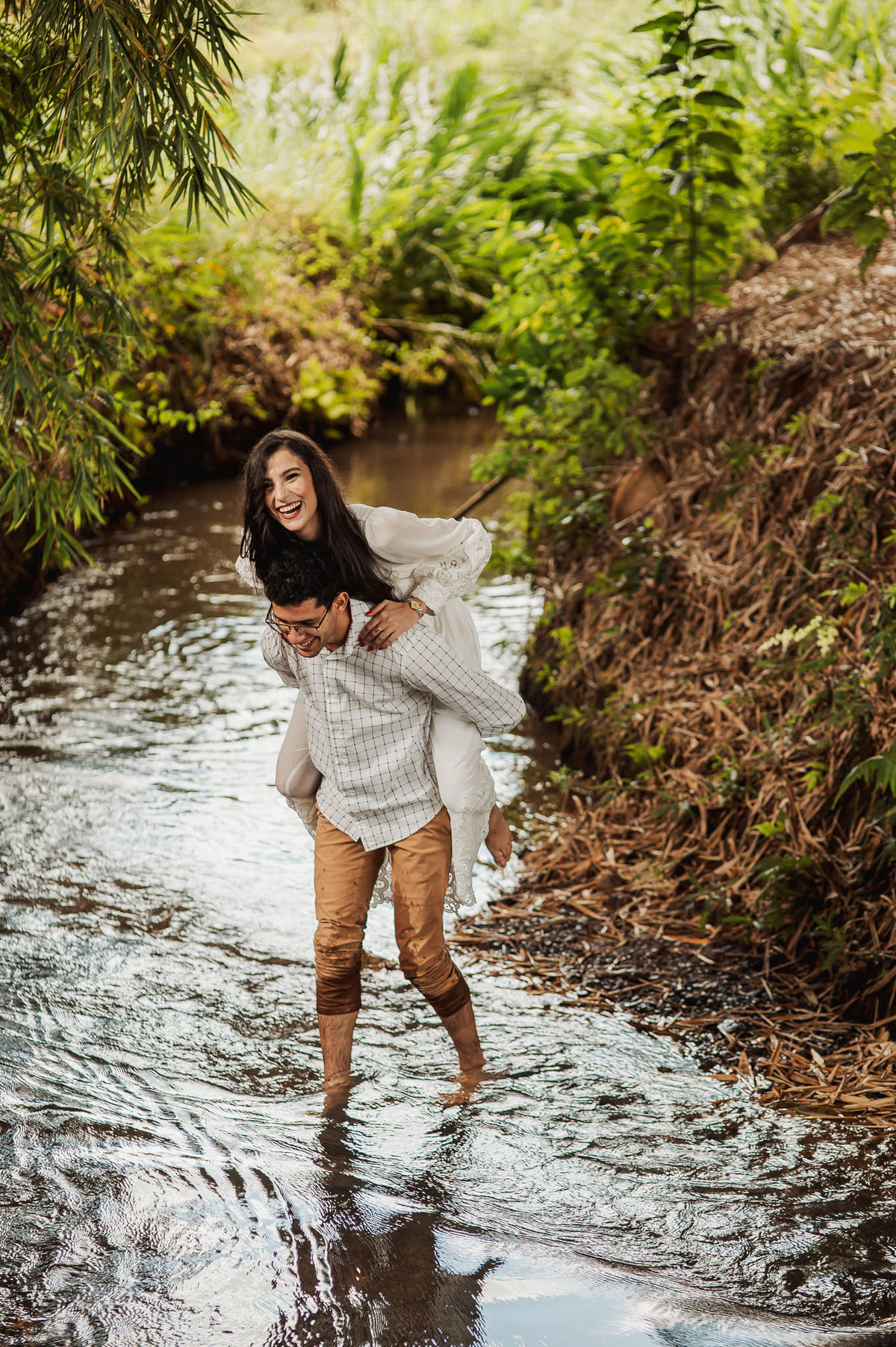 Começamos por lá registrando esse talento deles em subir nas árvores. E eles já tinham esse costume. O noivo é biólogo e a noiva sua companheira de aventuras. Depois, passamos pelo povoado de Arraial dos Afonsos, onde aproveitamos a Capela aberta para usar a estrutura como fundo das fotos. Eles fizeram questão de usar seu look temporal para casar com o envelhecido do local. Ficou lindo demais. Depois, passamos pela estrada e chegamos em um grande bambuzal. Por entre ele, passa um córrego muito simplório. Fotografamos com o bambuzal de fundo e também deles dentro do lago.