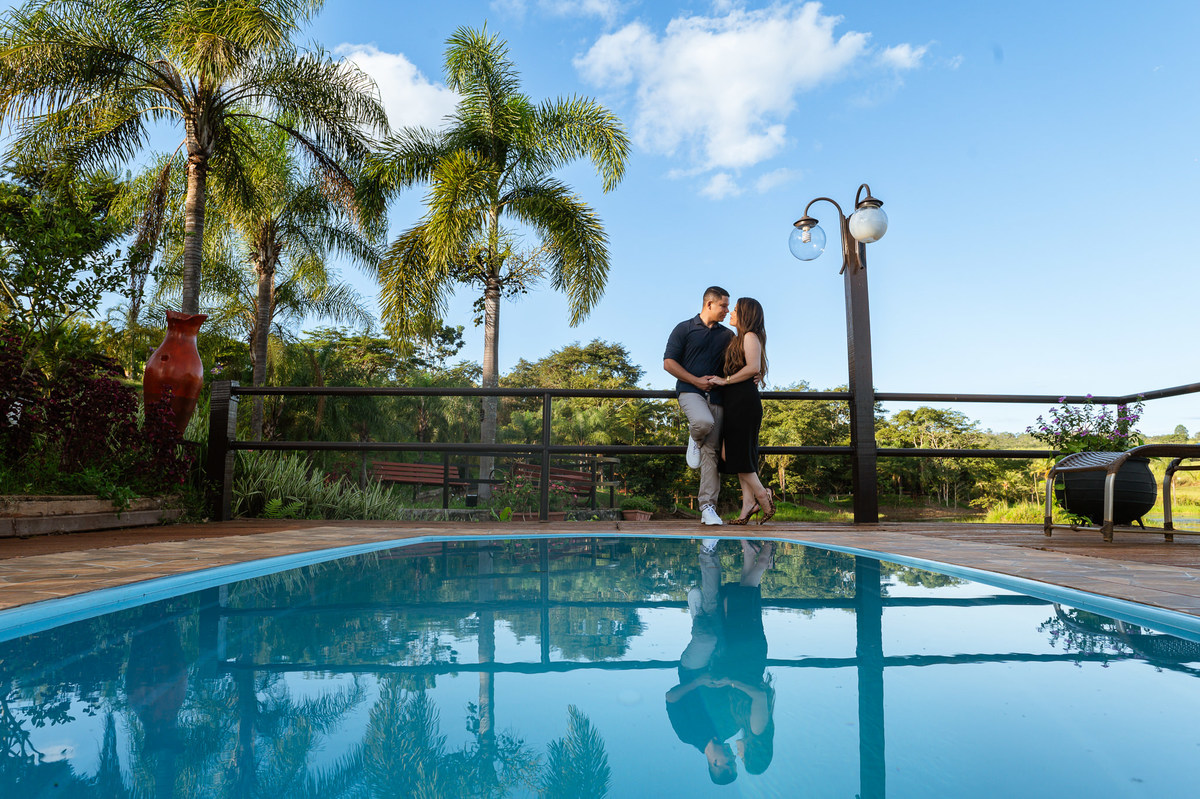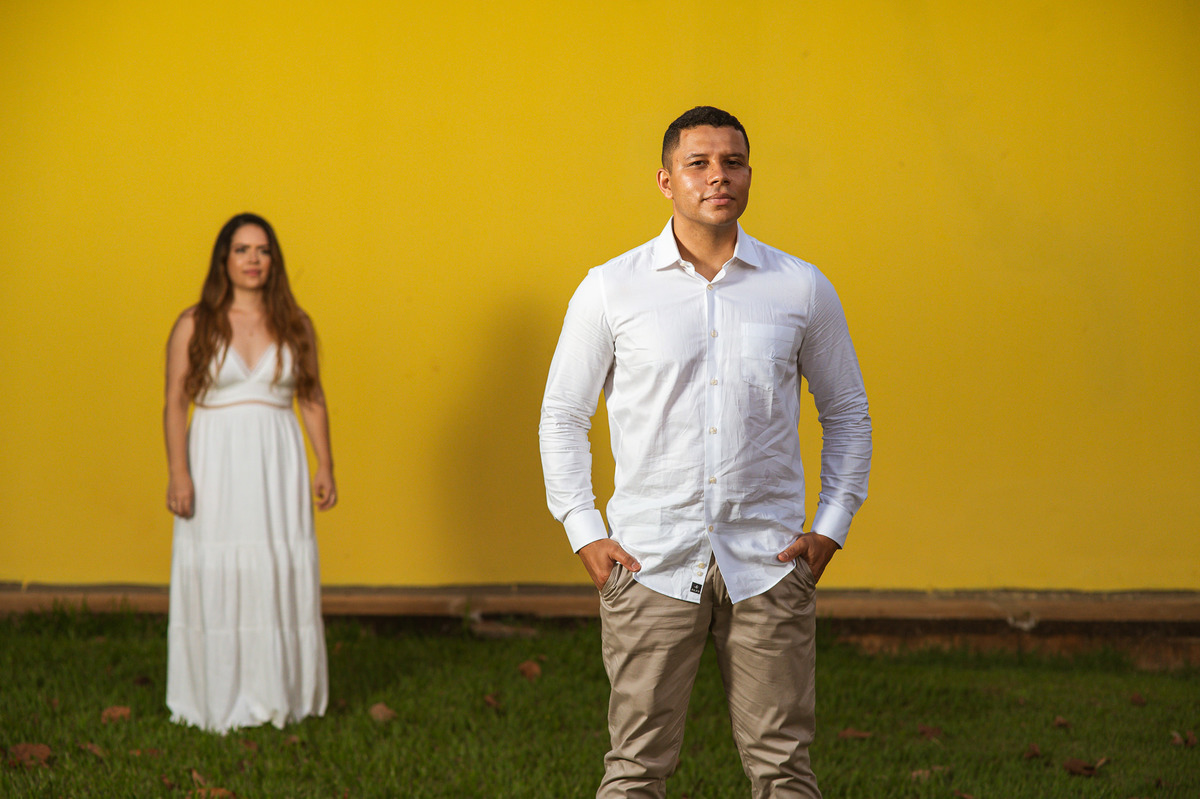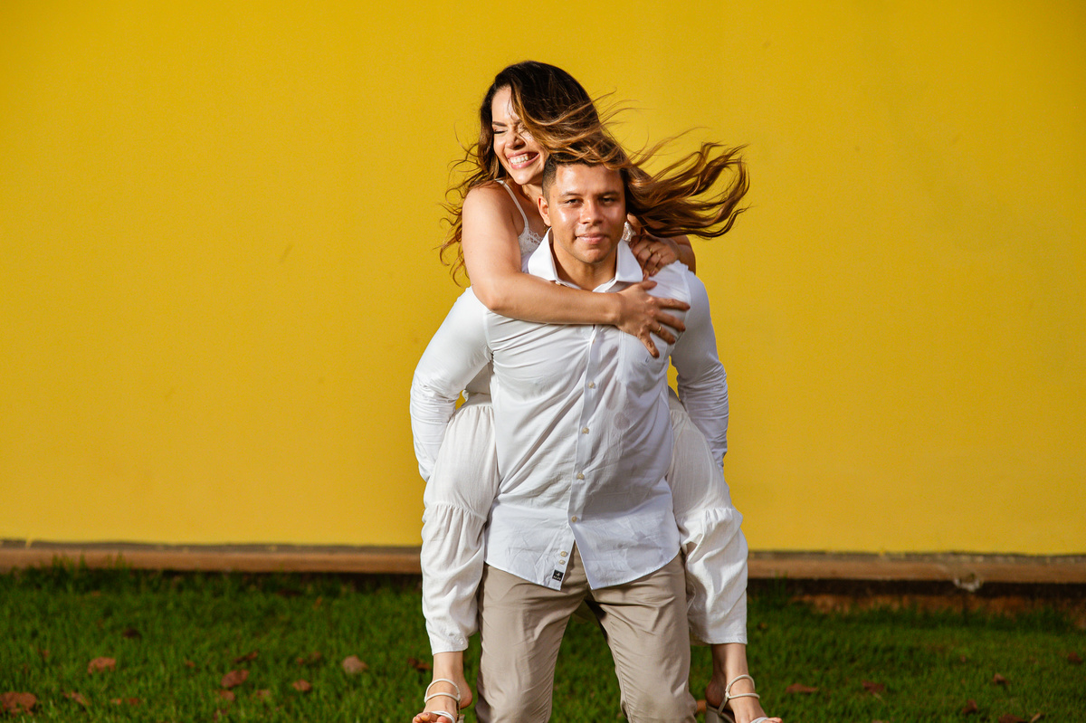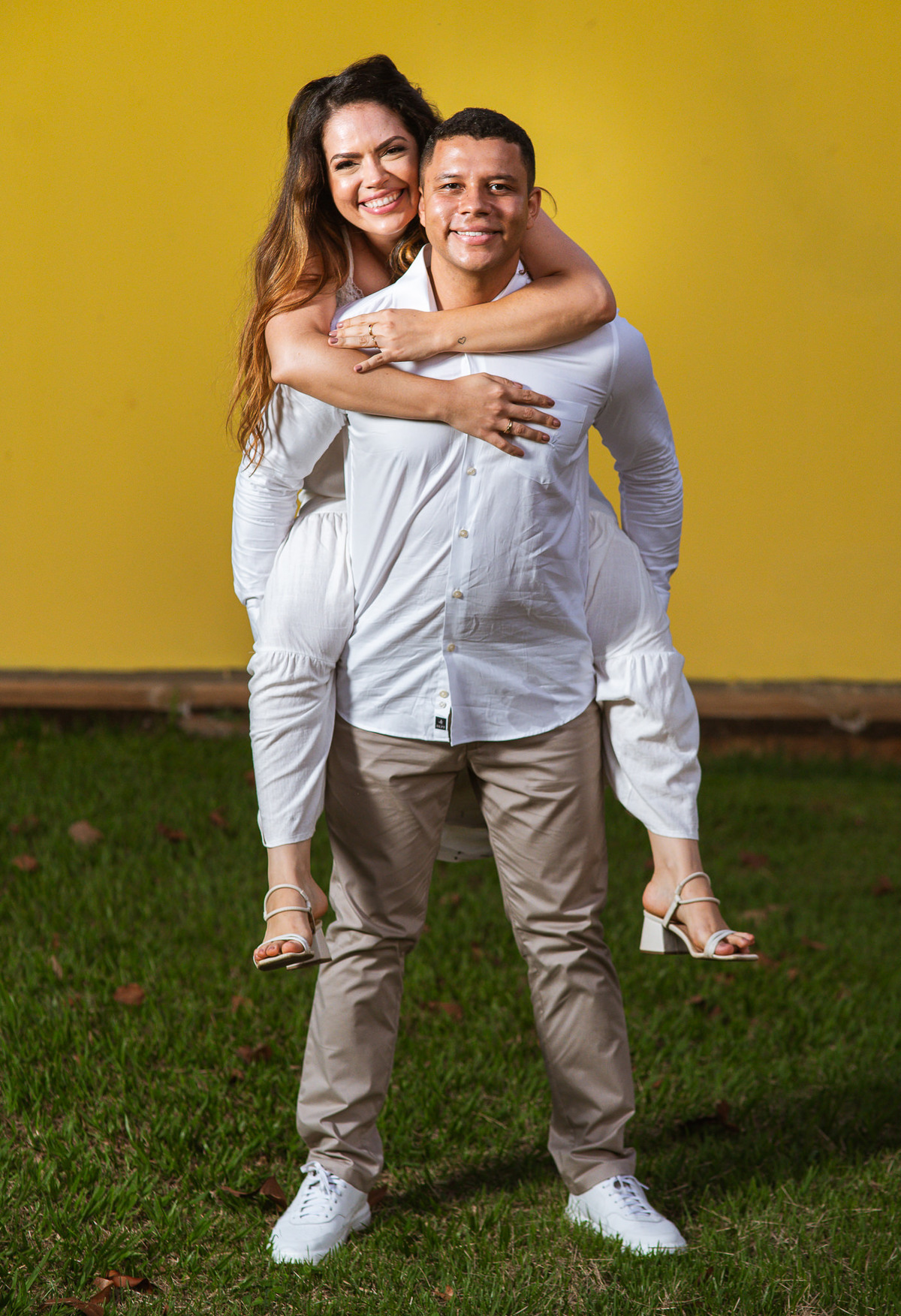 Depois desse susto, os sorrisos ficaram ainda mais soltos. Percorremos a piscina, usando o reflexo que nela existia. A cor amarela de uma parede do local sempre me chama atenção. Fizemos mais alguns cliques por lá e a tarde foi se encerrando. O pôr do sol estava daquele jeito, hipnotizante. Posicionamos o casal de forma com que conseguíssemos captar os dois e o entardecer. E pronto. Encerramos o ensaio com essa visão maravilhosa, abençoados por Deus por nos permitir mais um dia incrível de fotos. Agora, logo abaixo vocês conferem o resultado de tudo que foi dito aqui.