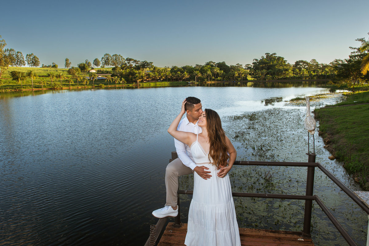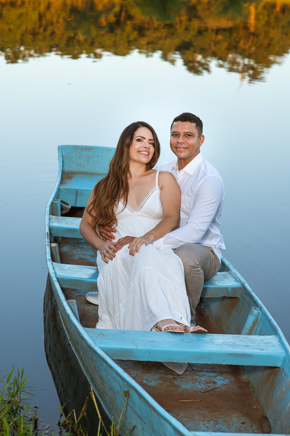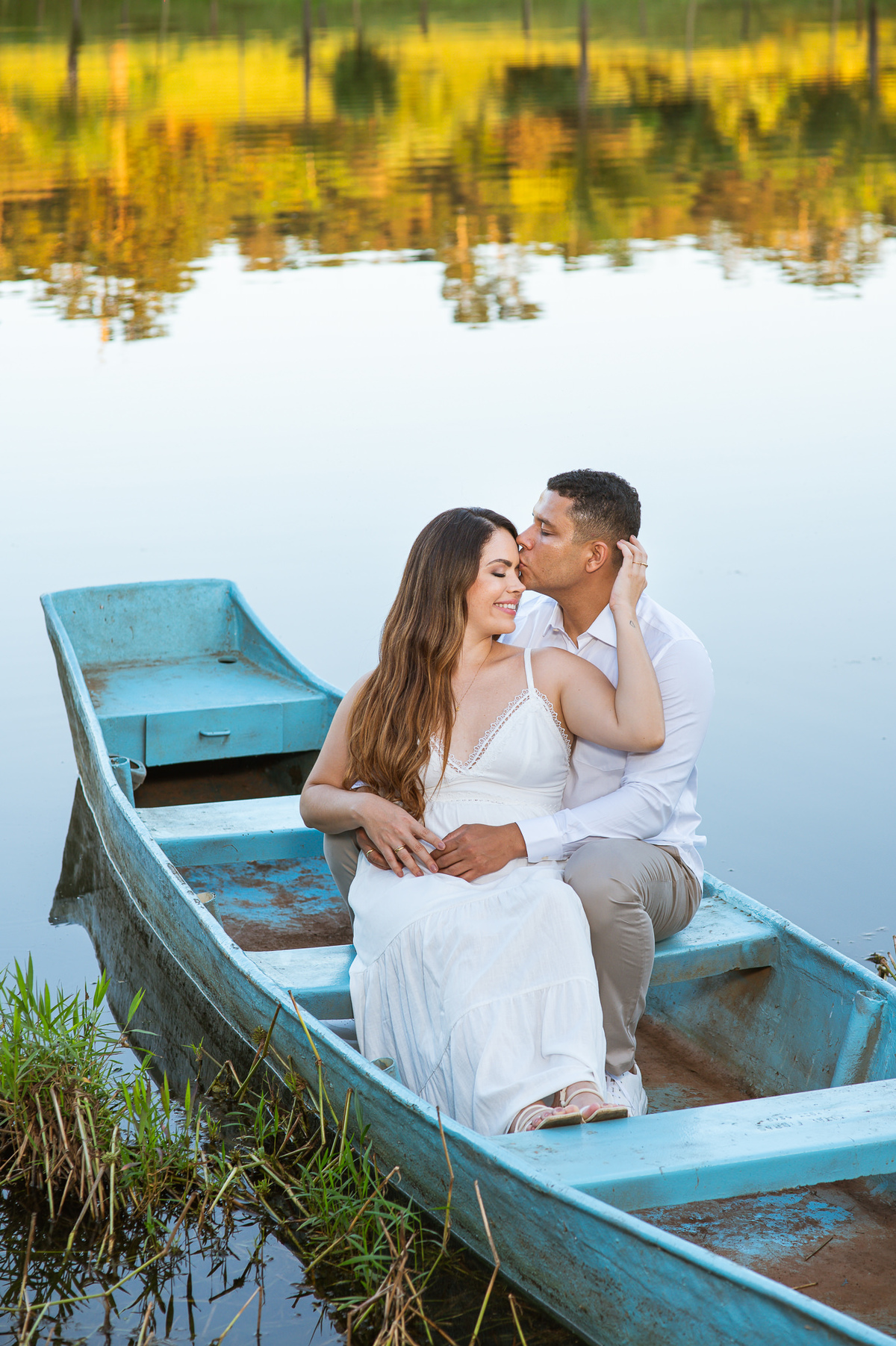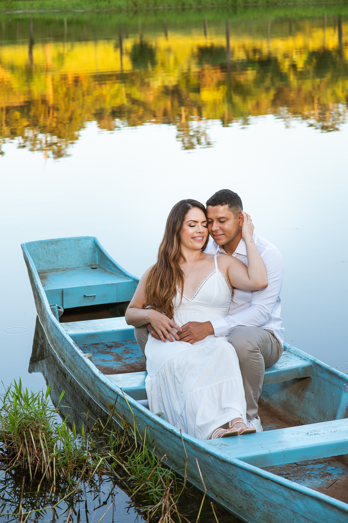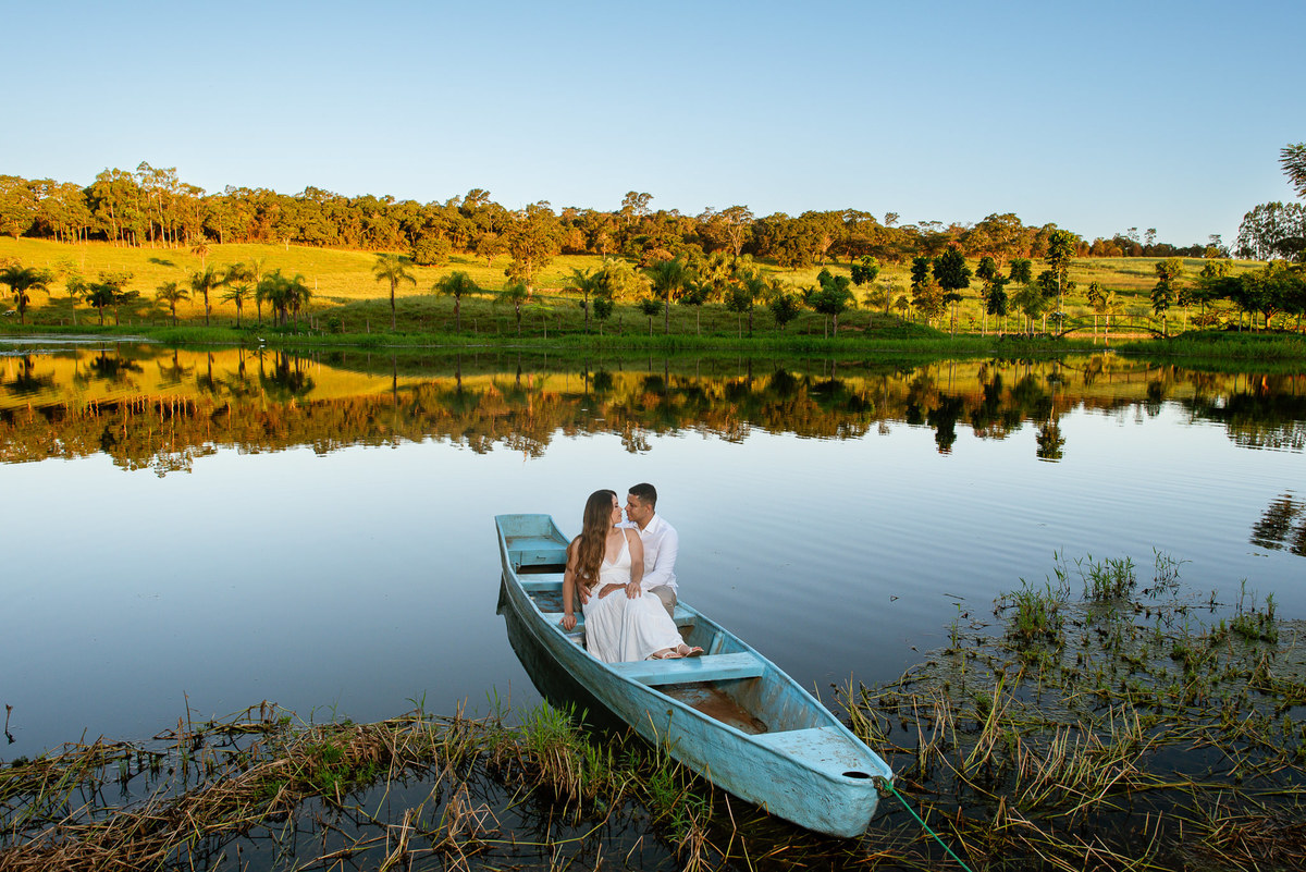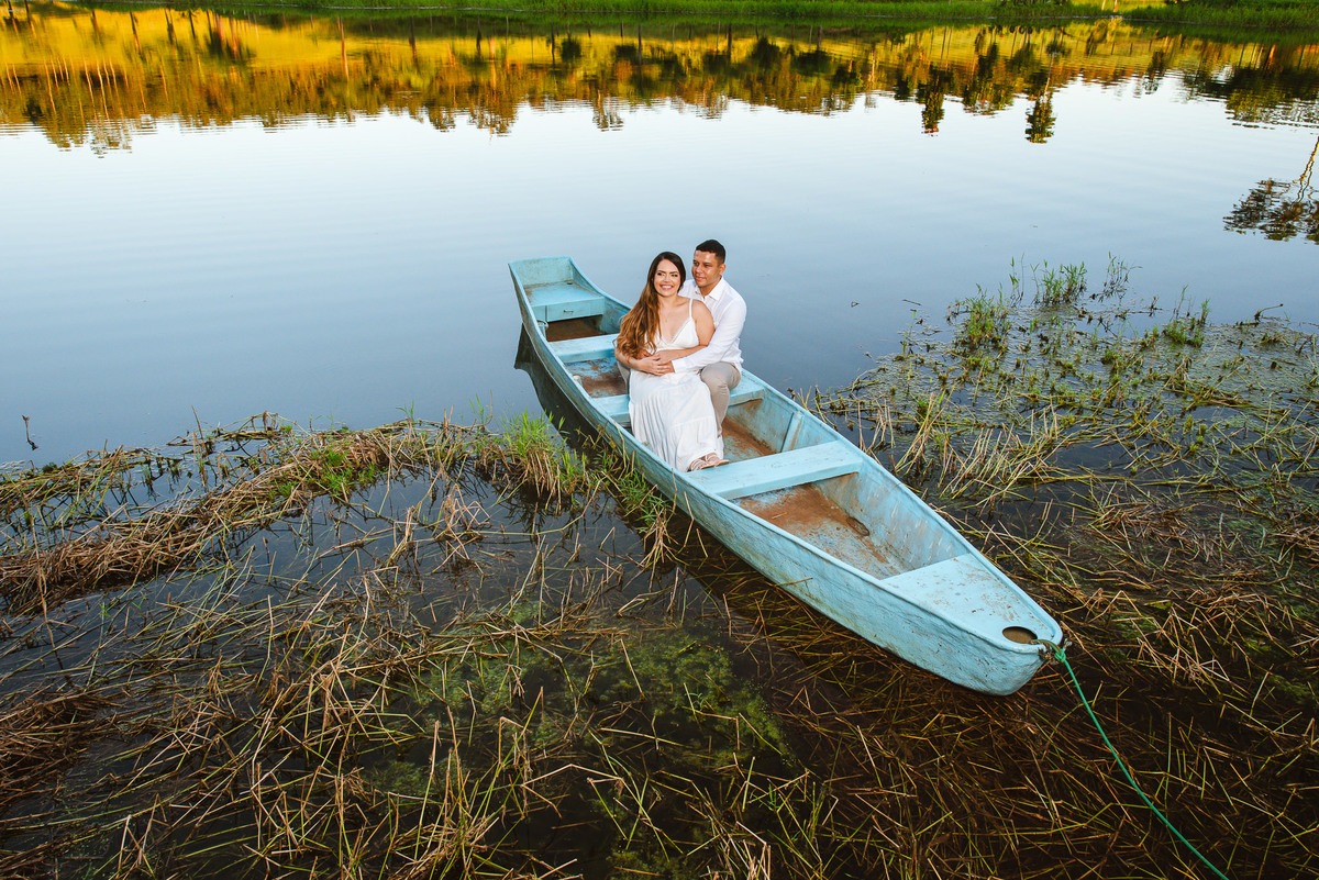Os noivos, já preparados, vieram com seus óculos de sol super descolados. E eles encaixaram super bem ao ensaio. Alguns passos a mais e chegamos numa vista maravilhosa da lagoa do local. Fizemos alguns cliques por lá, com a vista de cima antes de ficar mais próximos da sua beirada. Thaís sempre quis fazer a foto dentro do barquinho e é claro que eu não deixaria de fazê-la de forma alguma. Puxamos o barquinho pra perto, posicionamos o casal e pronto. Fizemos as fotos. Na hora de sair do barco, Thaís foi primeiro. Quando Daniel foi sair, num impulso ele por muito pouco não caiu dentro do lago. Isso faz parte, mas ainda bem que não aconteceu esse pequeno incidente.