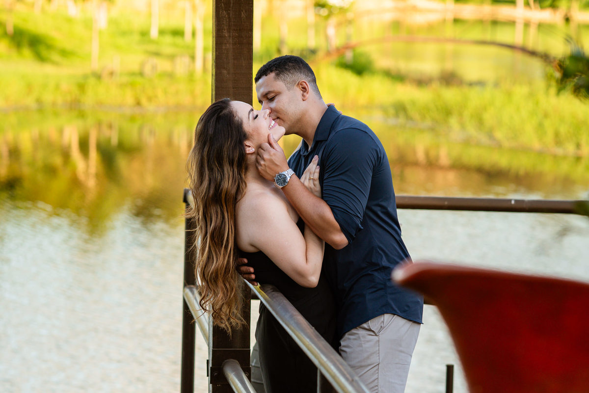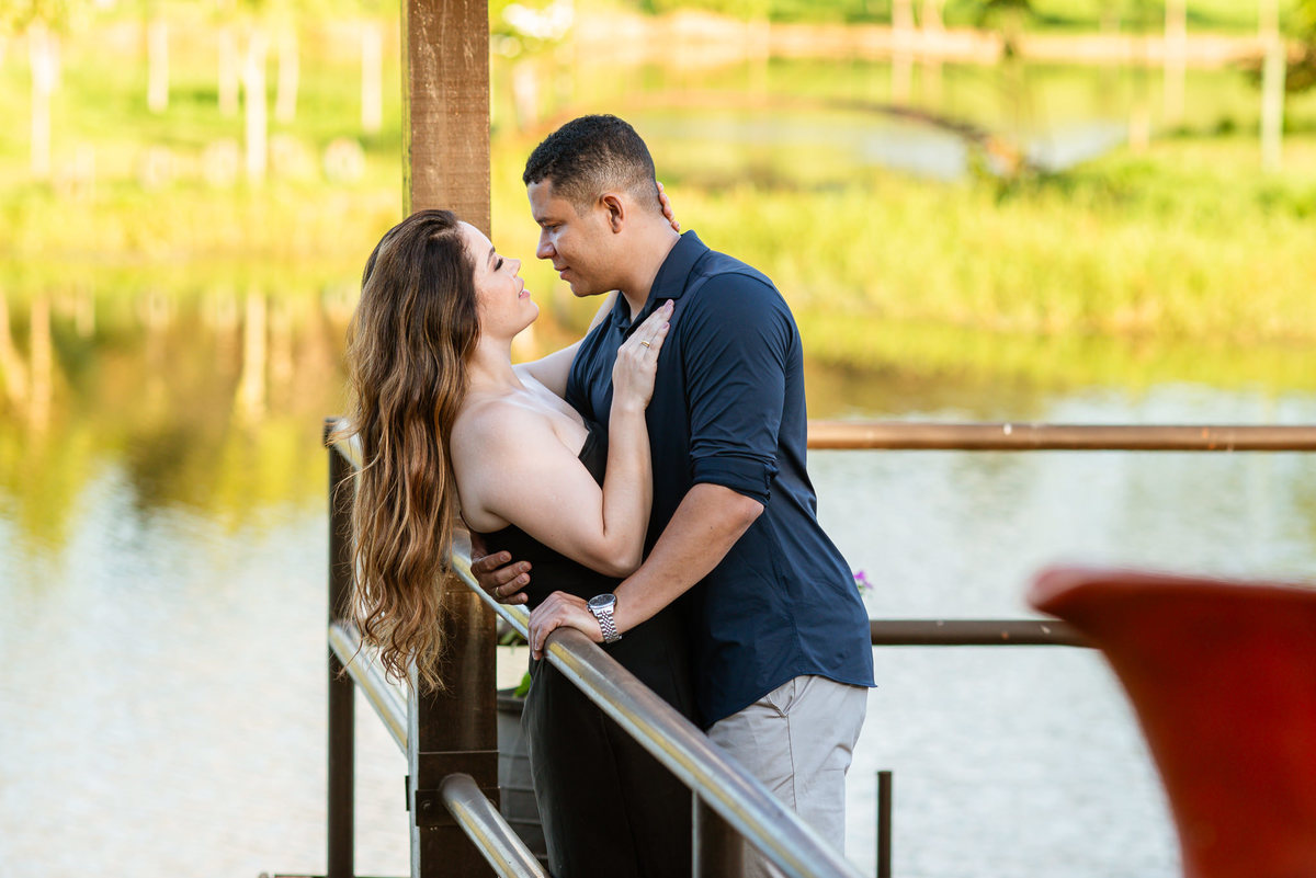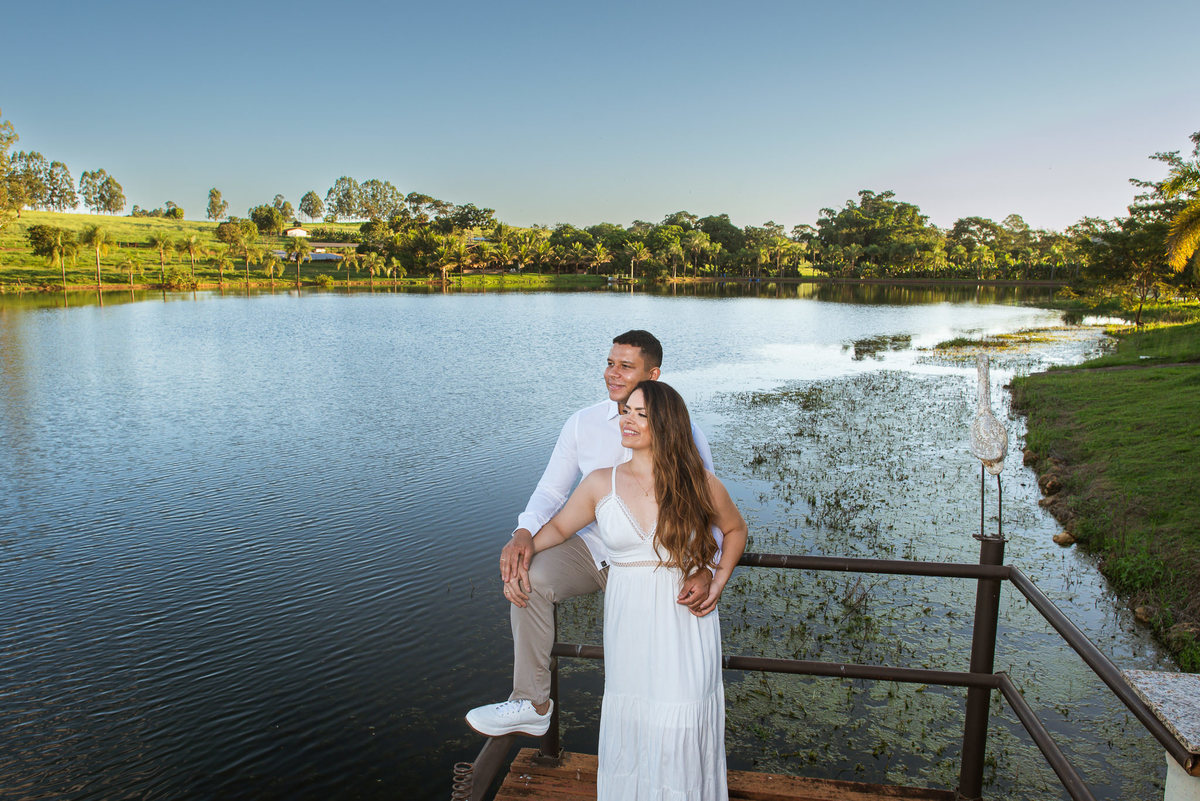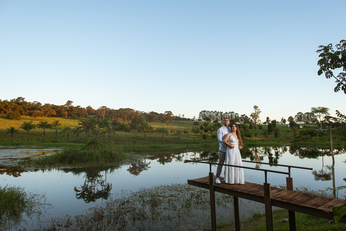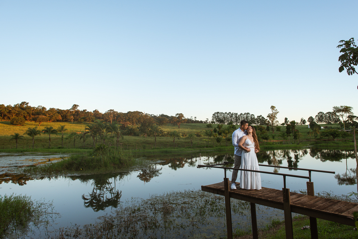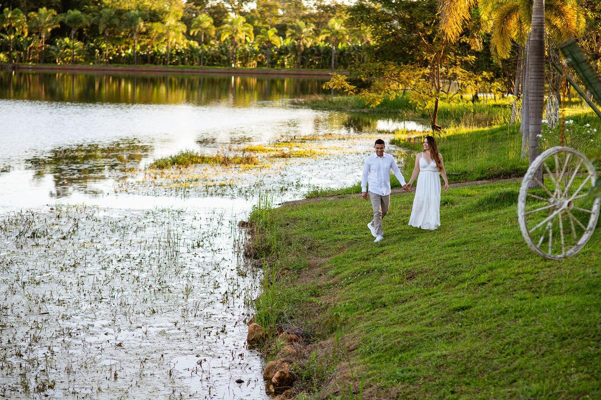 Os noivos, já preparados, vieram com seus óculos de sol super descolados. E eles encaixaram super bem ao ensaio. Alguns passos a mais e chegamos numa vista maravilhosa da lagoa do local. Fizemos alguns cliques por lá, com a vista de cima antes de ficar mais próximos da sua beirada. Thaís sempre quis fazer a foto dentro do barquinho e é claro que eu não deixaria de fazê-la de forma alguma. Puxamos o barquinho pra perto, posicionamos o casal e pronto. Fizemos as fotos. Na hora de sair do barco, Thaís foi primeiro. Quando Daniel foi sair, num impulso ele por muito pouco não caiu dentro do lago. Isso faz parte, mas ainda bem que não aconteceu esse pequeno incidente.