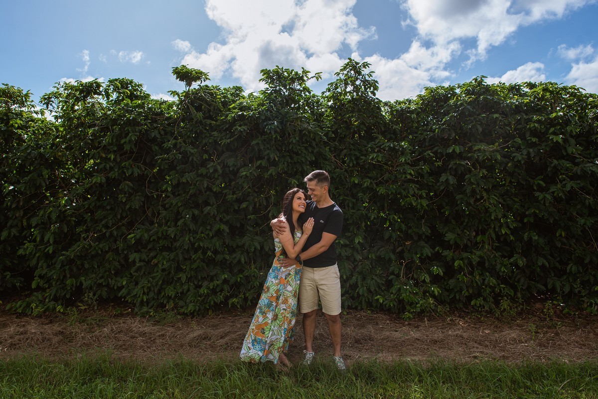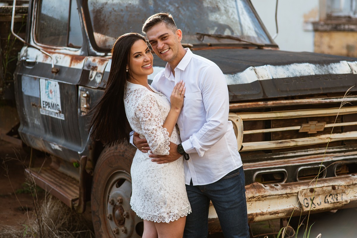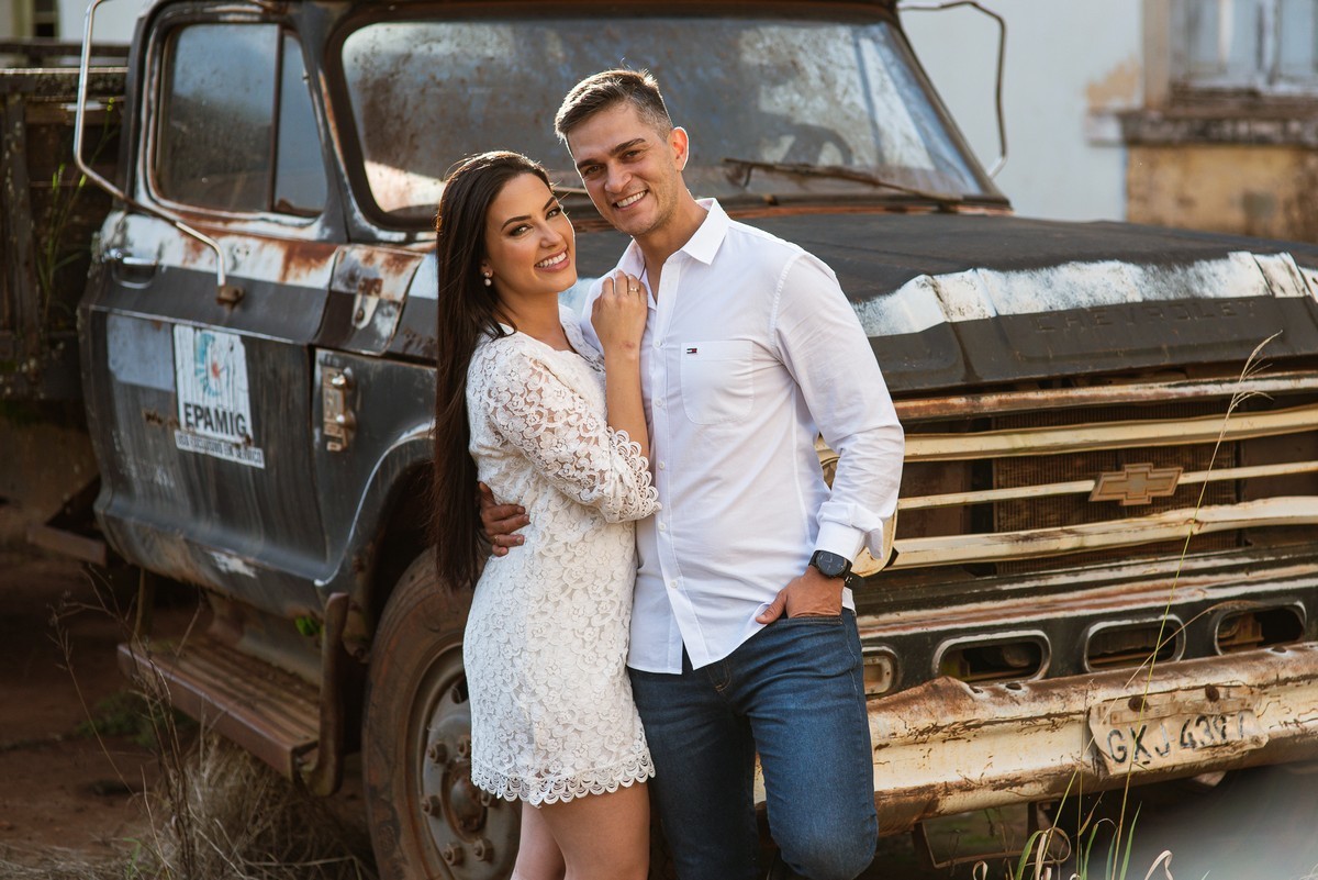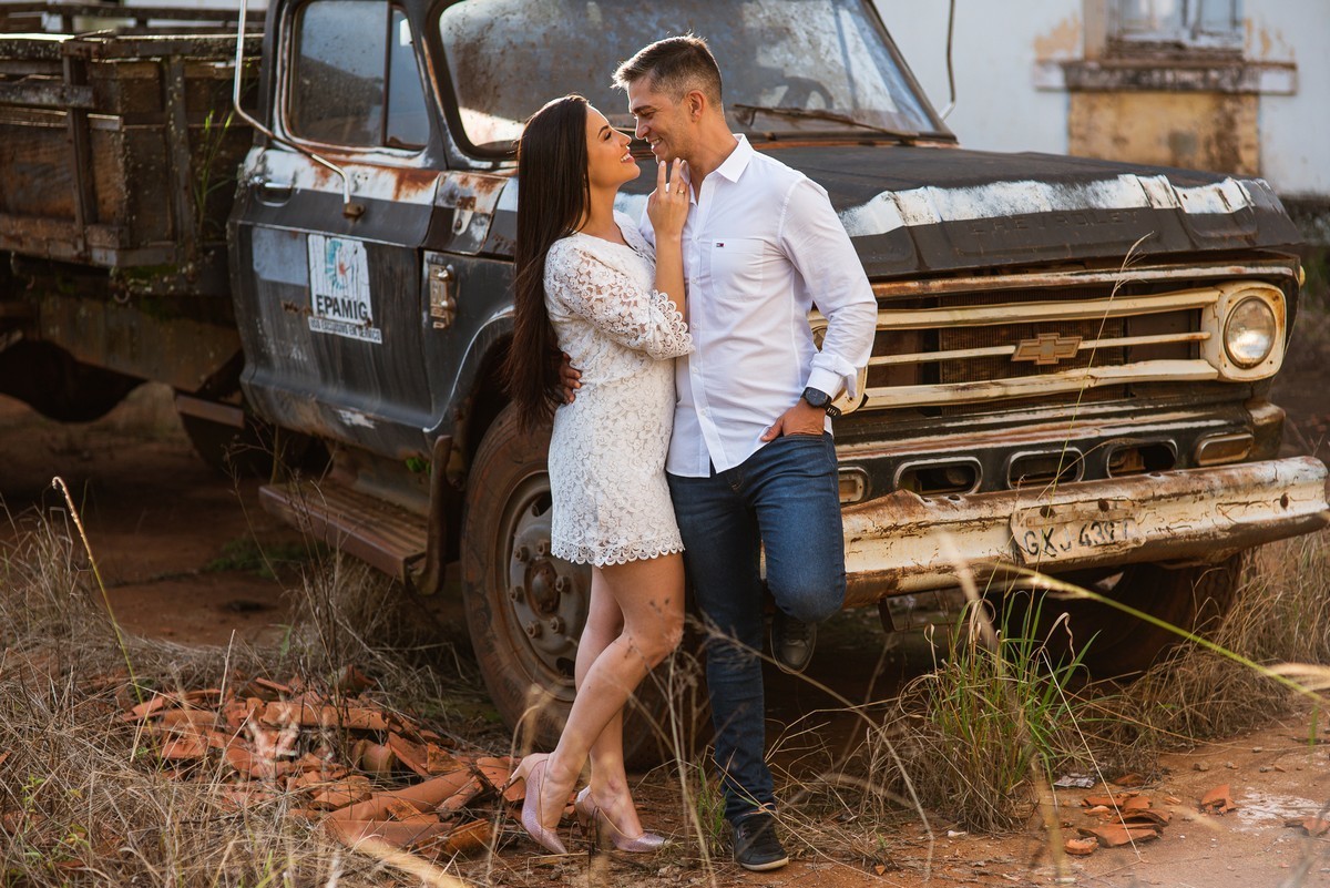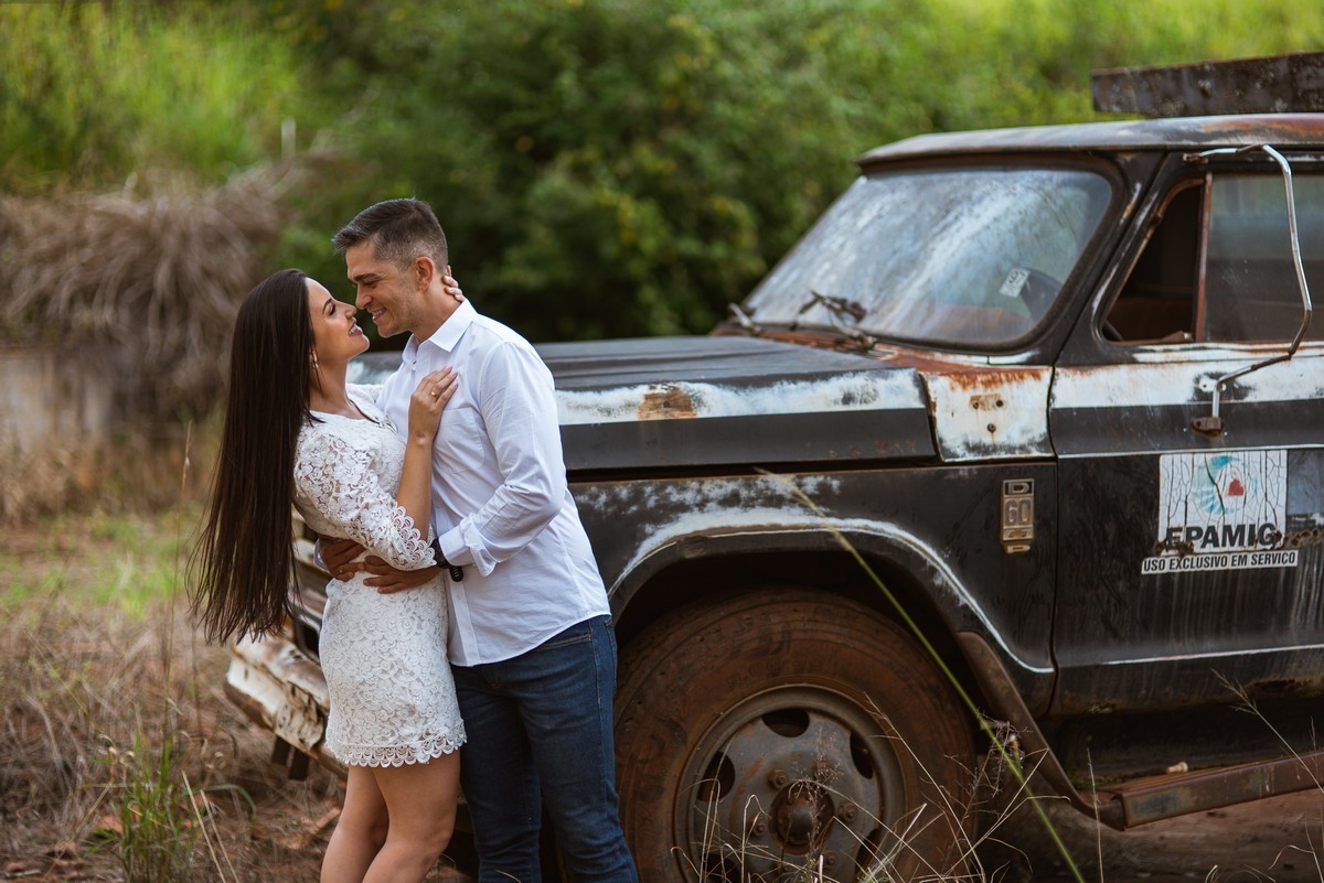A cada local que passamos fizemos alguns cliques. Não era necessário muito. Uma estrada vazia, alguns coqueiros enfileirados, uns pés de café... Era o suficiente para emoldurar o amor dos dois. Visitamos também o conhecido Sertãozinho, local bem pertinho aqui da cidade e que tem alguns locais bem charmosos. Encontramos uma árvore com flores amarelas que chamaram a atenção. Posicionando os dois por lá e pronto, a foto estava lá prontinha. Encontramos um caminhão velho (Que por sinal foi o mesmo que o meu fotógrafo usou nas minhas fotos de noivo 10 anos atrás!). Estava lá escondidinho atrás de um casarão. Deus preparou uma luz toda especial para brilhar exatamente naquele lugar, naquela hora. Ficou sensacional!
