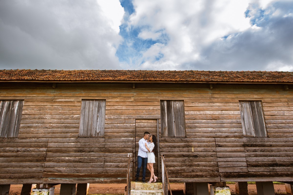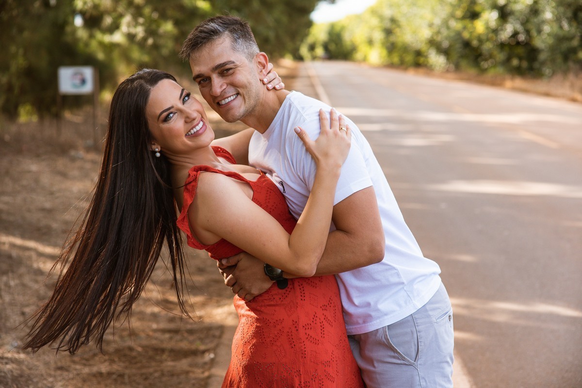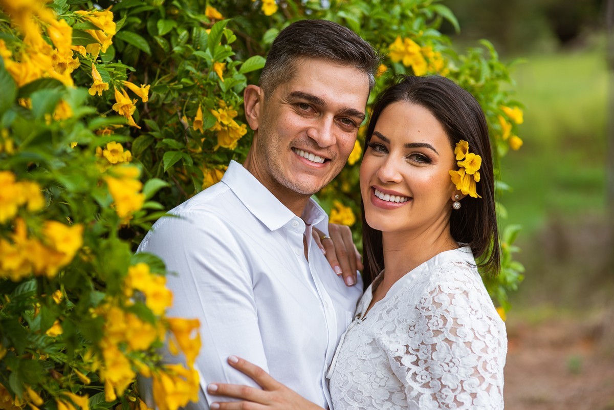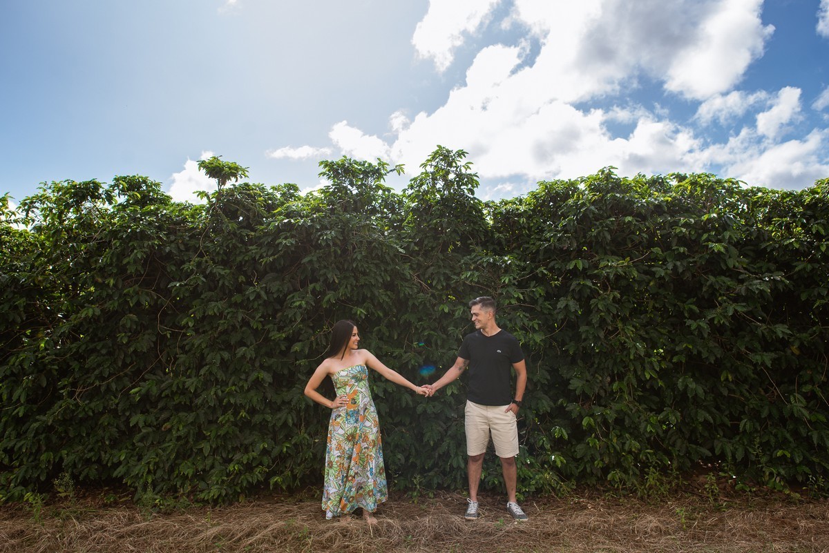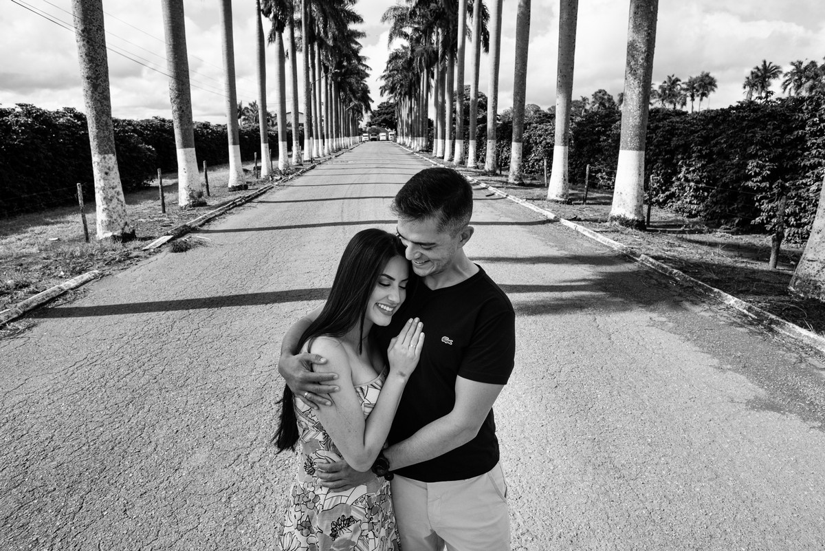 A cada local que passamos fizemos alguns cliques. Não era necessário muito. Uma estrada vazia, alguns coqueiros enfileirados, uns pés de café... Era o suficiente para emoldurar o amor dos dois. Visitamos também o conhecido Sertãozinho, local bem pertinho aqui da cidade e que tem alguns locais bem charmosos. Encontramos uma árvore com flores amarelas que chamaram a atenção. Posicionando os dois por lá e pronto, a foto estava lá prontinha. Encontramos um caminhão velho (Que por sinal foi o mesmo que o meu fotógrafo usou nas minhas fotos de noivo 10 anos atrás!). Estava lá escondidinho atrás de um casarão. Deus preparou uma luz toda especial para brilhar exatamente naquele lugar, naquela hora. Ficou sensacional!