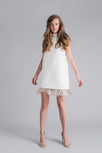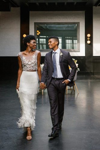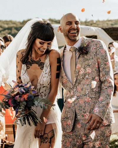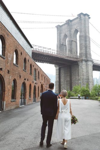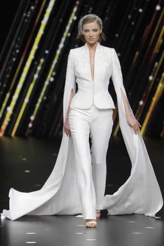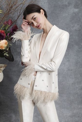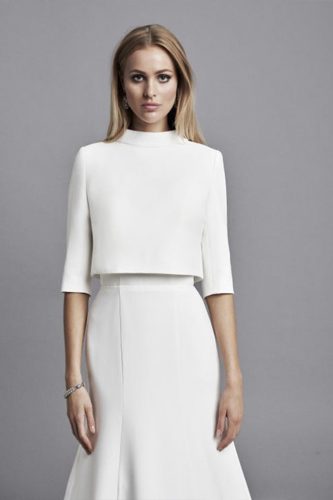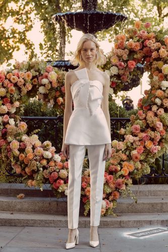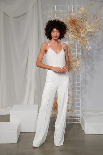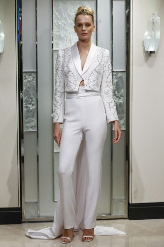 Os jumpsuits (macacões) estão em todos os lugares! Junto com os macacões vieram também os duas-peças (de top e calça ou saia) e os terninhos, com isso os blazers estão de volta. Acompanhando essa onda, os duas-peças coordenadas chegaram como opção para as noivas.