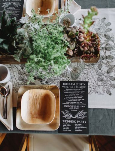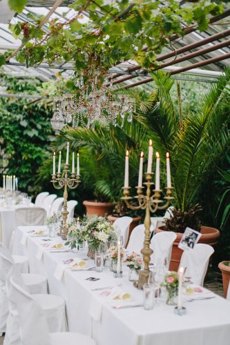 Os noivos estão optando por configurações de mesas de convidados mais artísticas, ao invés de várias mesas redondas ou uma mesa comunitária. Mesas sinuosas – várias mesas retangulares juntas para criar um design – adicionam um elemento extra às configurações de recepção, como por exemplo formando um X.
