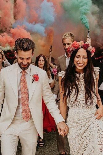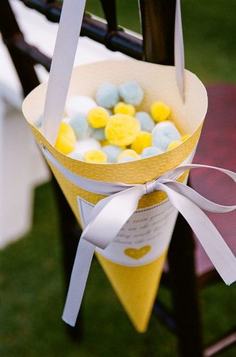 Os bastões com fitas, serpentinas metalizadas e os mini pompons são um dos nossos favoritos. As bolhas de sabão continuam sendo uma alternativa de confete, mas estamos apaixonadas pelas bombas de fumaça sendo usadas para esse fim, já podemos ver essa tendência no mini wedding boho da Daniela e do Rafael, que publicamos faz pouco tempo.
