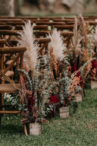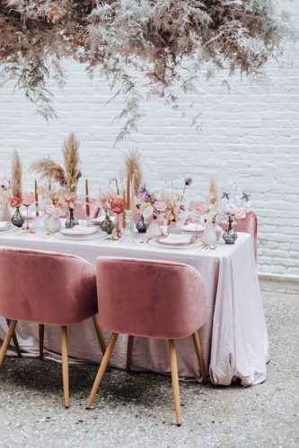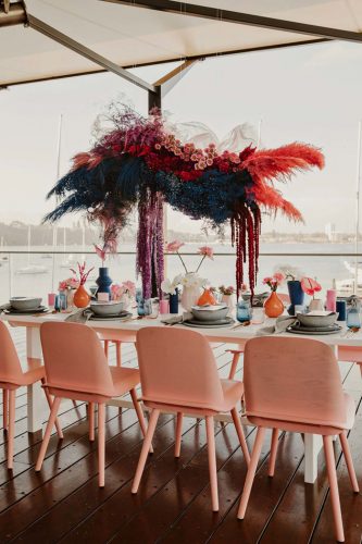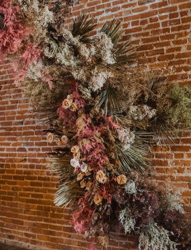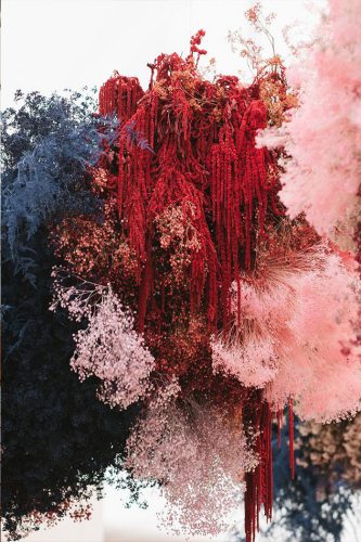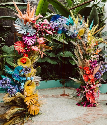 O Greenery ainda mora em nossos corações, mas a tendência de decoração de casamento deste ano está passando por uma transformação colorida. Folhagens, galhos, flores e ervas secas estão sendo pintadas com spray. Você lembra da Home do Lápis na última Casar.com? Nós já tínhamos uma parede toda de capim dos pampas pintados em tons de rosa. Os últimos editorias que publicamos no blog também tem decoração com spray, dá só uma olhada nessas belezuras. Toda essa vegetação pintada adiciona textura e pontos de cores não naturais (neon, pastéis foscos e metalizados) aos arranjos e buquês de noiva.