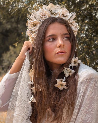 A coroa de flores veio para ficar- mas está sempre sendo reinventada e nesse ano elas tem o volume no alto da cabeça.