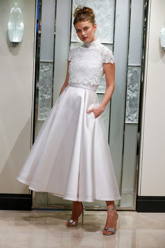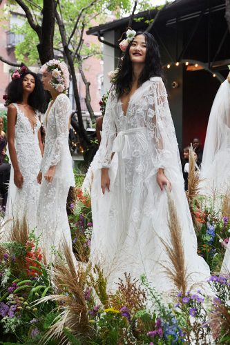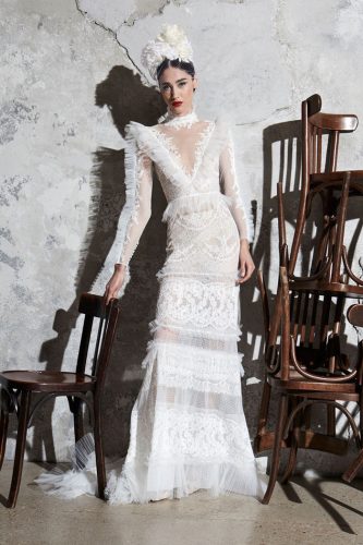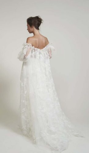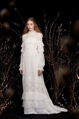 O próximo ano vai nos levar à momentos de muita delicadeza, feminilidade e fluidez. A tendência de vestidos de noivas com forro em tons pastéis vai continuar. As rendas de bilro e bordados geométricos estarão presentes na maioria dos modelos, que terão em sua construção saias em seda, em otomani e até mesmo em organzas em saias esvoaçantes e com muito movimento.