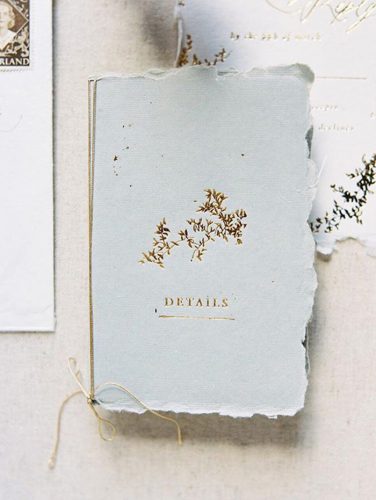 Os convites de casamento são ótimos para explorar texturas: acrílico liso; texto em alto ou baixo relevo, pergaminho grosso e áspero; detalhes metálicos; papel prensado com flores e muito mais. Entregá-los em uma caixa em vez de em um envelope adiciona outra camada à experiência do convite.