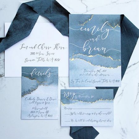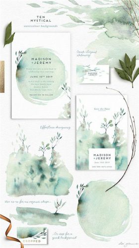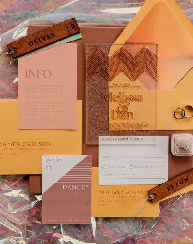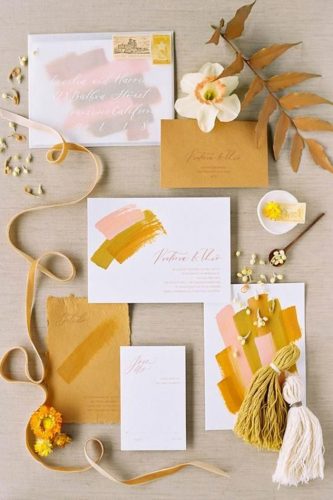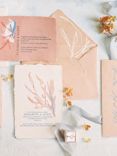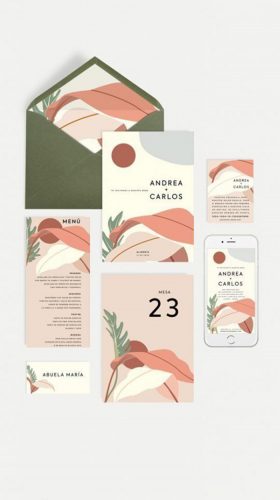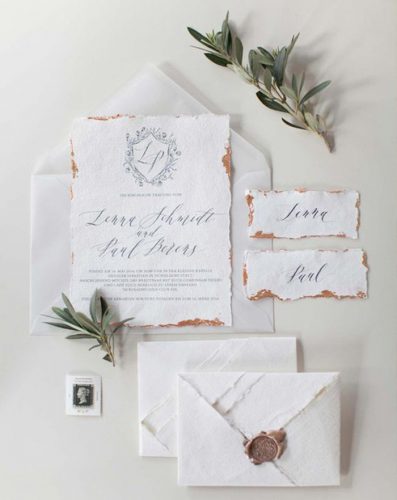 Outros detalhes que estarão nos convites são as impressões metálicas (rosé, ouro, prata, cobre), as estampas geométricas, os envelopes forrados e estampados na parte interna e a nova aquarela: do ombré aos tons de pedras preciosas, a aquarela se renovou e vamos ver muitos convites feitos com “manchas orgânicas”.