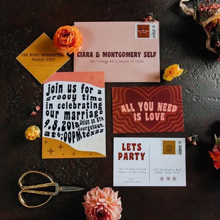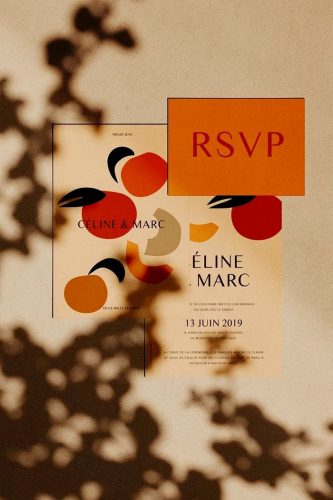 Como os casamentos urbanos estarão em alta, assim como os temas coloridos, nada mais natural que os convites sejam os primeiros a dar o tom da cerimônia. Vamos ver muitos convites com design moderno e com forte pegada artística e contemporânea, com fontes ousadas e modernas, linhas limpas e uma variedade de cores complementares. As cores vão dos tons terrosos ao neon, passando por tons escuros como roxos e preto, sem existe restrição ao uso de cor.